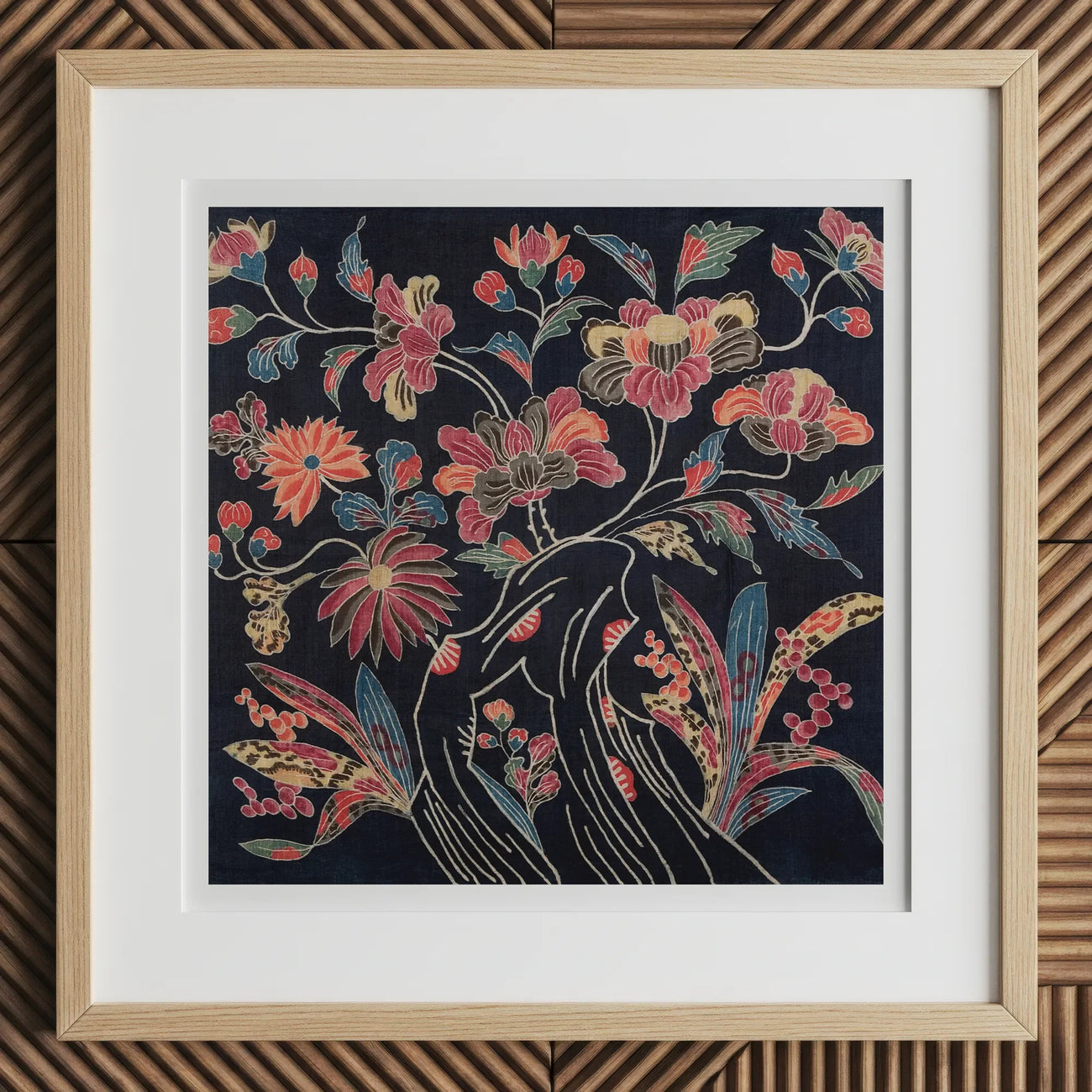 Immerse yourself in the enchanting world of Okinawan textile artistry with this mesmerizing Wrapping Cloth (Uchikui) Art Print. Witness the harmonious fusion of mainland Japanese motifs and Okinawan craftsmanship, a testament to centuries of maritime trade and cultural exchange. Your eyes will dance across the intricate embroidery leaves, each stitch telling a story of meticulous skill and artistic passion.