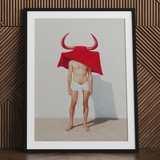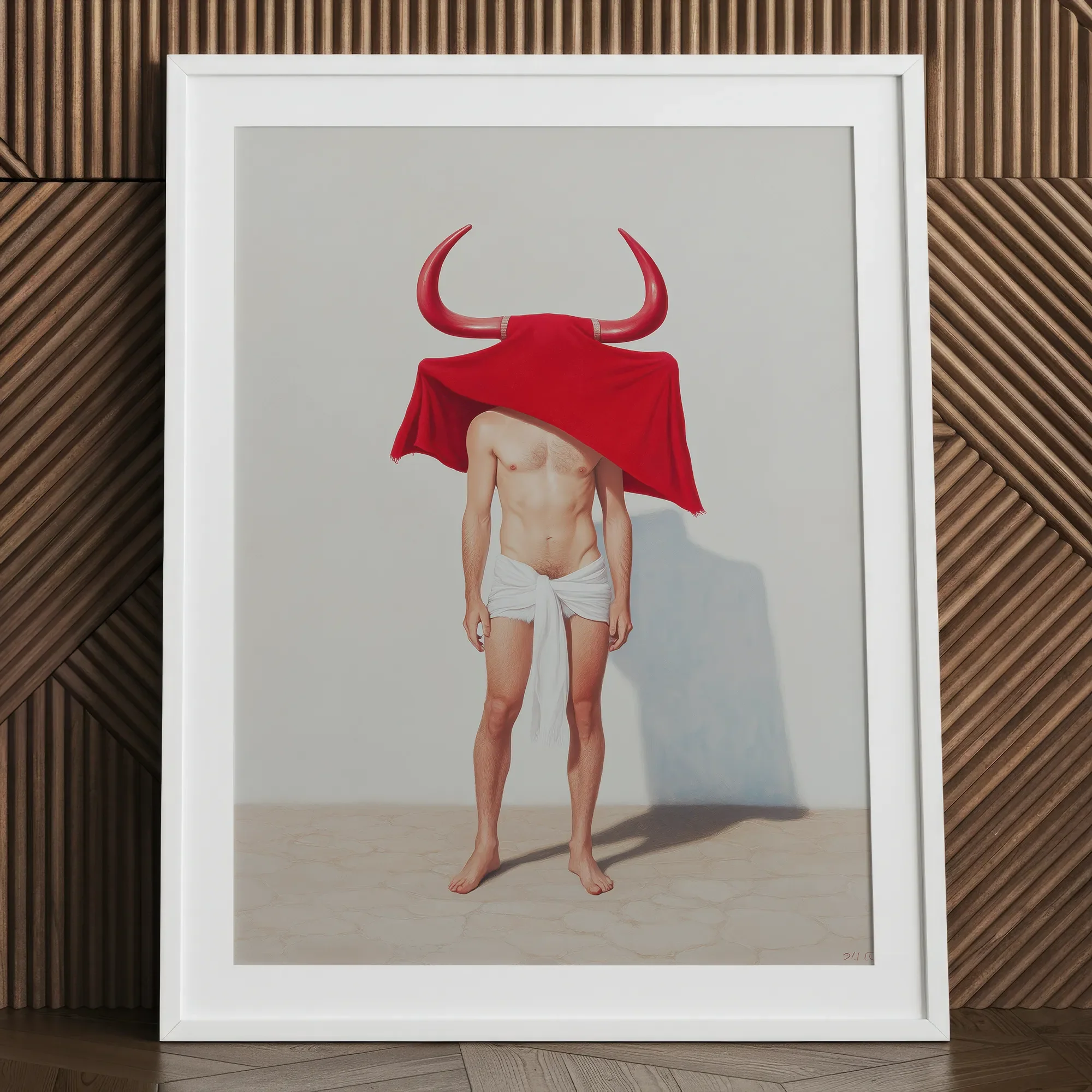 Get spiked with a gay matador's horny essence, stripped bare of pretense. This lowbrow painting thrusts you into a world where bullfighter art meets surrealism, challenging notions of strength and vulnerability. The muscular figure, draped only in a white loincloth, stands defiant beneath a vibrant red cape morphed into menacing horns.