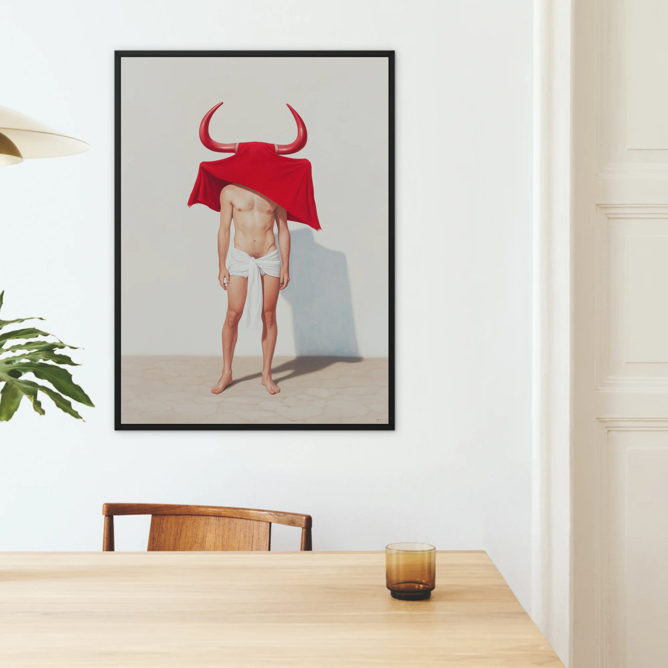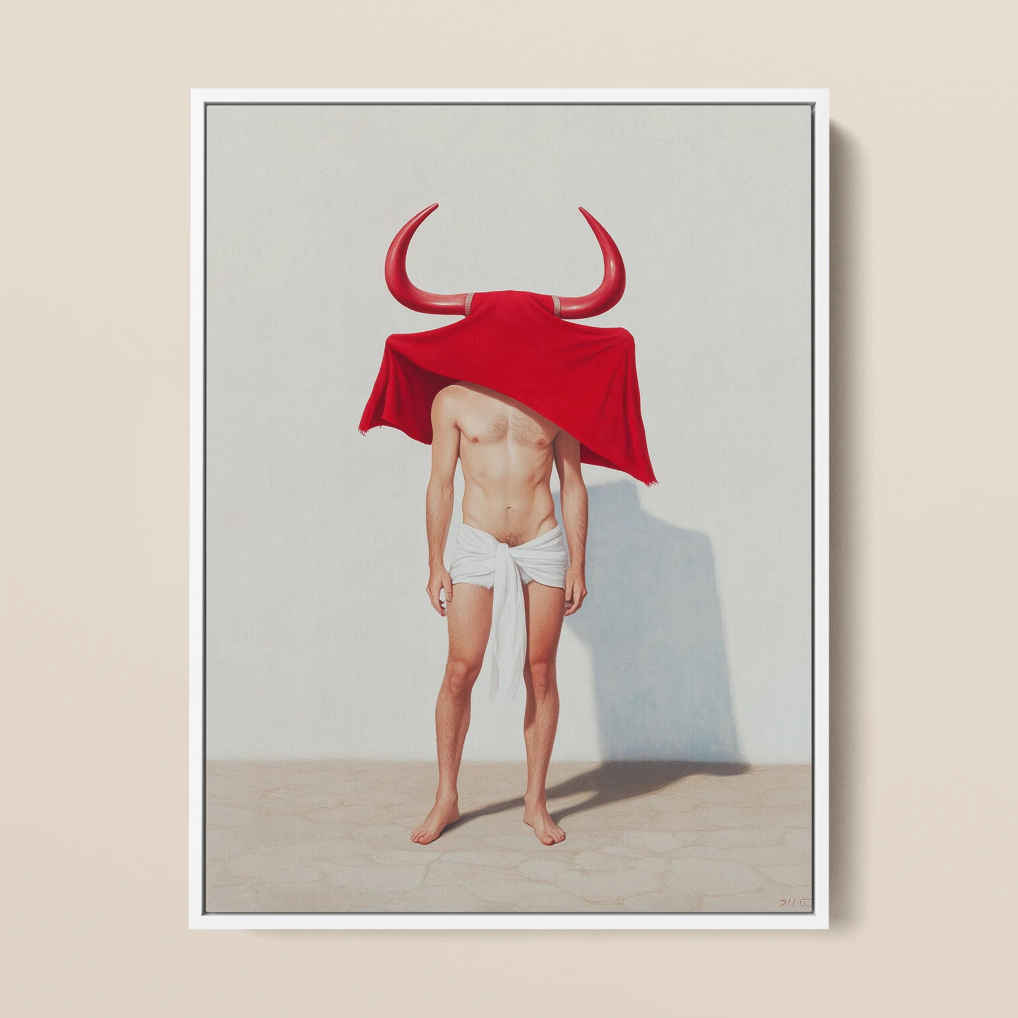 This hyperrealist gay bullfighter painting pulsates with tension: the hombros desnudos, the taut loincloth recalling Greco-Roman sensuality, the shadow stretching long like a corrida’s final moment. Here, queer Spanish art does not merely decorate—it transforms the torero into a figure of duality: erotic yet untouchable, powerful yet surrendering. A minimalist surrealist portrait brimming with flesh, heat, and rebellion.