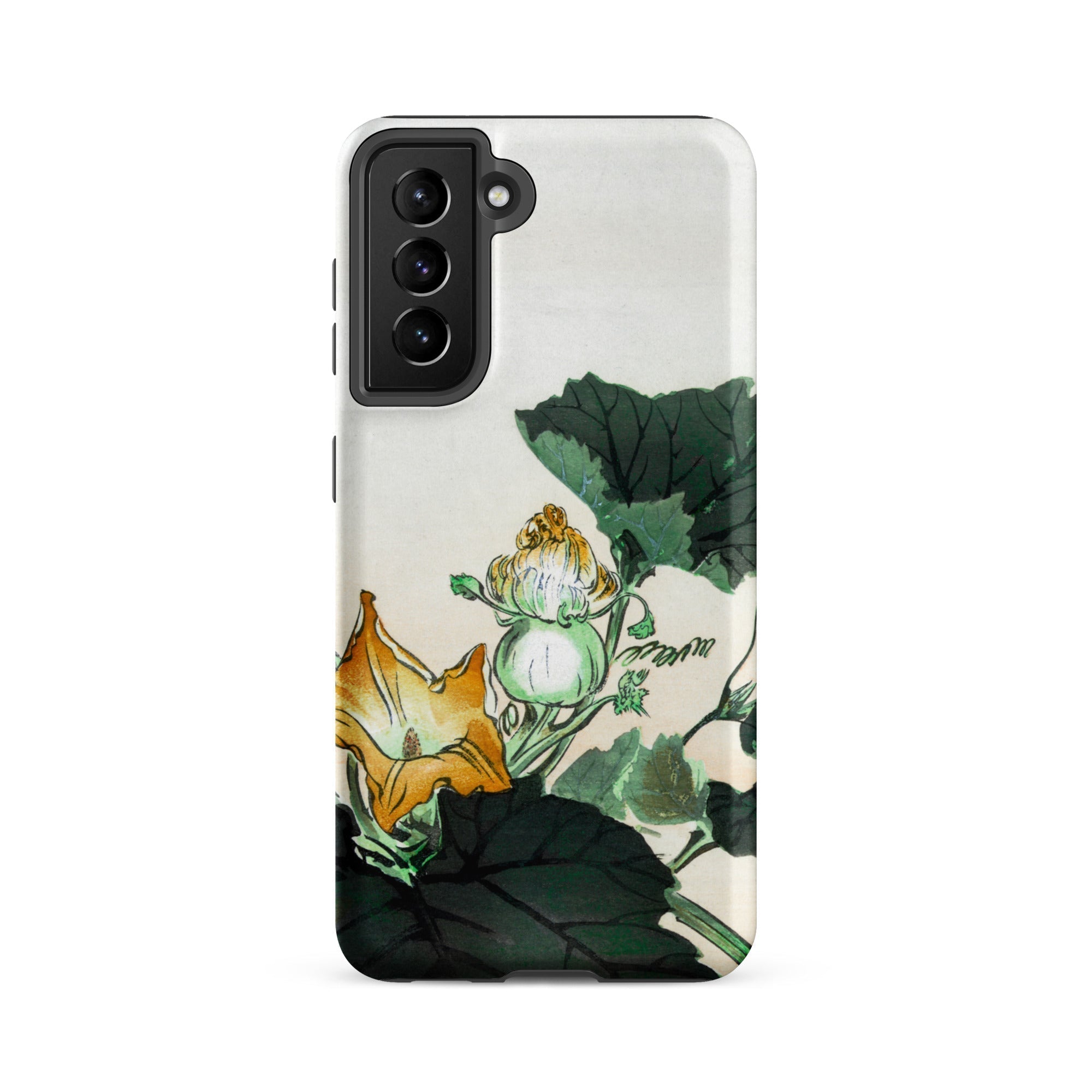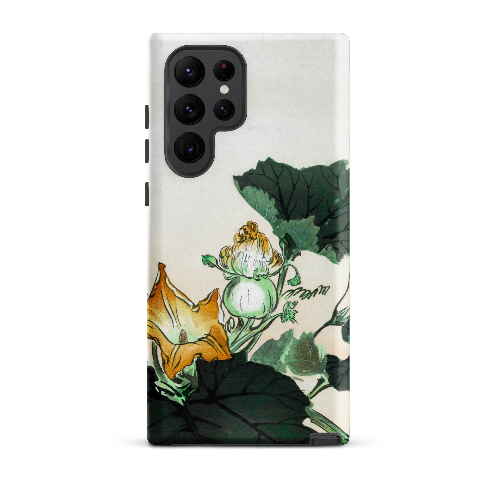 Adorn your phone with a mesmerizing slice of Ukiyo-e artistry. Ogata Gekko's Kabocha Ni Tonbou will transform your device into a canvas of delicate beauty. The creamy backdrop showcases a vibrant yellow squash blossom, its petals unfurling with sun-kissed warmth. Emerald leaves spread their veiny fingers, framing the golden bloom. A hint of a jade-hued gourd peeks out, promising future harvests.