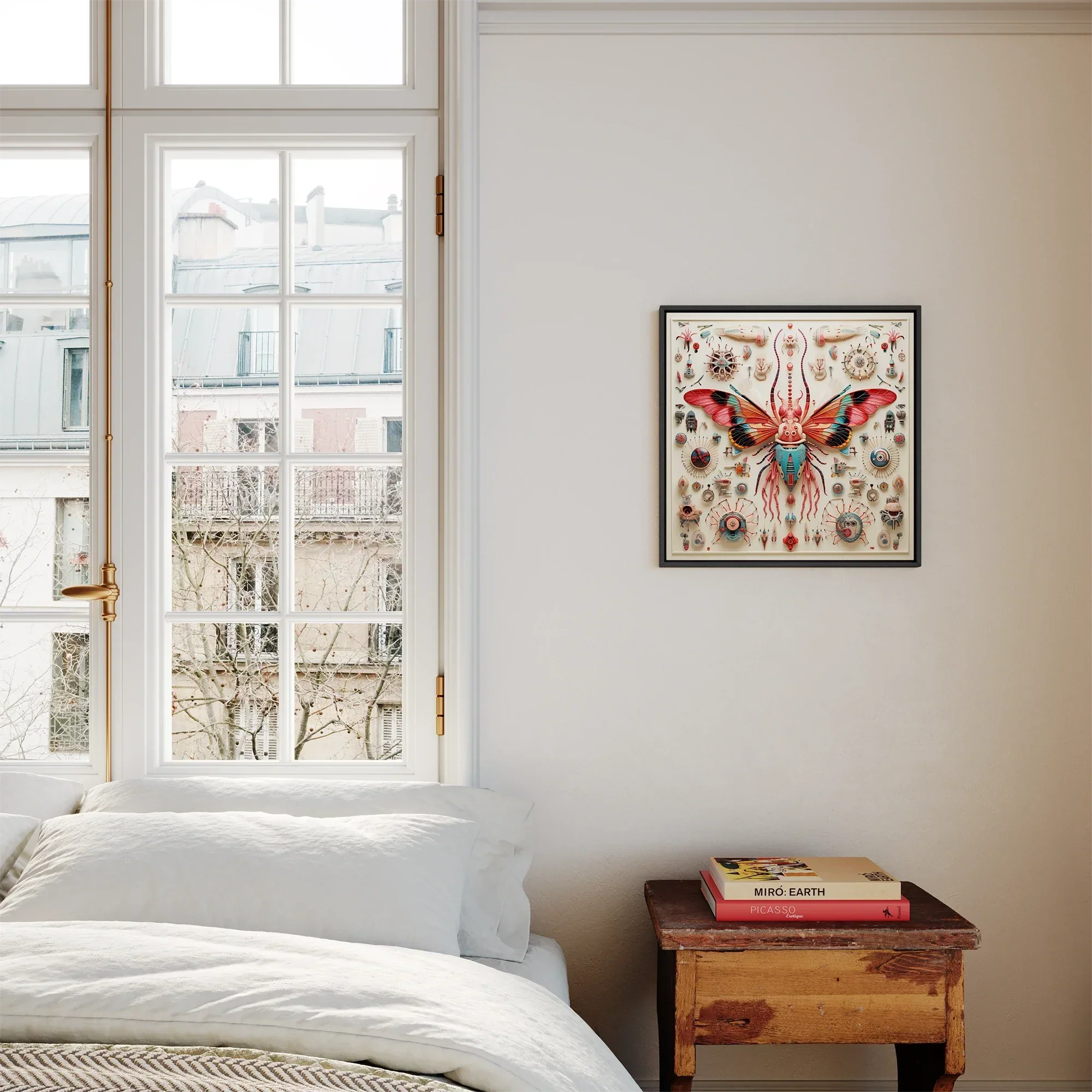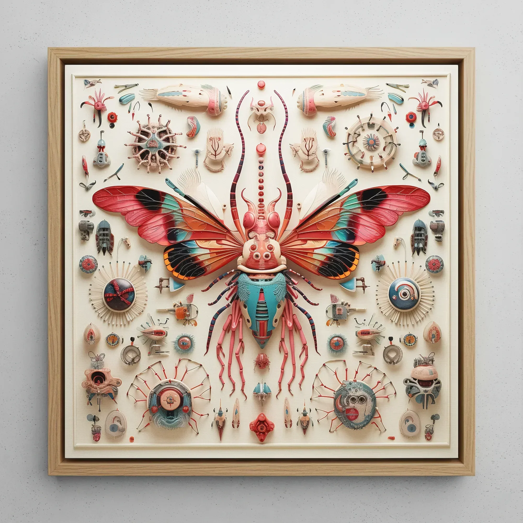 The central figure, with its vibrant crimson wings and aquamarine exoskeleton, evokes both the grandeur of Earth's most exotic butterflies and the otherworldly essence of exoplanetary life. Symmetrically arranged specimens—from eyeball-like orbs to tentacled appendages—create a visual symphony that echoes scientific illustration while defying known biology.