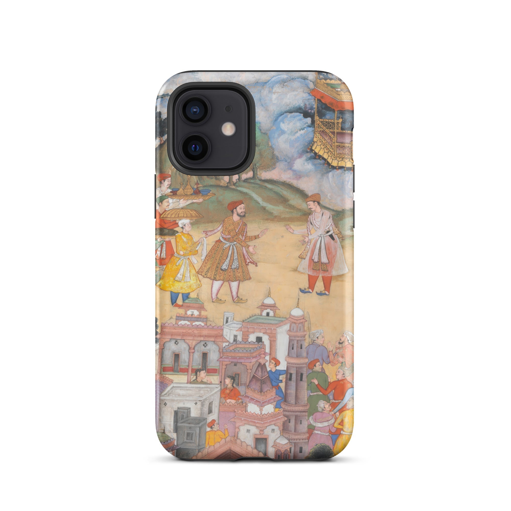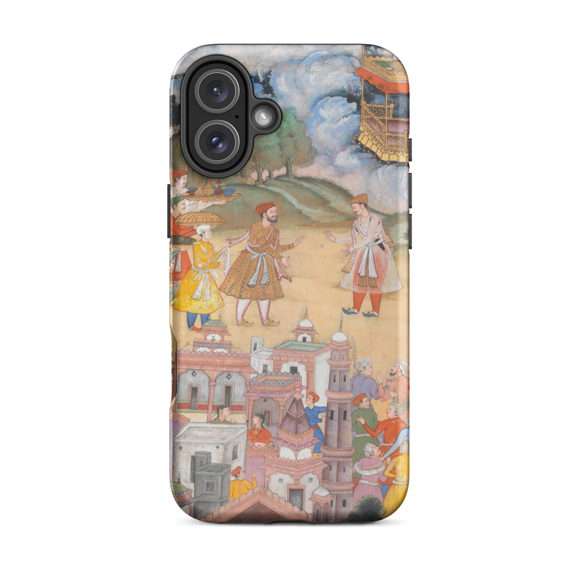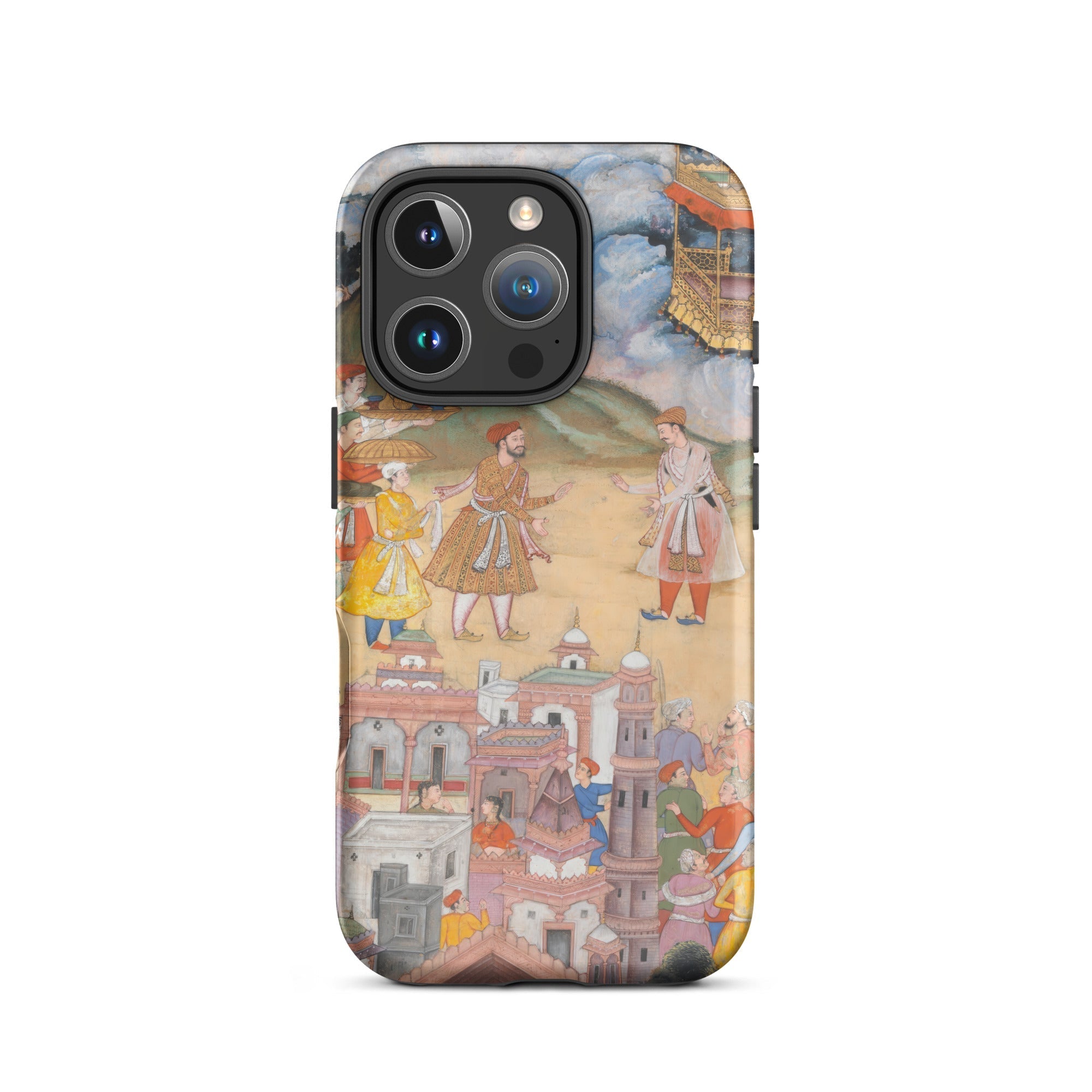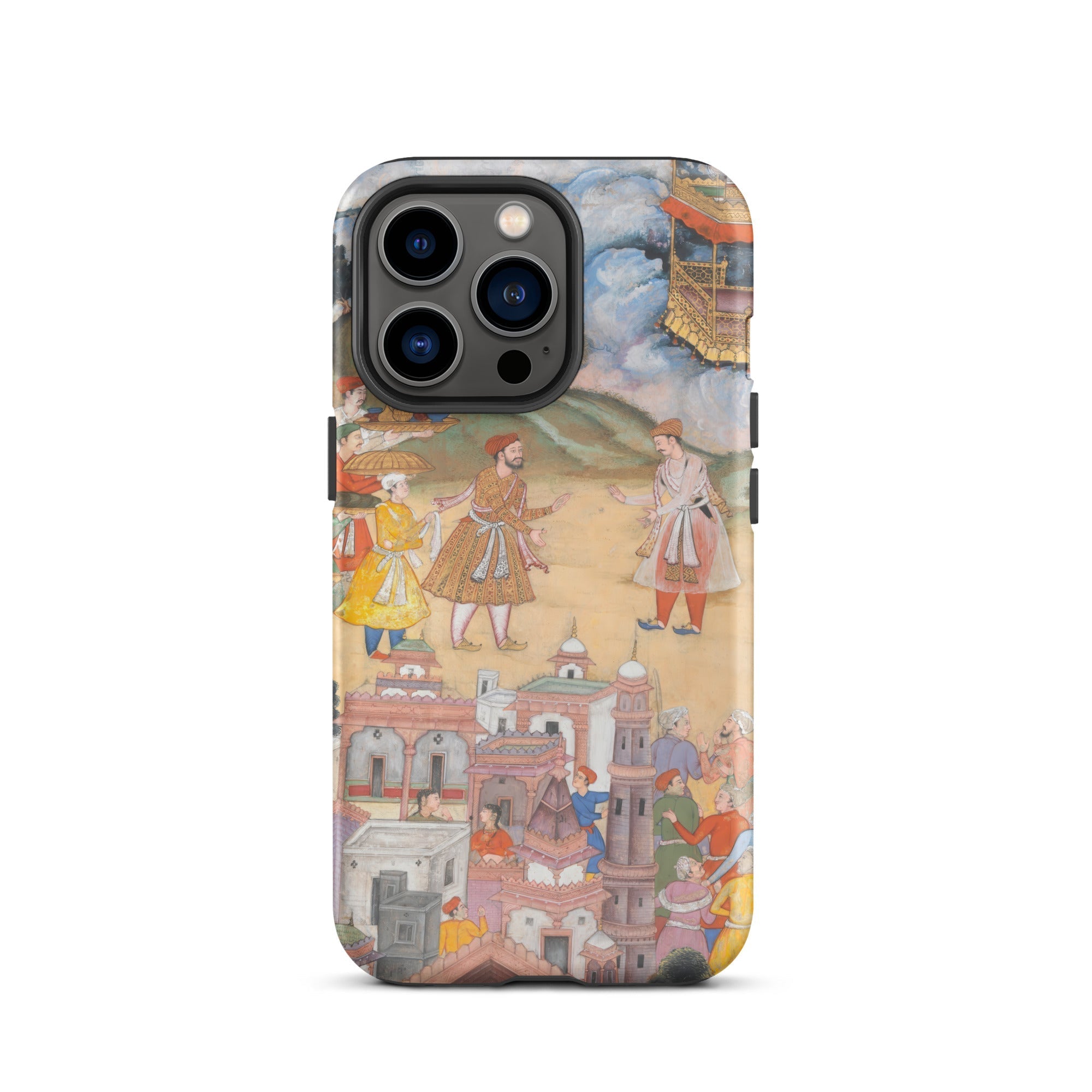 A masterpiece of Mughal miniature art, this Harivamsa iPhone case enshrines the grandeur of an era where myth, history, and artistic finesse converged. Richly adorned figures—clad in the opulent regalia of the Mughal court—stand amidst architectural splendor, their embroidered robes whispering of Persianate aesthetics and royal diplomacy.