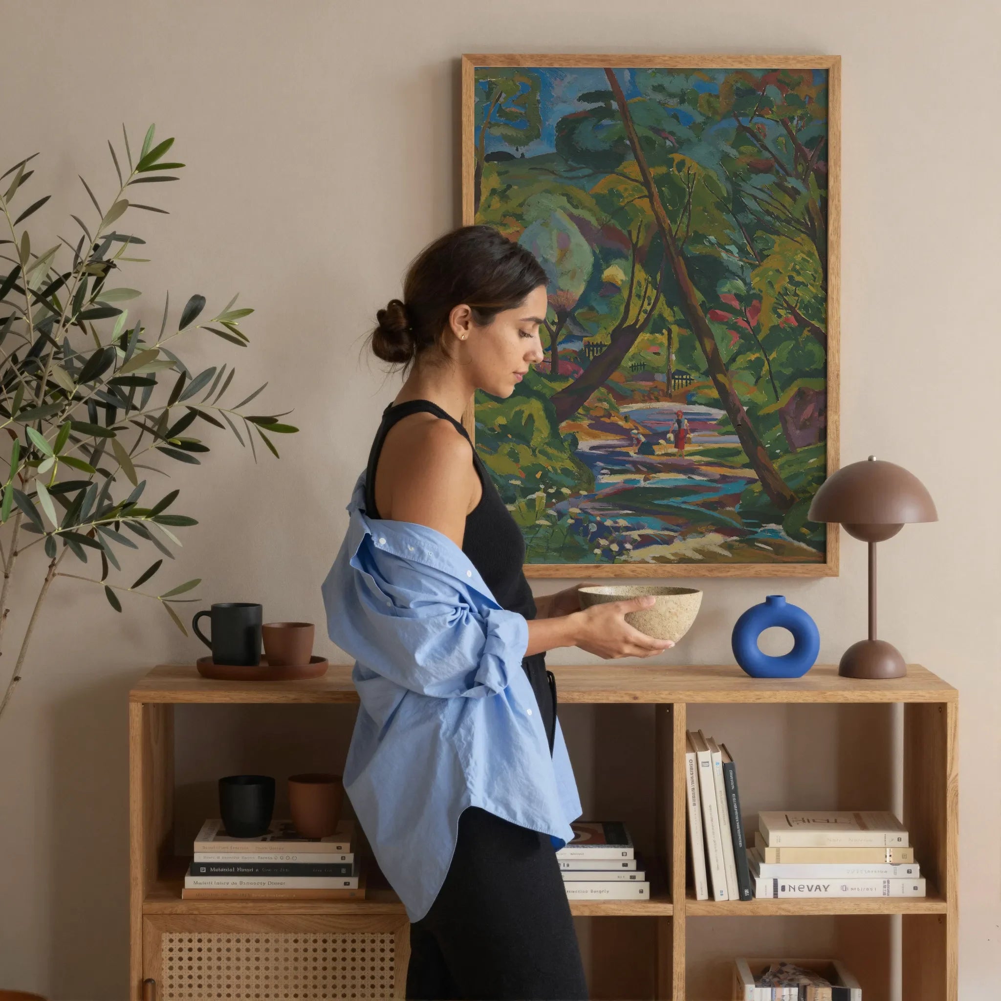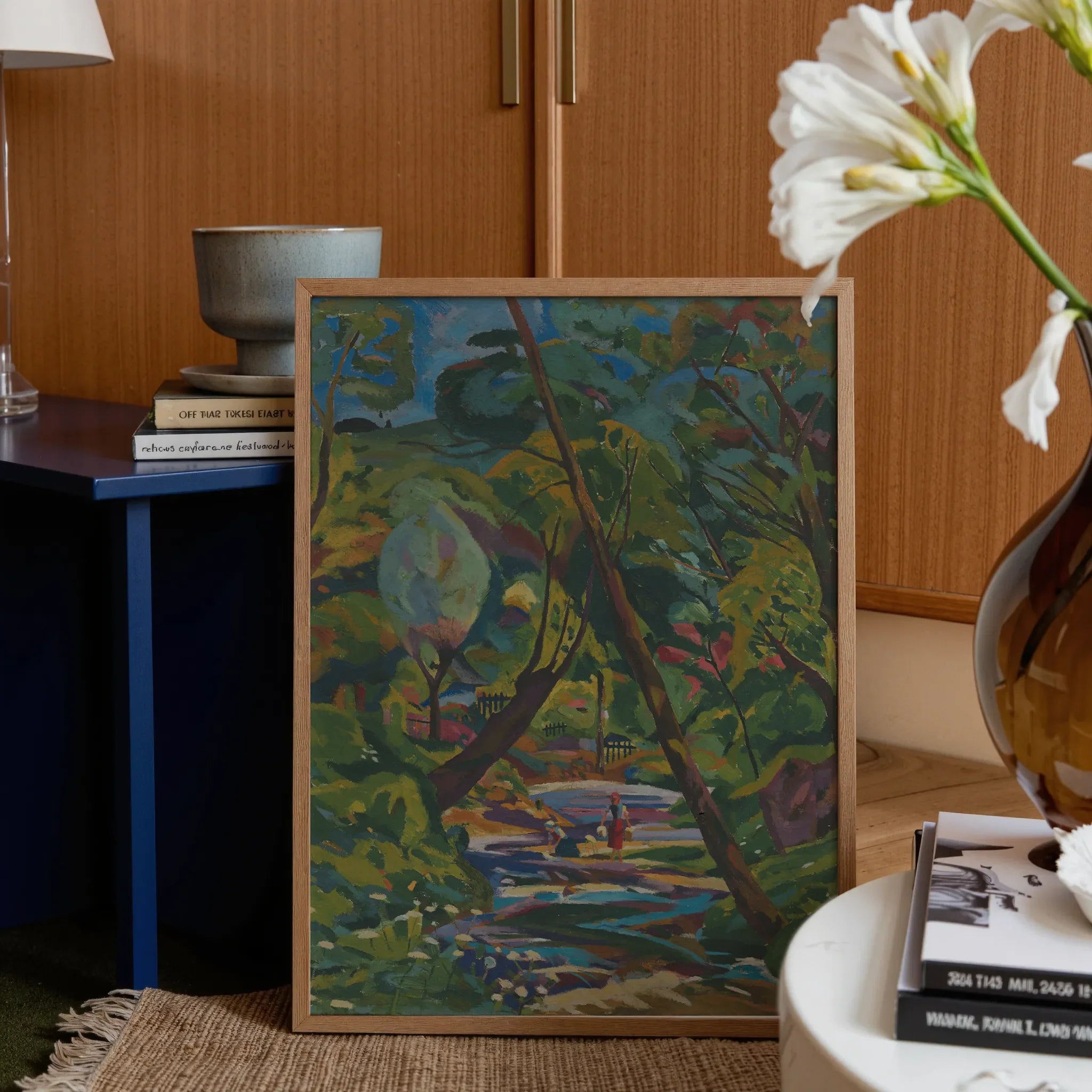Summer gathers itself in facets—burnt ochre, honeyed citron, that specific blue pulled from streambeds and haloes. The trees lift like stage-flats, impossibly vertical, their edges serrated with intent. Beneath their heat-sculpted shade, the stream holds its own mirror: undisturbed, but never idle.