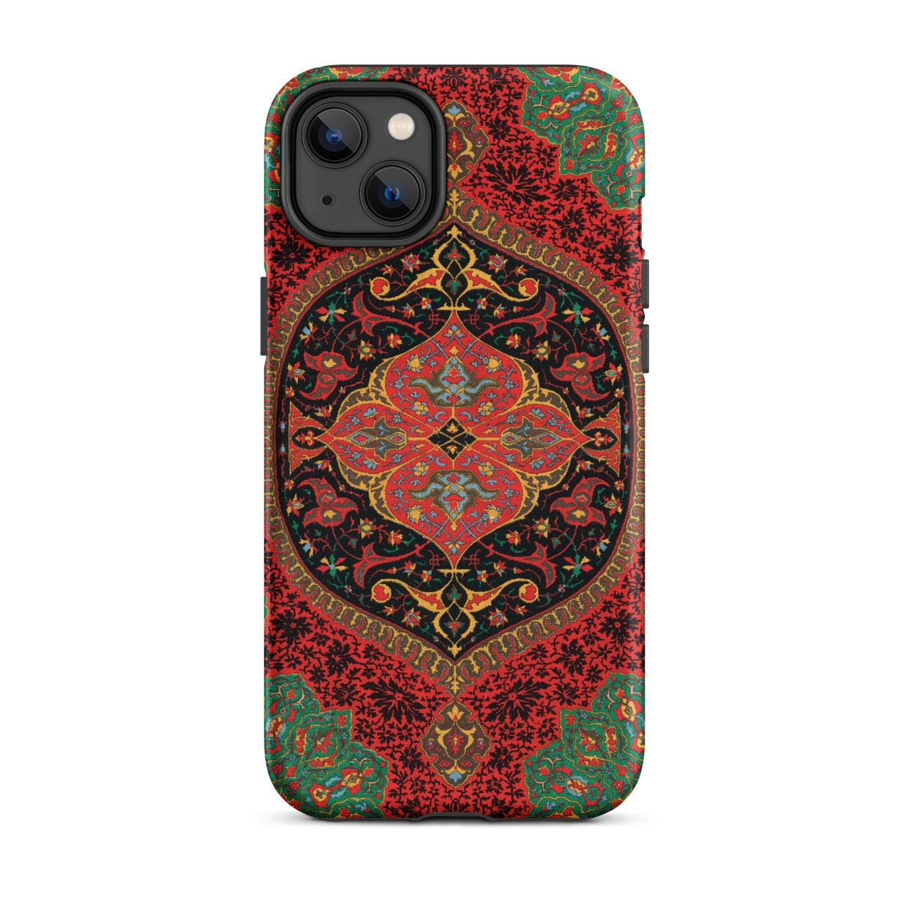 Dive into the mesmerizing world of Islamic art with this iPhone case featuring La Decoration Arabe Plate 40 & 41 by Emille Prisse d'Avennes. You're not just protecting your device; you're wrapping it in centuries of ornate tradition. Vibrant reds and lush greens dance across your screen, framing the intricate black medallion at its heart. Golden arabesques weave through the design, echoing the rhythms of ancient bazaars and whispered prayers.