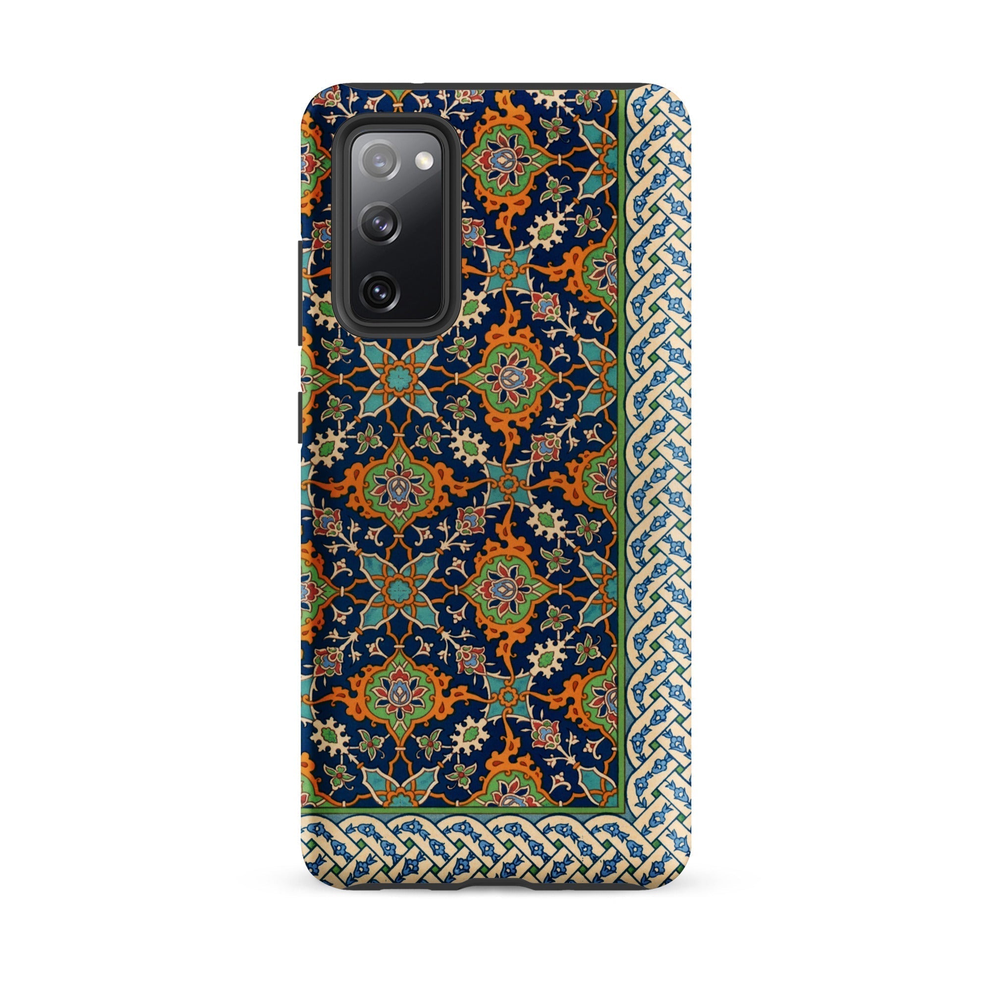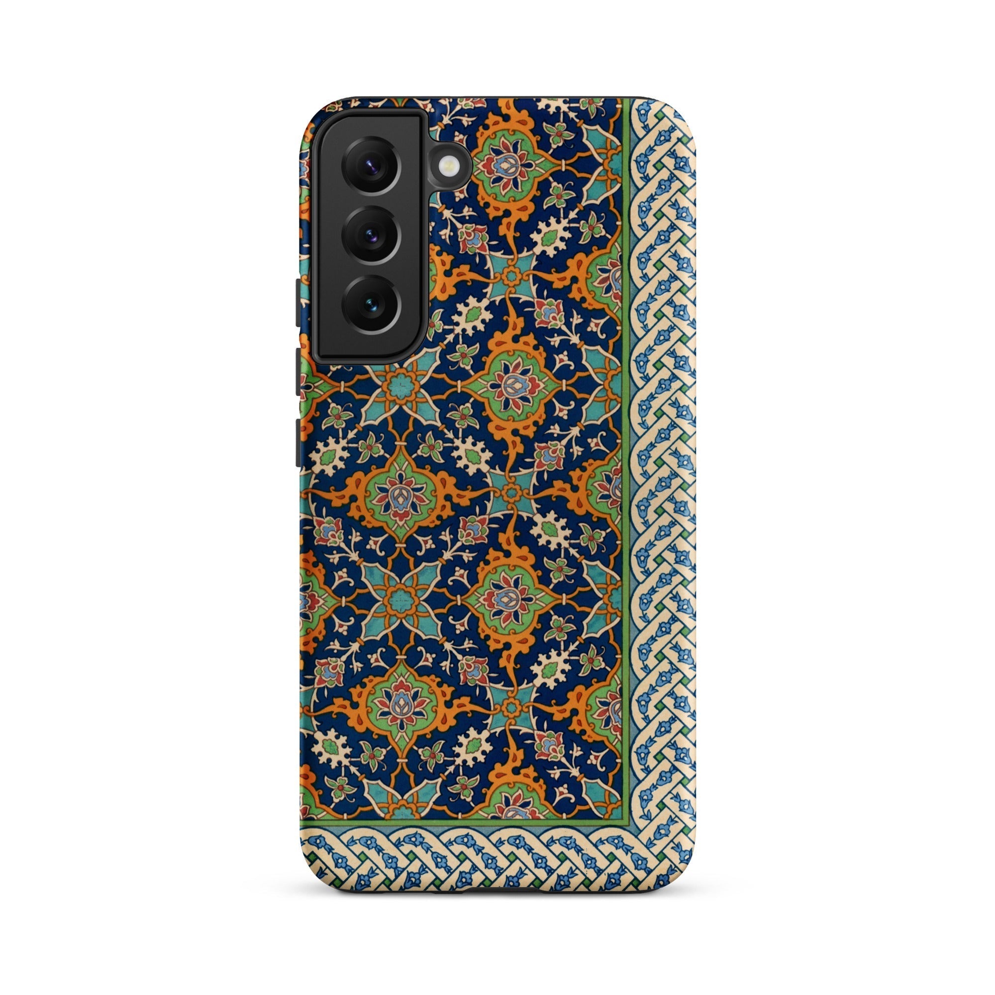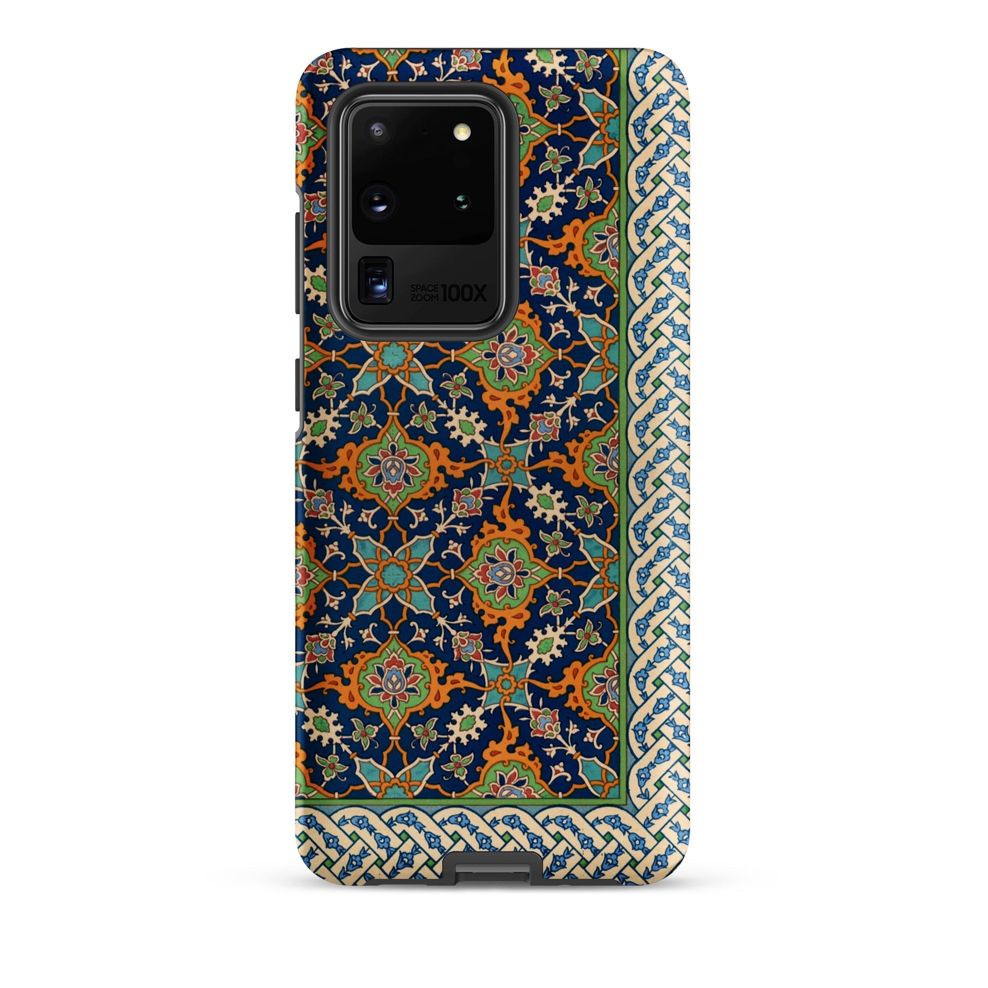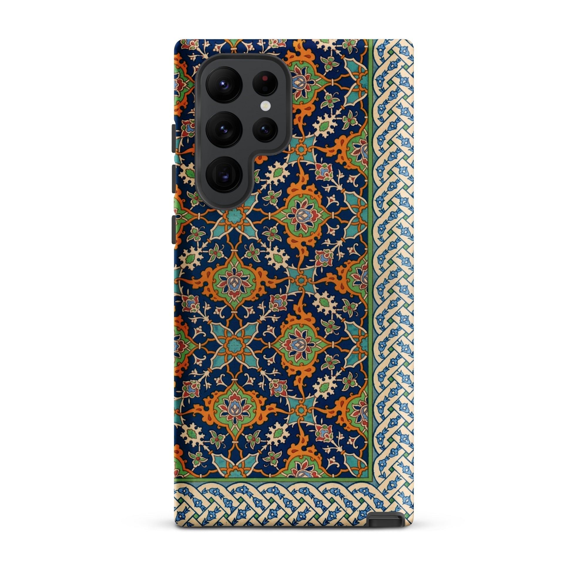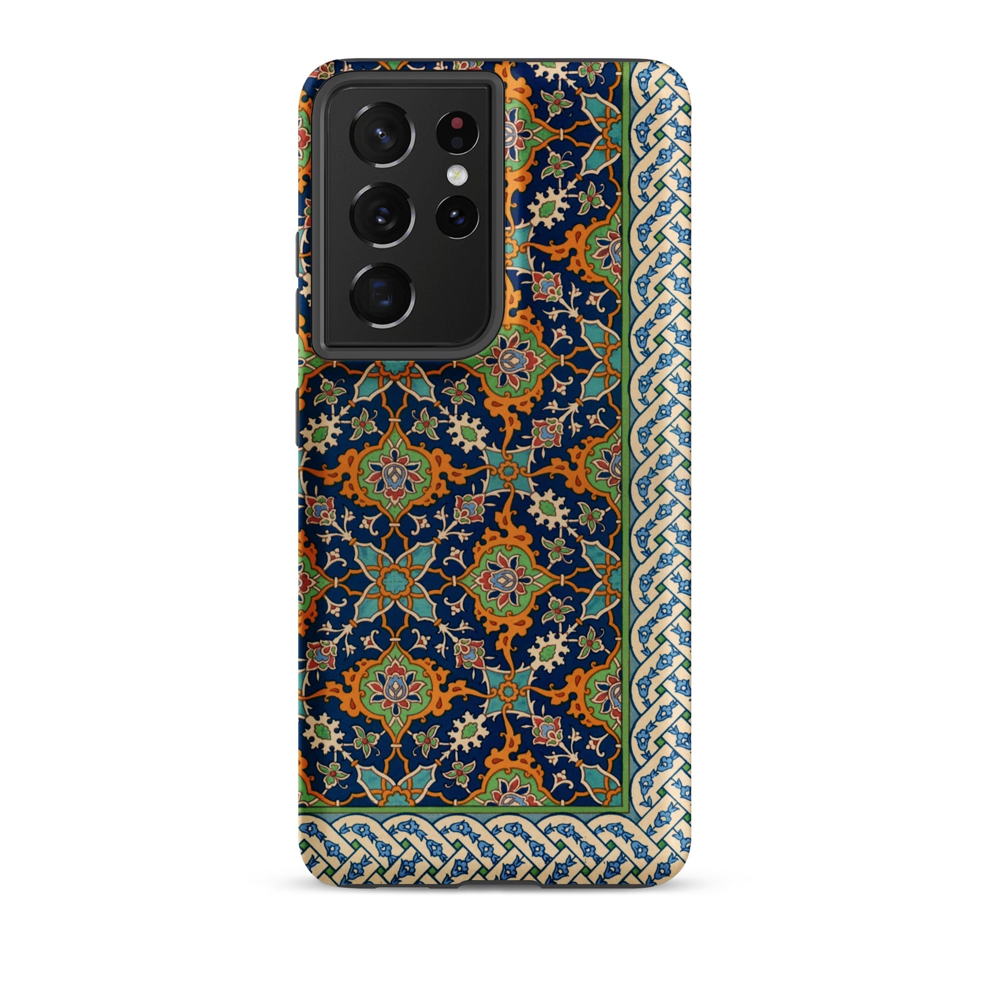 A lattice of midnight cobalt carries blossoms edged in ember, their petals circling pale teal medallions like lanterns suspended in an Andalusian courtyard. This Emile Prisses d’avennes Samsung case revives the precision of their 19th-century Orientalist design. Echoing Persian tilework, Mamluk friezes, and Ottoman garden pavilions.