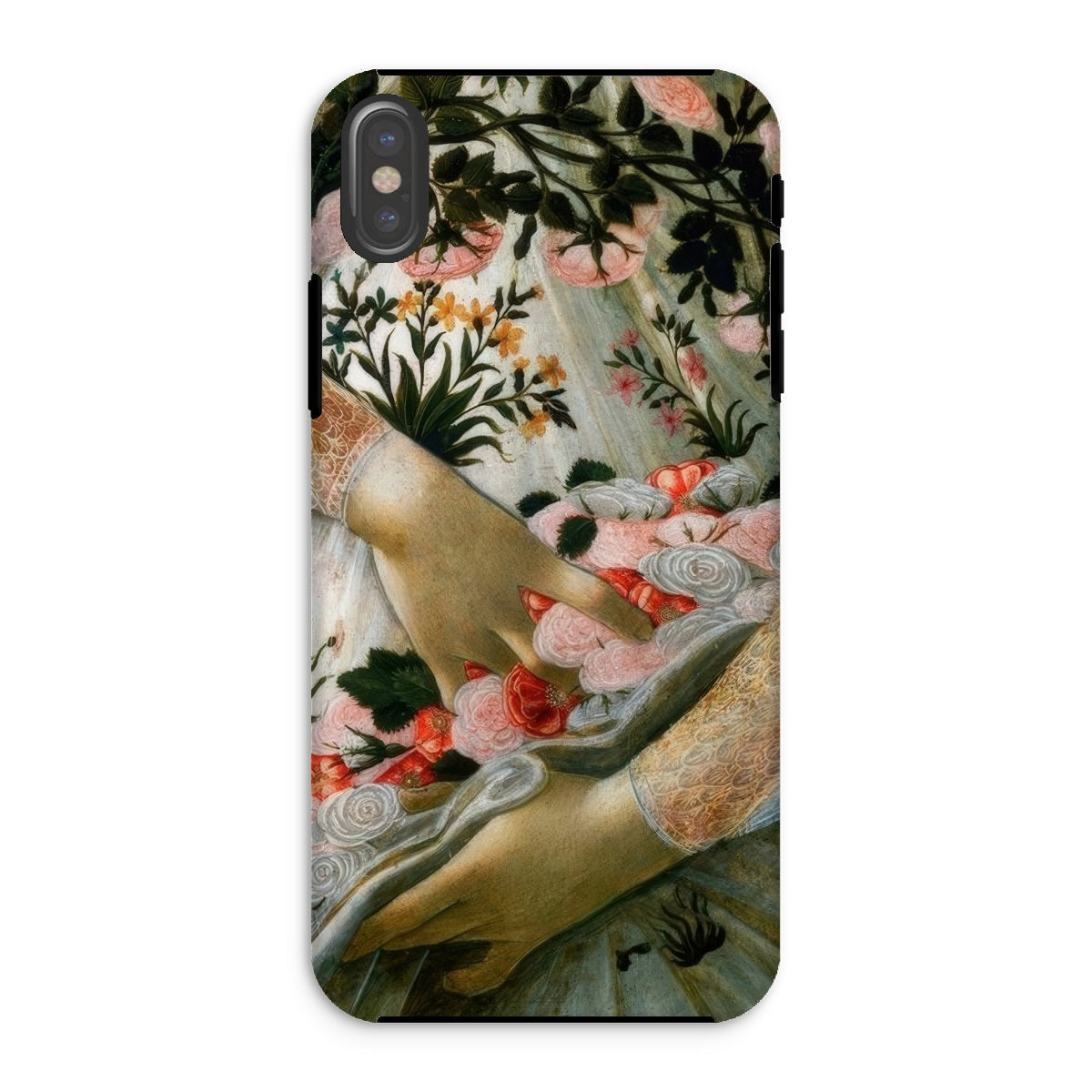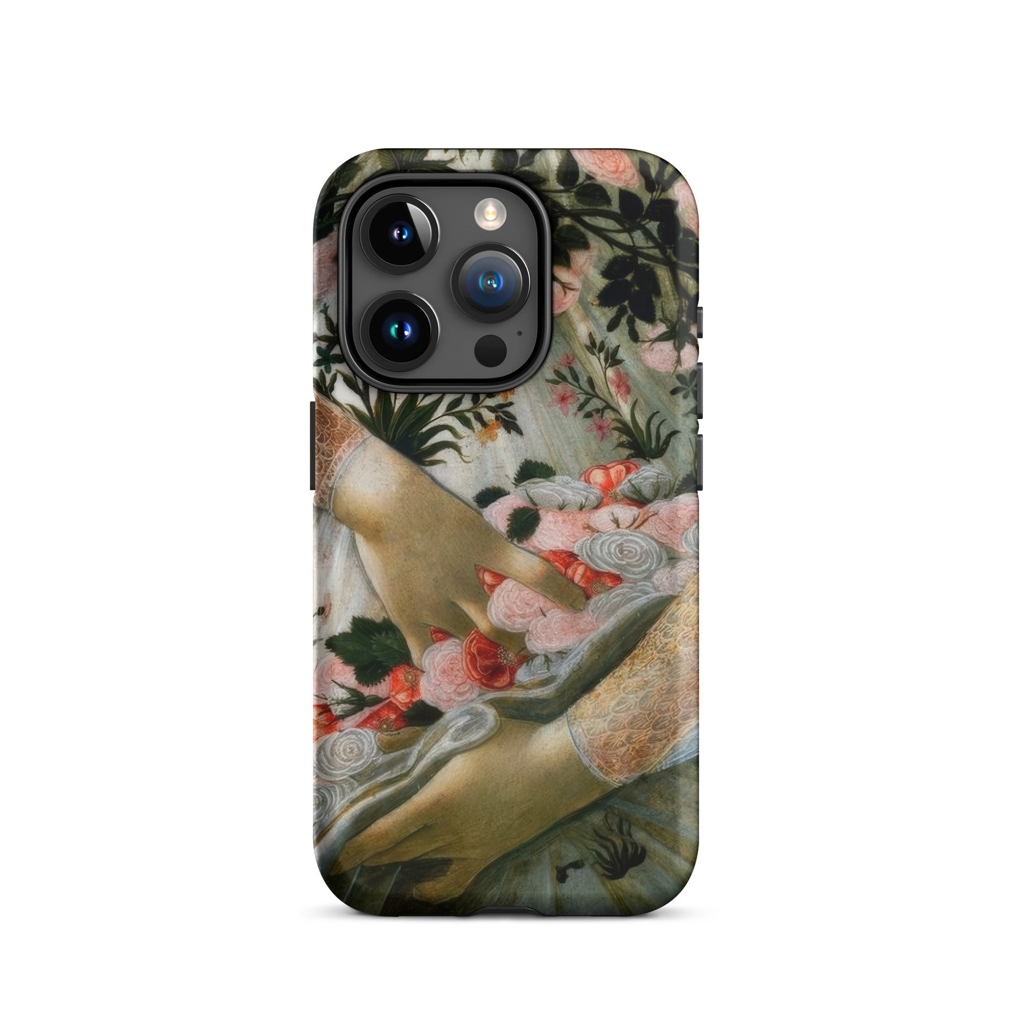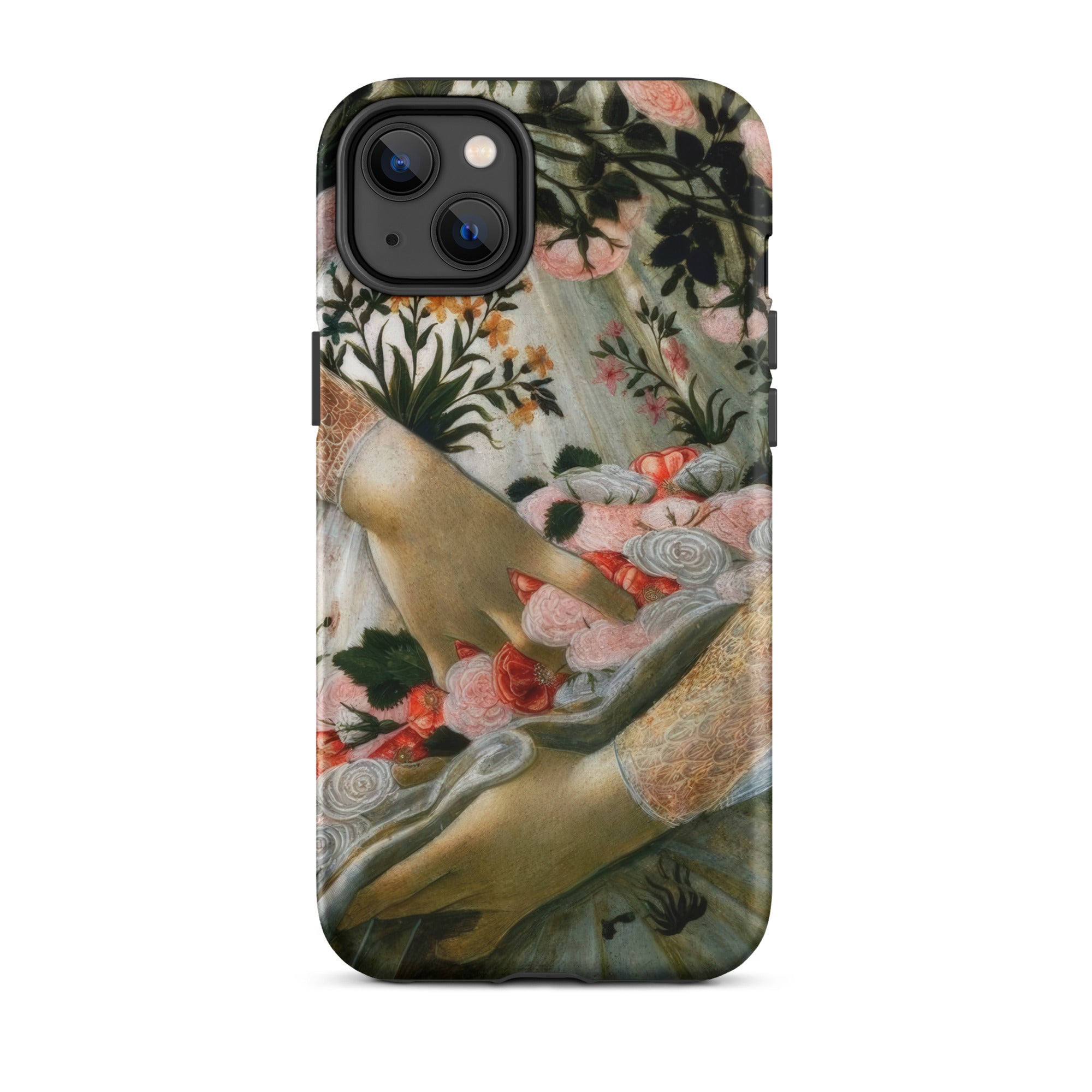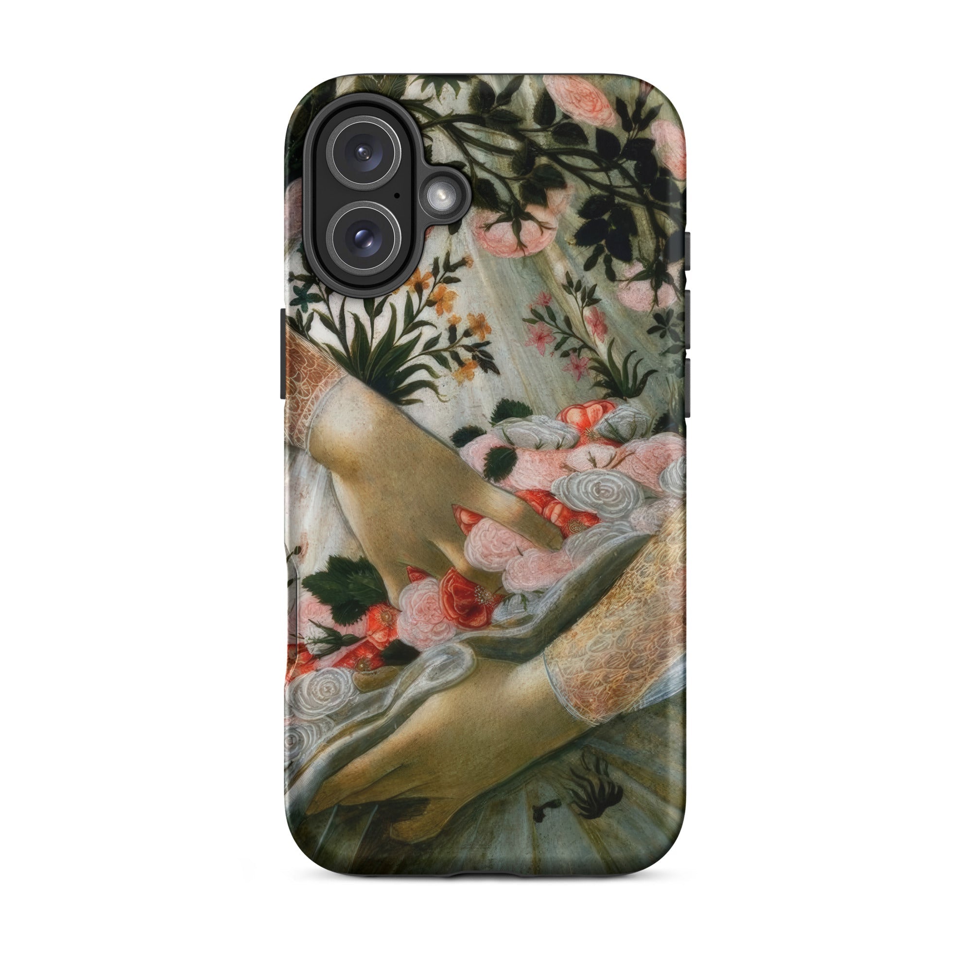 The wrist bends like a prayer, the fingers speak in the grammar of petals—this is La Primavera not as tableau, but as touch. Botticelli, that Florentine conjurer of breathless grace, renders flesh and flora with the same reverence he grants divinity. Here, an iPhone case becomes an altar: to divine femininity, to the mytho-poetic sensuality of Renaissance painting, to a world where hands do not grasp but offer.