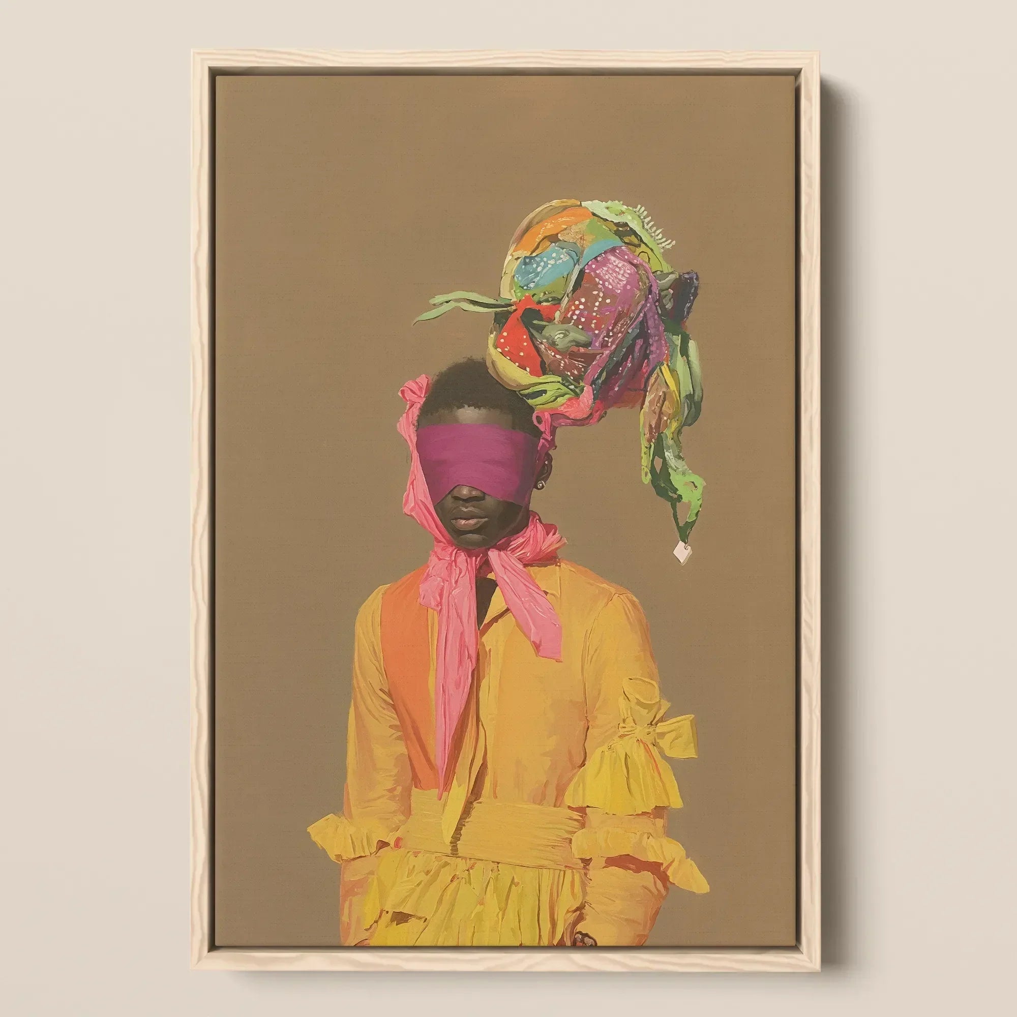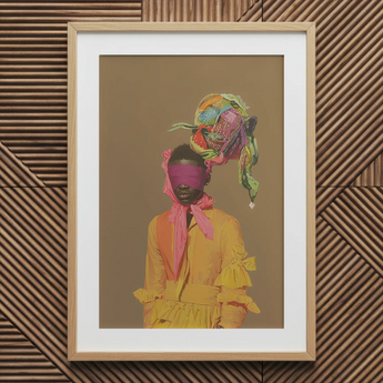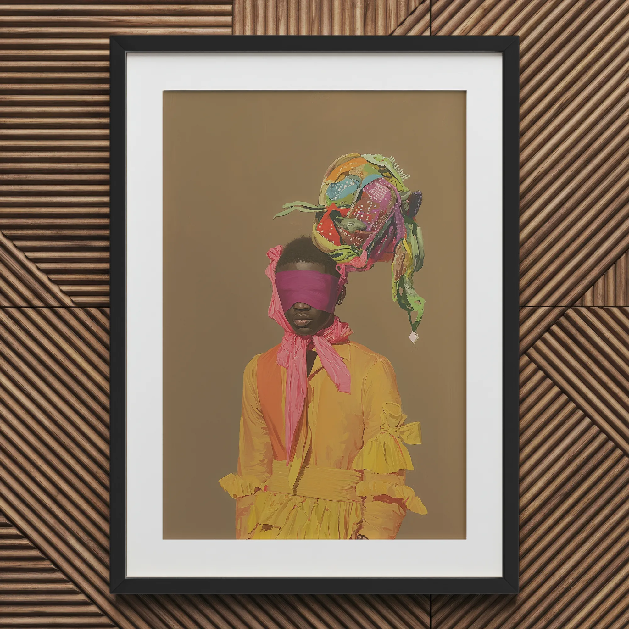 A pink blindfold veils their eyes, a metaphor for unseen futures waiting to be claimed. Above, an avant-garde headwrap in a kaleidoscope of textures—stitched histories, ancestral echoes, the soft armor of dreamers. It is both adornment and manifesto, a crown of resilience. The vibrant clash of colors evokes retro fashion illustration, where surrealism meets legacy, where fabric is both shield and revolution.
