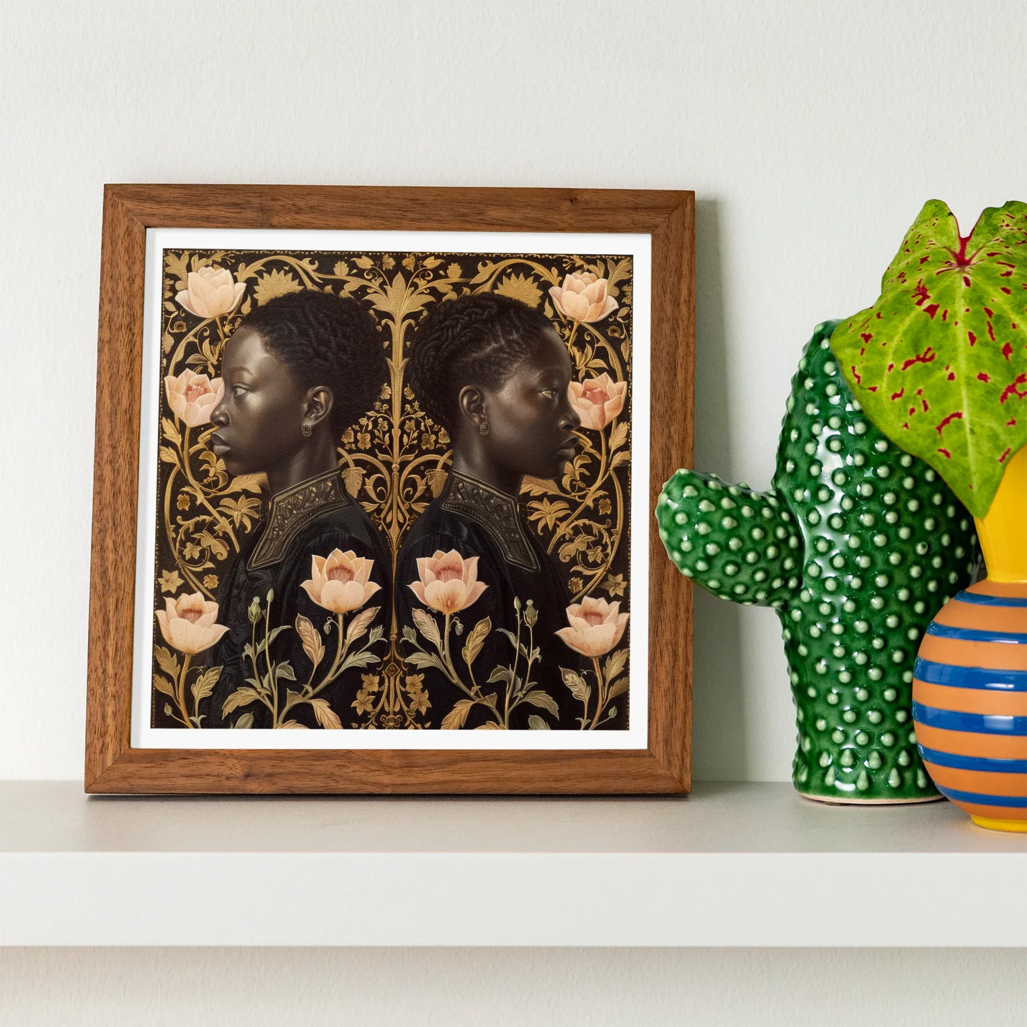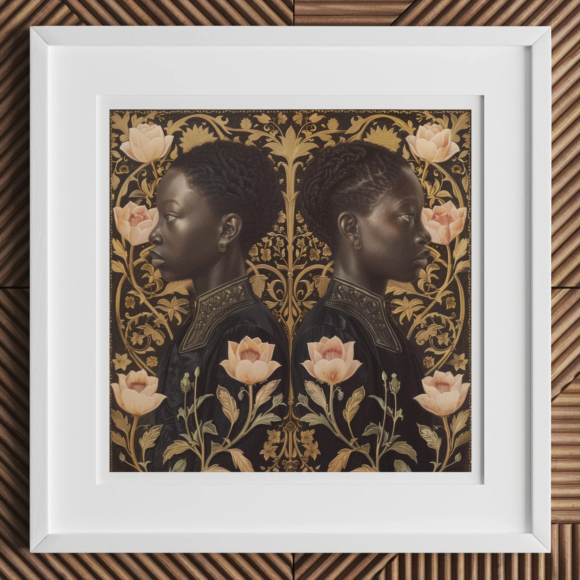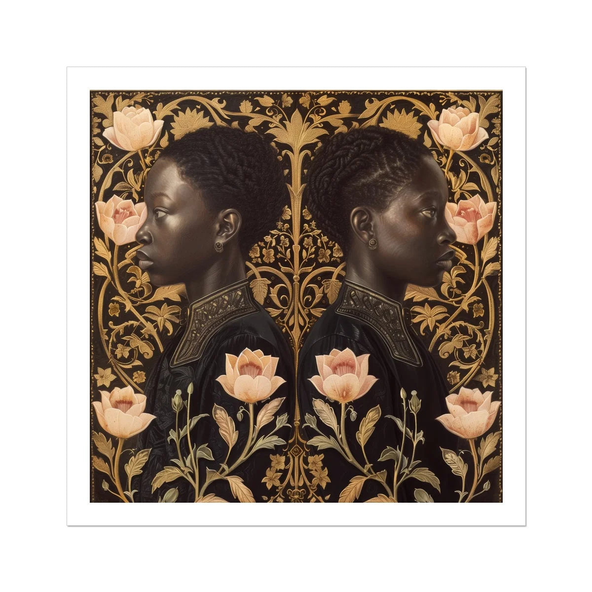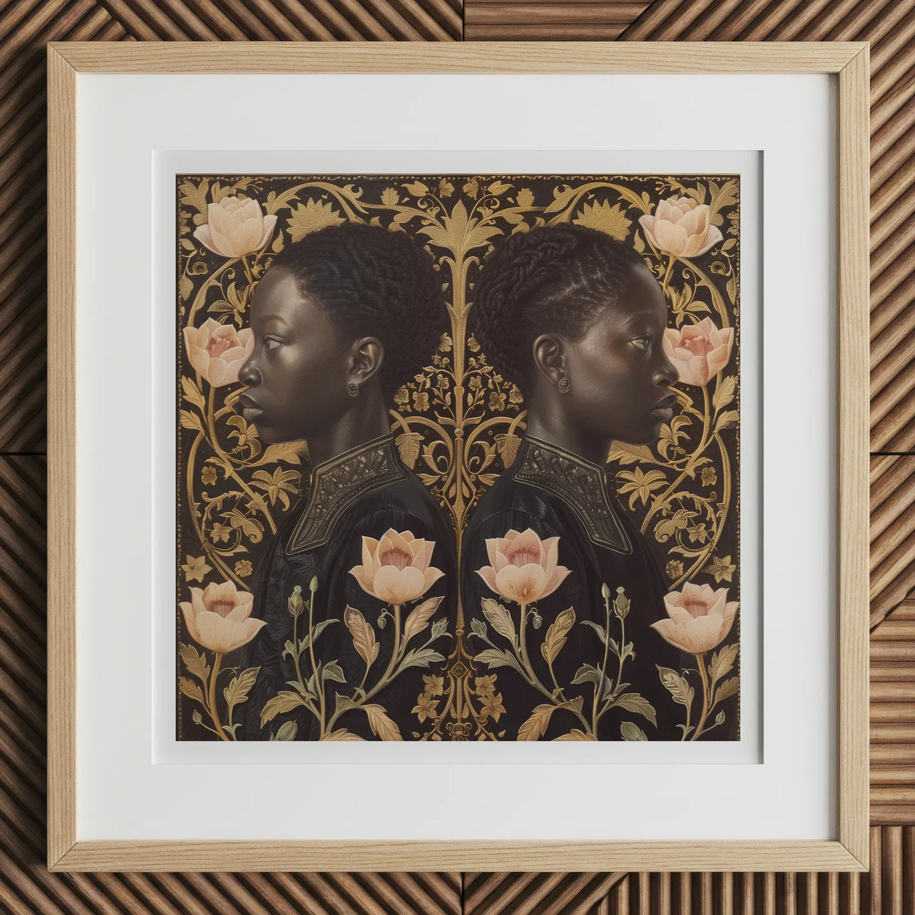 Plant yourself in a world where past and present collide. Lizzie & Carlotta beckon, a neo-Renaissance marvel pulsing with modern vitality. Twin profiles of regal Black twins emerge from pink and gold fields, their gaze penetrating centuries. Intricate amber filigree dances around them, echoing Art Nouveau's sensuous curves while evoking Netherlandish precision.