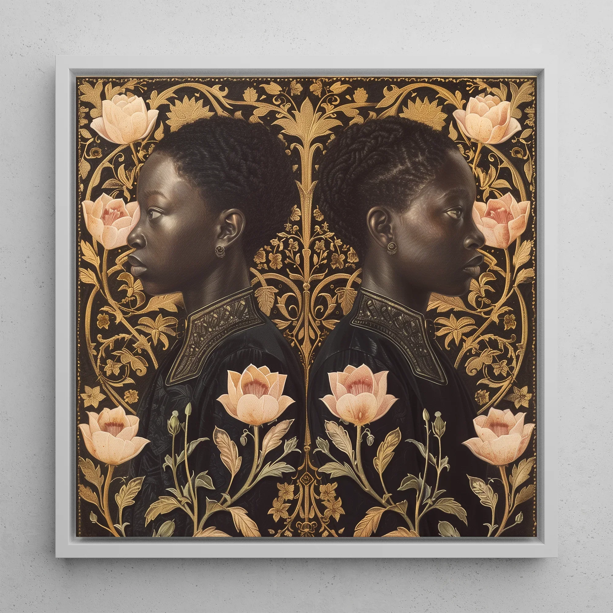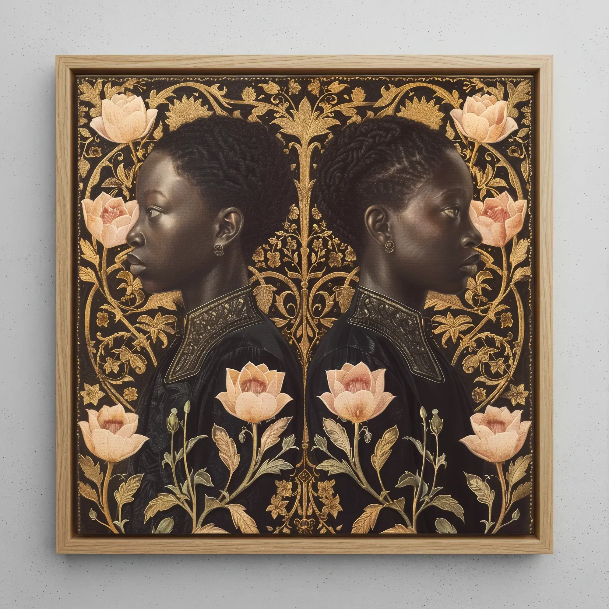 Mirrored yet distinct, the twins stand against a tapestry of gilded longing. Lizzie & Carlotta—sentinels of time, their obsidian skin kissed by the soft defiance of blooming florals. Dusky gold filigree unfurls at their shoulders. Pale pink flowers surround them against midnight black. Whispering of resilience, rebirth, and something unspoken—a history bending but never breaking.