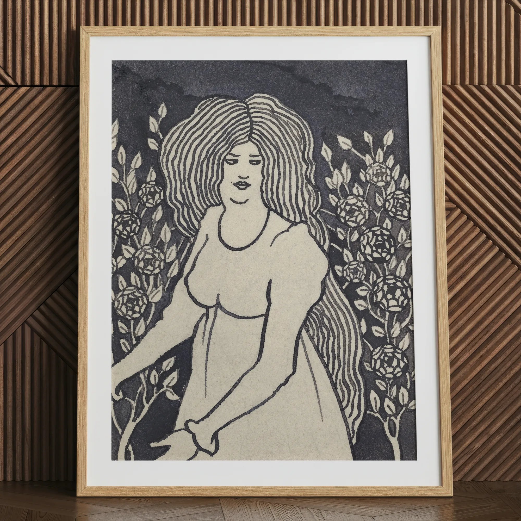 Long-haired Woman in Front of Tall Rosebushes - Aubrey Beardsley Art Print