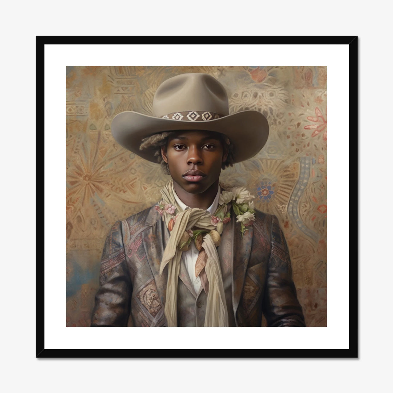 His bespoke cowboy jacket is a contradiction made beautiful—worn yet regal, its intricate patchwork reminiscent of Gee’s Bend quilts, where generations of Black hands turned scraps into masterpieces. The threads do not simply hold fabric together; they hold memory. A timeworn elegance, stitched with defiance. Around his neck, a silk bandana, knotted with intention, bears the dust of a thousand untold stories—stories of Buffalo Soldiers, of Creole trail riders, of queerness not as an anomaly but as a birthright. Wildflowers bloom against its folds, not fragile, but fearless—rooted in sunbaked soil, thriving where the world said they could not.