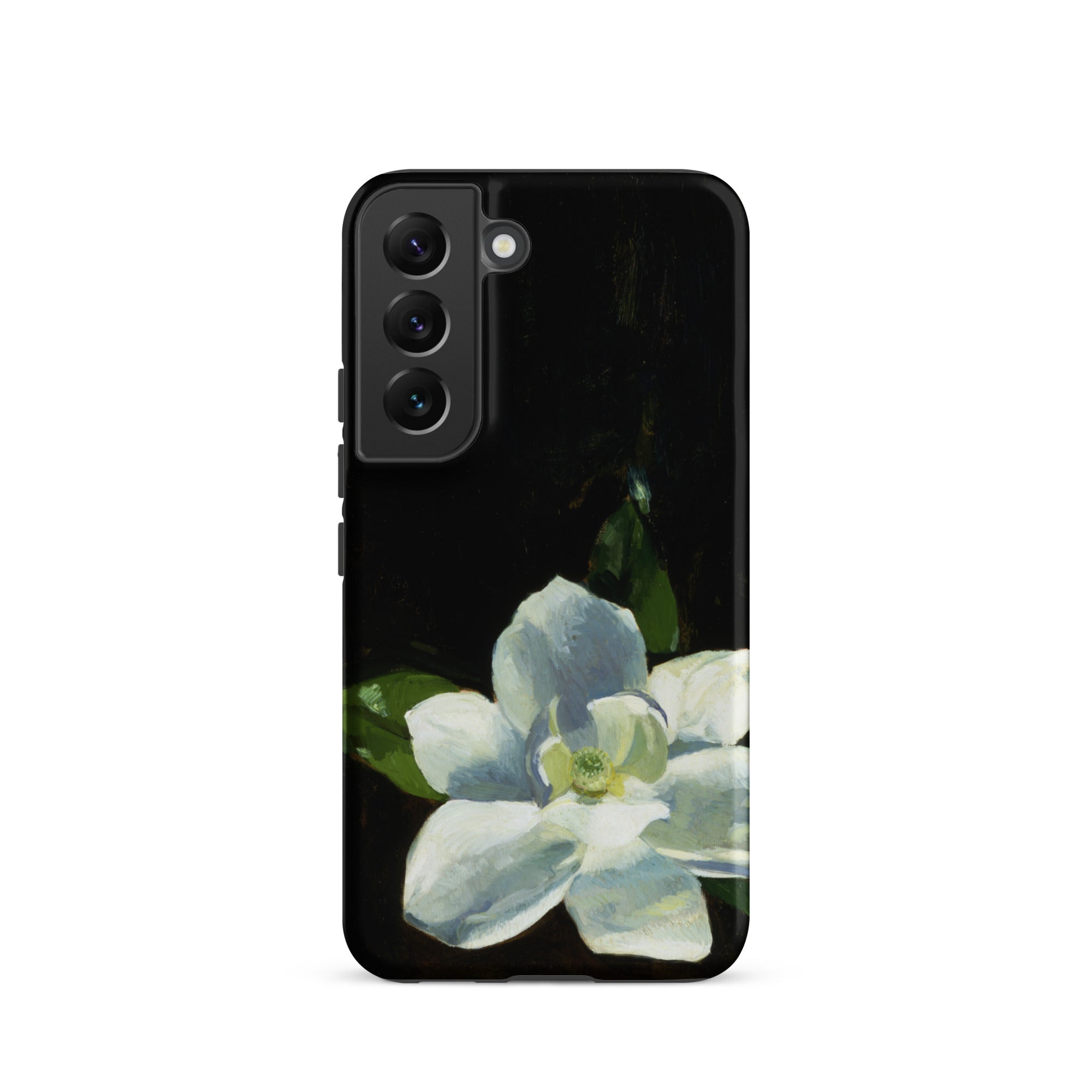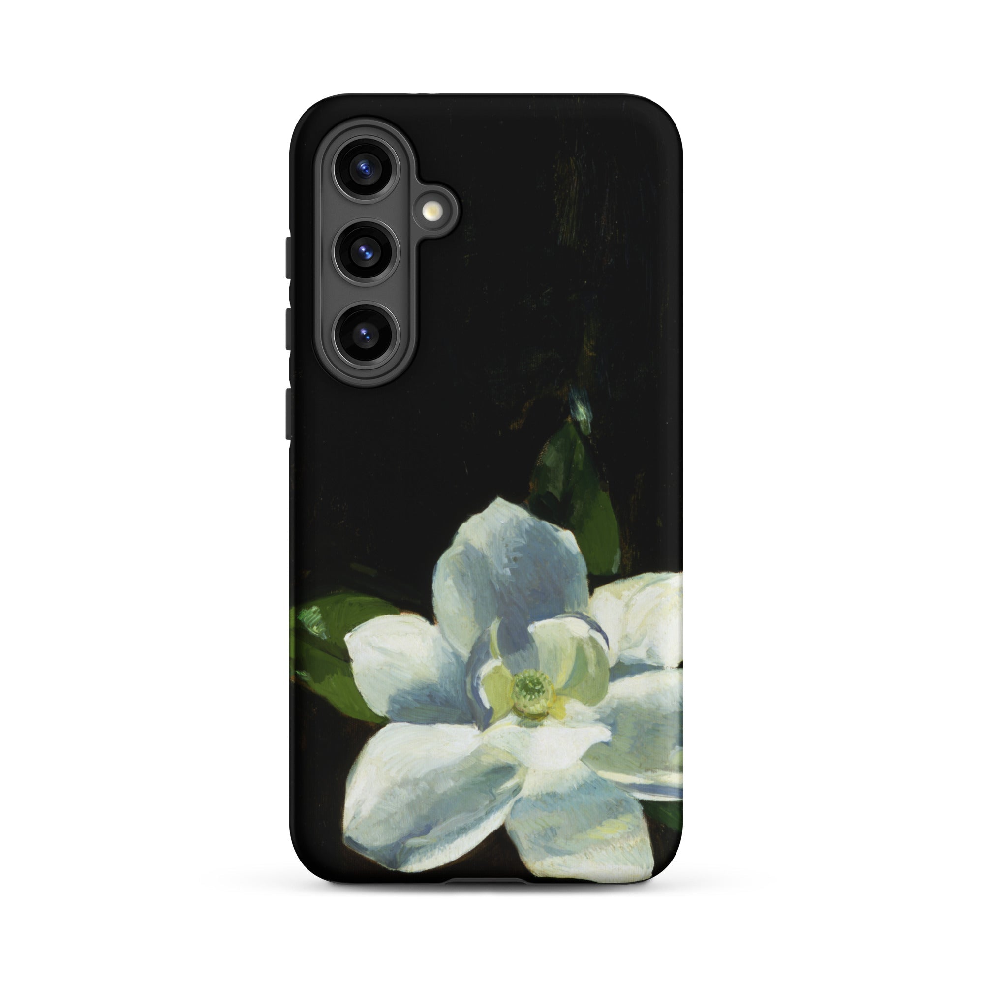 On this phone case, Stetson's Magnolia emerges from tenebristic void like a breath withheld. The American painter set cream-white petals against bituminous darkness, building form through tonal shifts from pale celadon to soft cerulean where folds deepen.