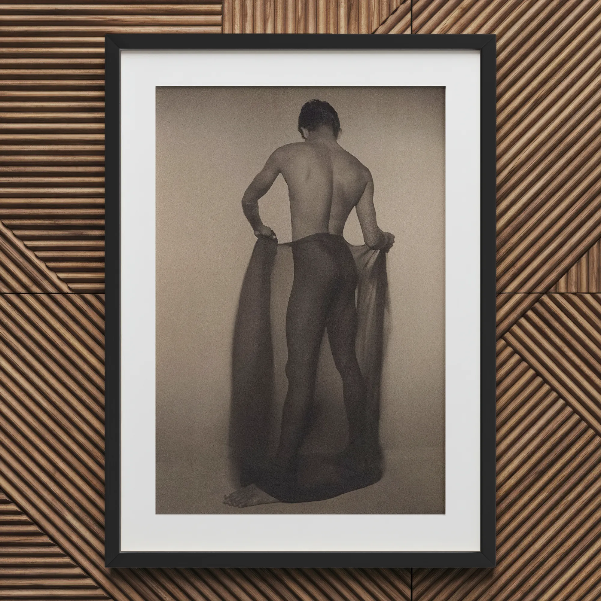 In Male Nude Draped in Vetti by Lionel Wendt, we find an erotic exploration of the male form and cultural drapery. The subject stands with his back turned, a sheer fabric delicately enveloping his lower body, creating a play of light and shadow that accentuates the muscular contours and sinewy elegance of his physique.