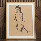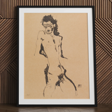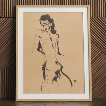 His gaze pulls sideways, not coy but loaded, lips held in suspended breath. Every limb straining toward tension: wrist flexing, shoulder tightening, foot curling. This is no study. It’s a ritual of showing. Schiele renders the male body as an offering—tight, hungry, bare of metaphor, rich with visual charge. No symbol replaces the skin. The skin is the symbol.