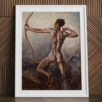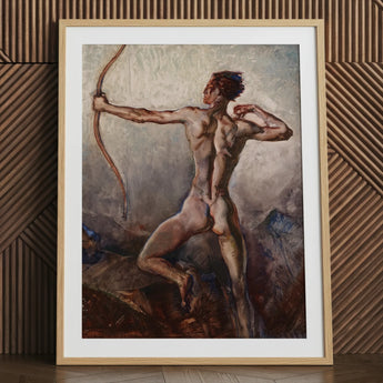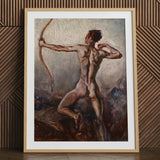 The archer’s posture seizes the eternal instant before release, a fusion of mythic heroism and painterly immediacy, where the body itself becomes architecture of strength, grace, and focused determination caught forever in suspended motion.