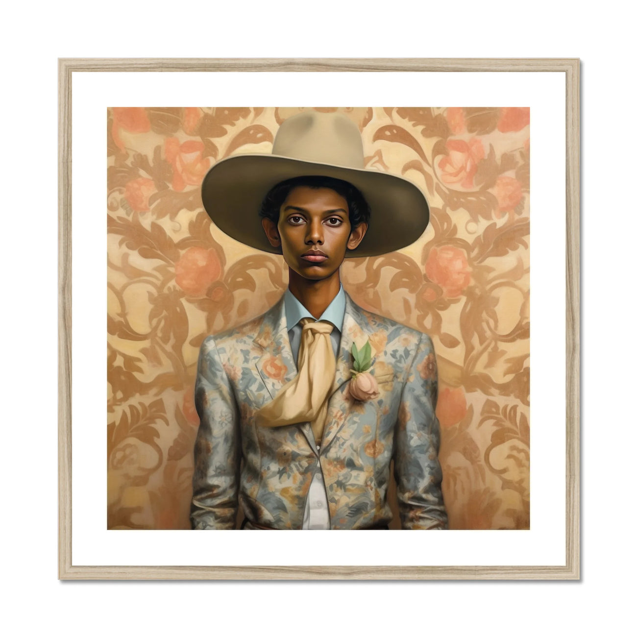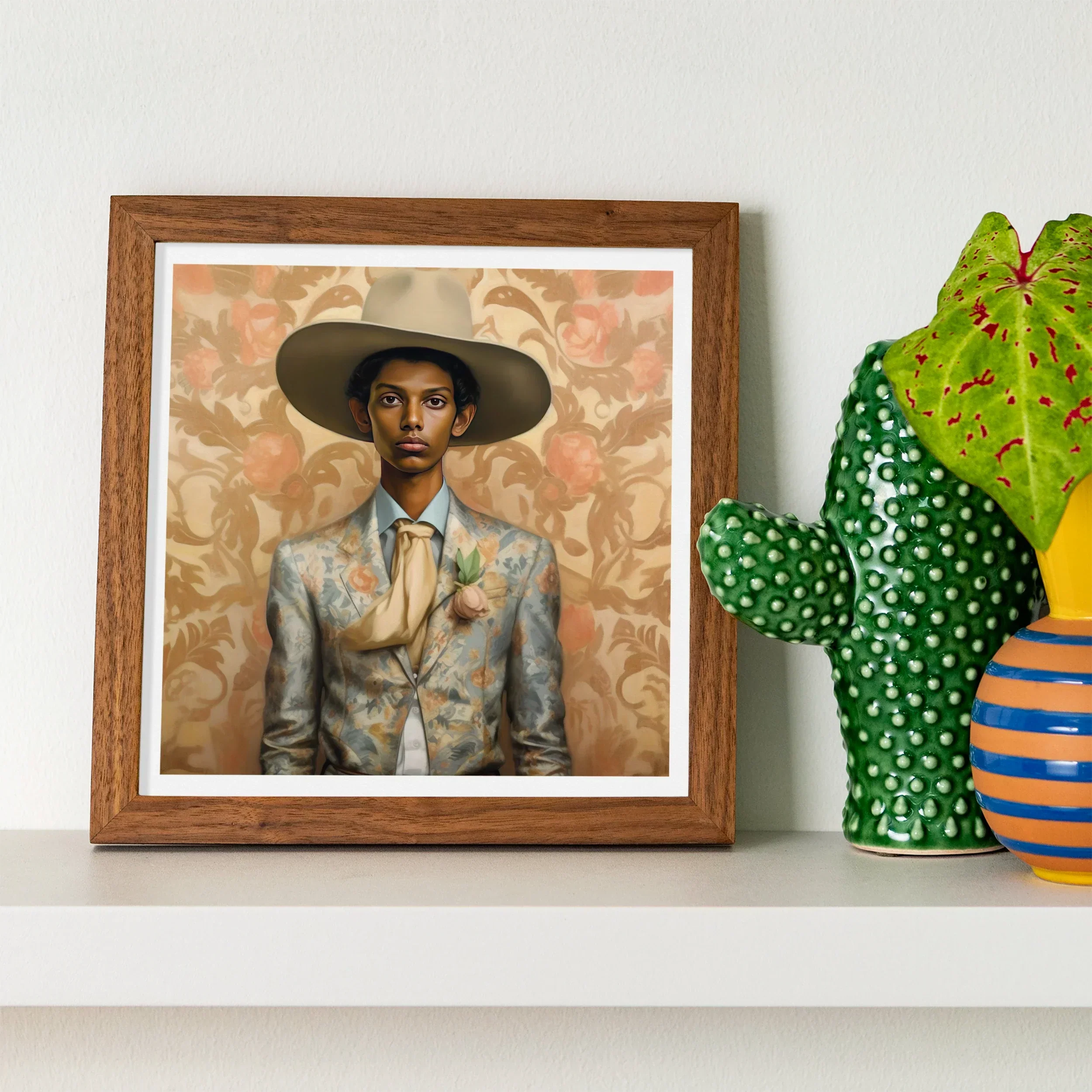 Behind him, the wallpaper breathes—floral damask unfolding like Kolam patterns and Art Nouveau flourishes at dawn—quiet spells cast in ochre and coral. This is no ordinary cowboy tale; Mallaravan's a reclamation. The Western frontier and Tamil identity entwine in his bones, in his posture, in the way he commands both tenderness and space. He is a veeran of two worlds, an outlaw of expectation, a storm bird, shape-shifter, legend.