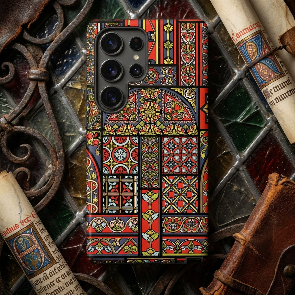 Every rosette hums with heraldic geometry, every border locked with gilded foliate scrollwork that echoes gothic chapels and illuminated missals. On this Samsung case, vermilion reds and deep azures frame meticulous grisaille medallions. Their symmetry channelling the pageantry of chivalric processions, the hush of candlelit cloisters and the radiant glass walls of Chartres and Sainte-Chapelle.