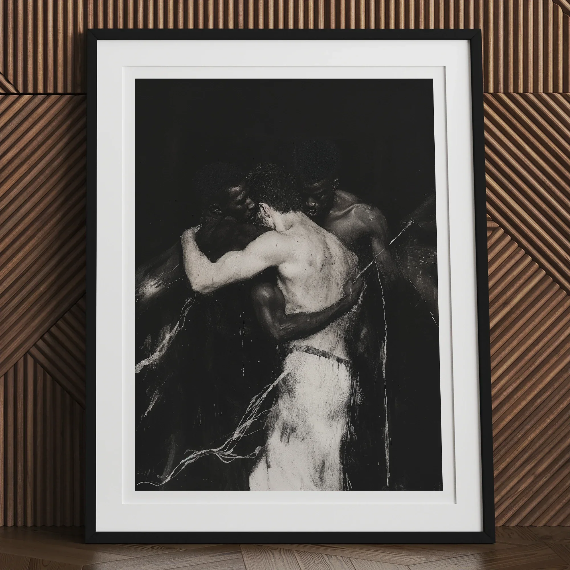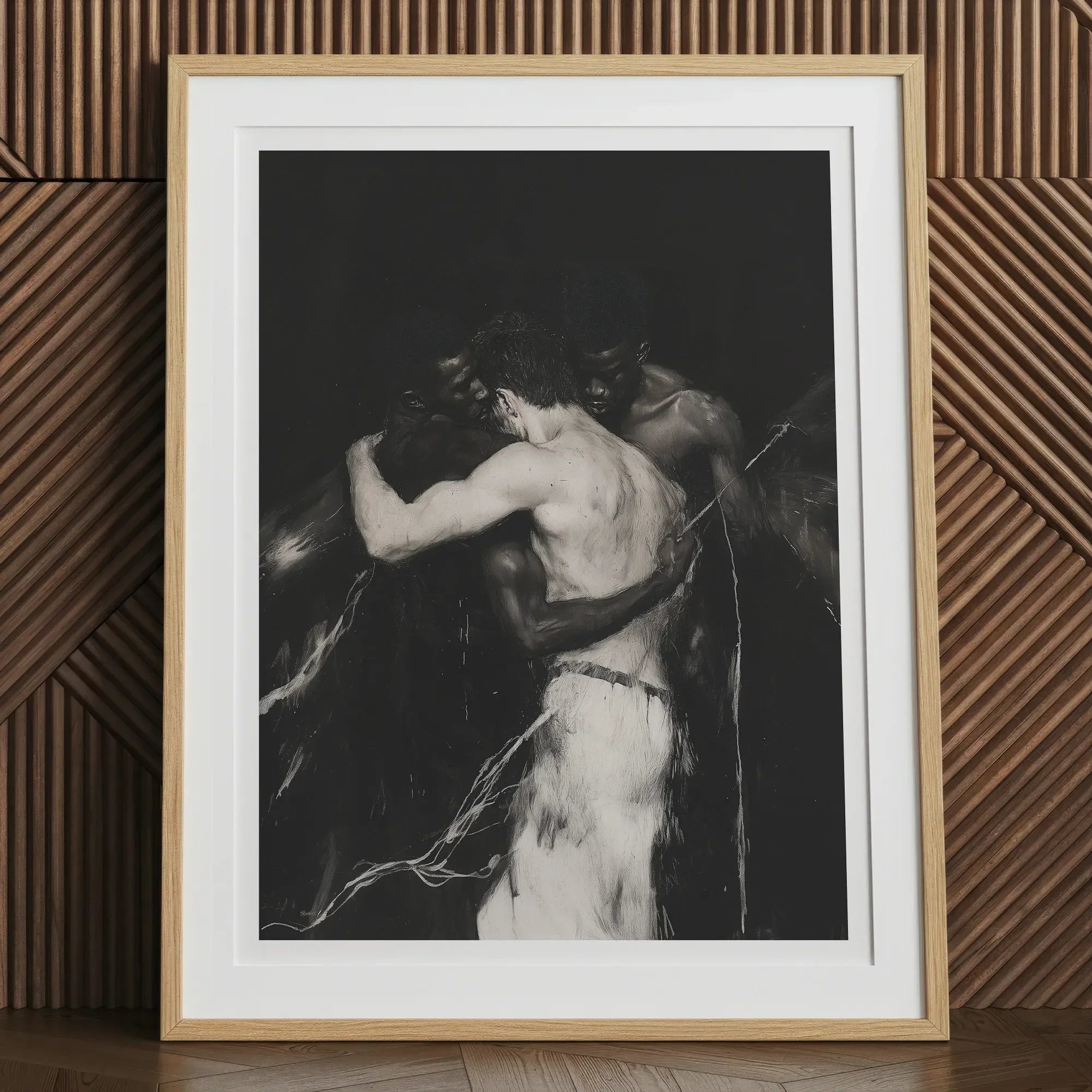 Three bodies chained by heat, knotted by want, mid-climax of an unnamed ritual. Two Black men wield arms sculpted in stark crescents. The white middleman limp with surrender. Swaddled in the cult of collision. Locked in a muscle-lit hymn of sweat-slicked submission. A stolen motel room mass. A psalm whispered in push and thrust.