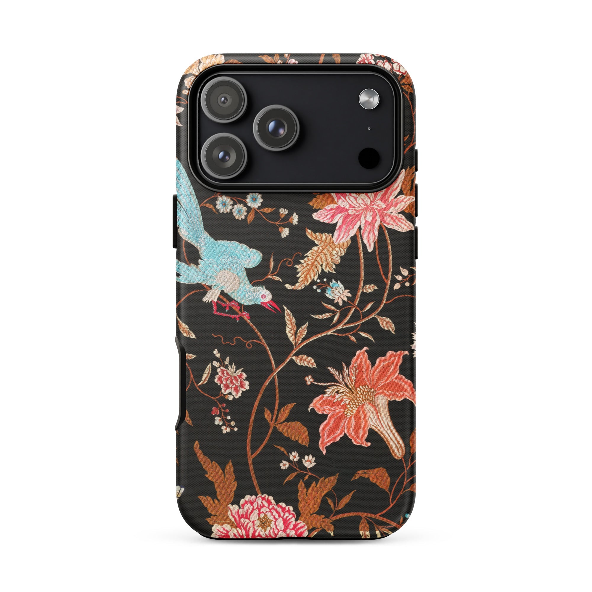 Behold, a nocturnal revelry of nature's finest, immortalized on your iPhone case. This 19th-century textile design transforms your device into a portal to a moonlit soirée where flora and fauna frolic with unbridled exuberance.
