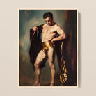 This framed canvas revels in baroque opulence, where homoerotic fine art meets old-world grandeur. The play of velvet against skin, the gleam of gilded fabric—every detail an invitation, every contour a story of gay identity, erotic elegance, and defiant pride. A revival of classical male beauty, seen through the lens of contemporary queer artistry.
