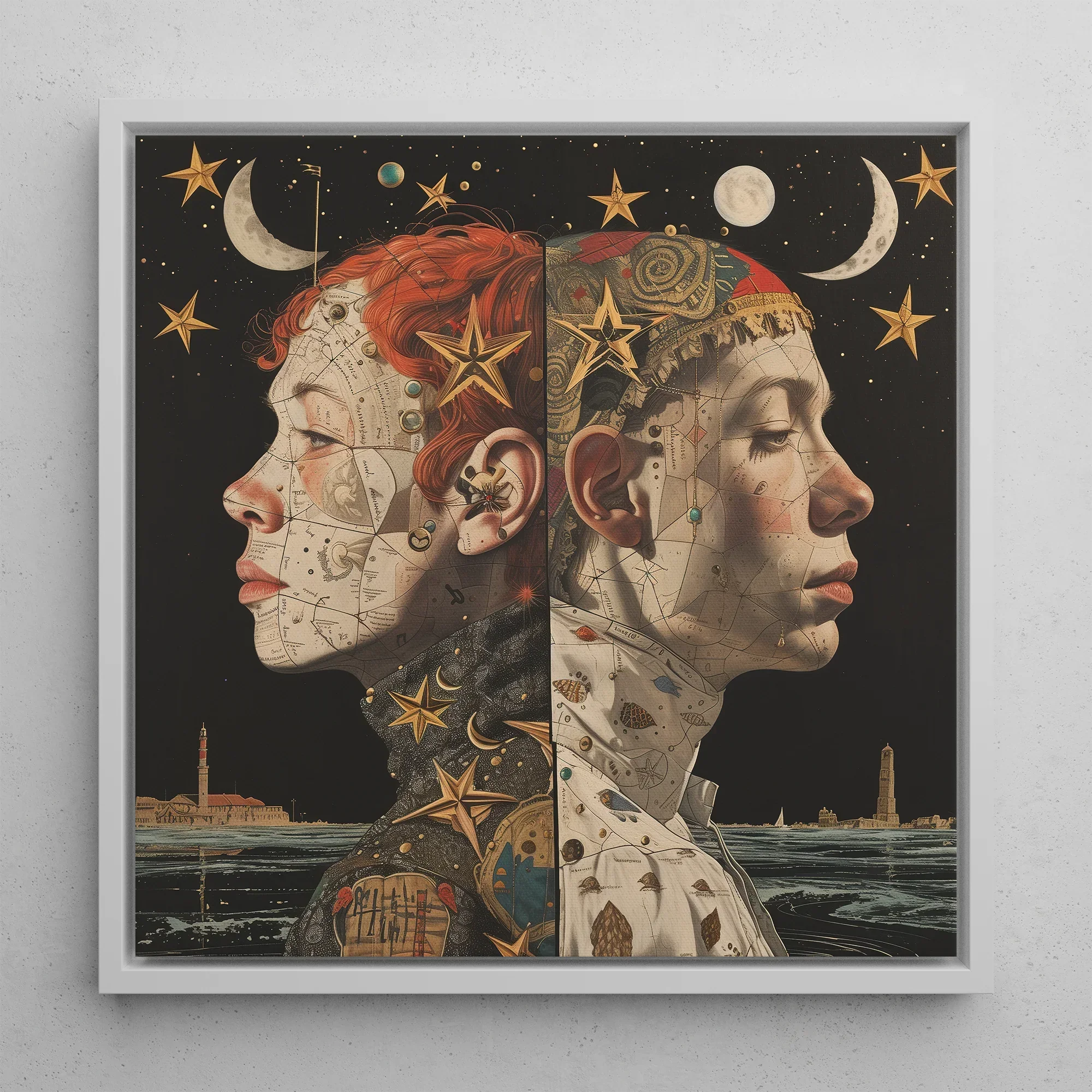 Beneath a sky thick with prophecy, two figures emerge—lesbian twins in spirit, divided by time. Their faces are constellations of forgotten myths, cartography of the infinite. One burns in the gold of vanished empires, her hair ember-bright, her gaze a map of lost kingdoms. The other, a whisper of lunar elegy, draped in the hush of deep tides, her breath the rhythm of an unseen clock. They do not speak. They have spoken for centuries in the language of mirrored souls.