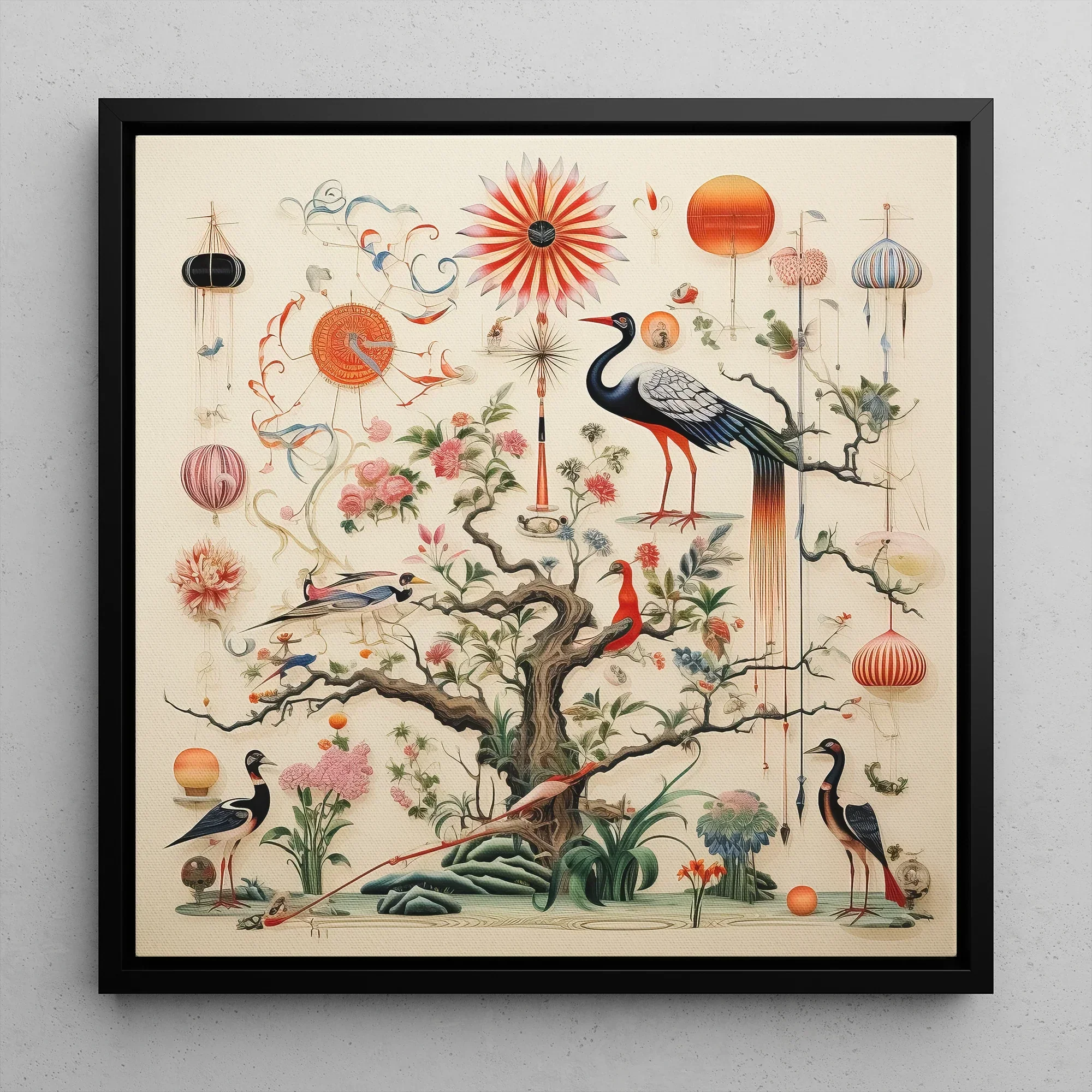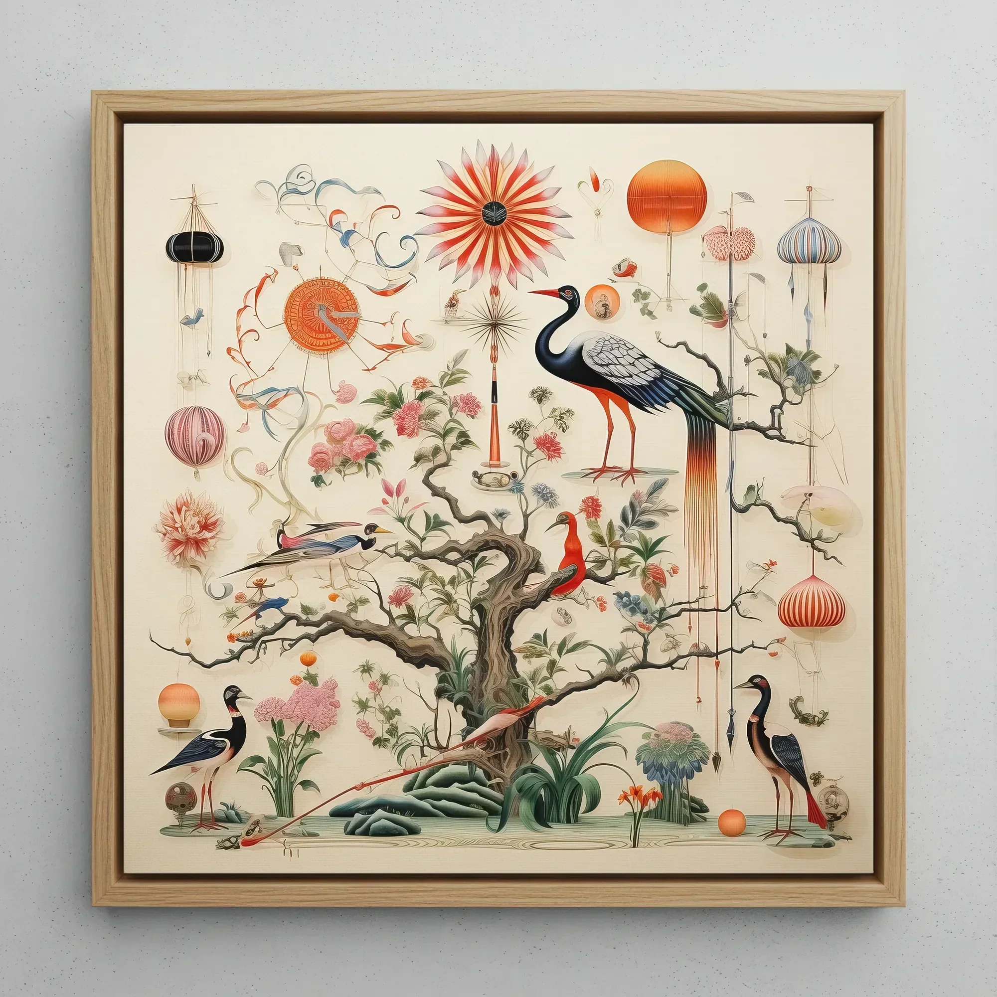 This exquisite composition centers on a gnarled tree teeming with exotic avian life, surrounded by a phantasmagoria of floating lanterns, vibrant blooms, and celestial orbs. The artist's mastery of color is evident in the harmonious blend of coral pinks, deep blues, and luminous oranges against a neutral backdrop. Each element, from the long-legged waders to the intricate floral patterns, is rendered with meticulous detail, inviting prolonged contemplation.