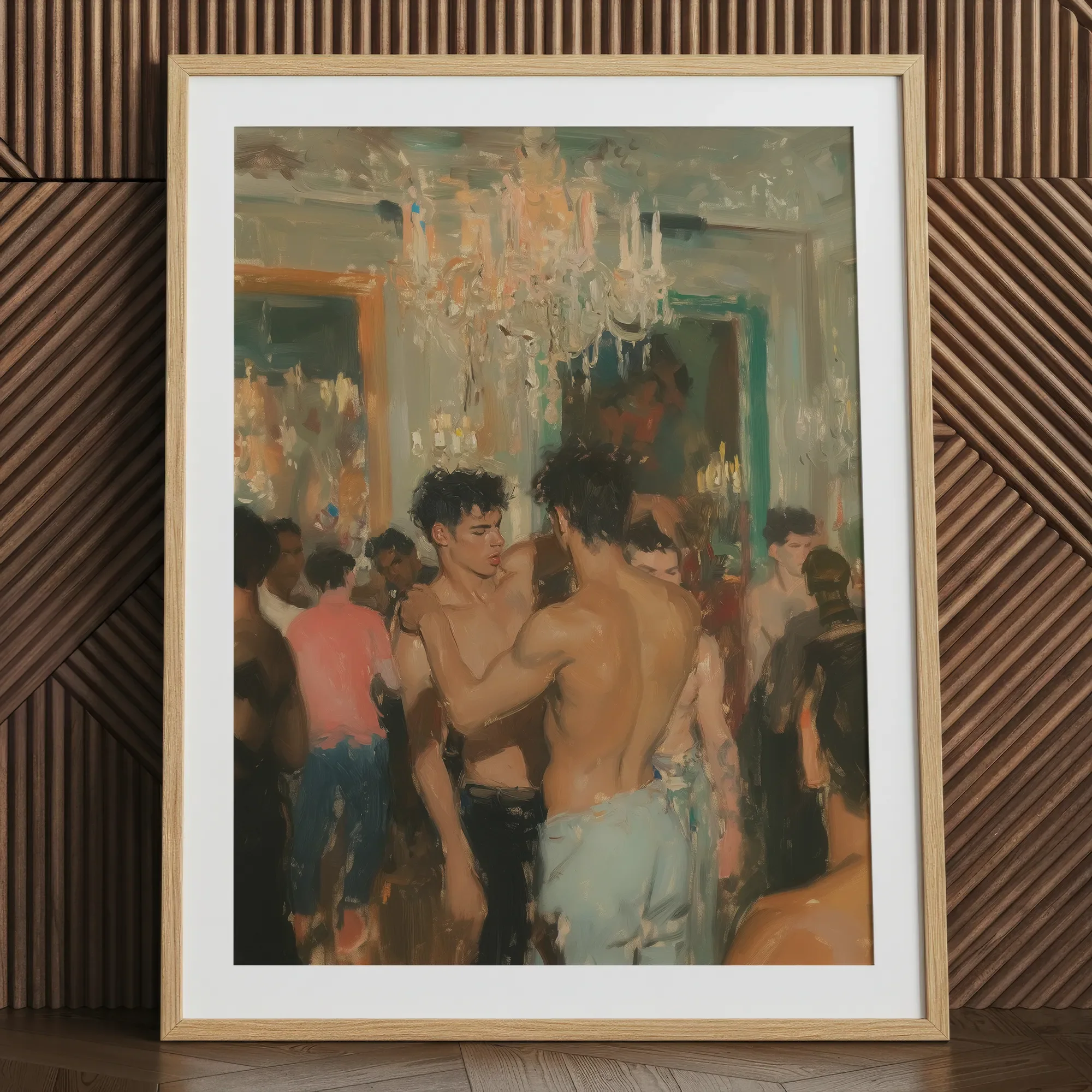 This vintage gay circuit party melds emotional male intimacy with the electric pulse of contemporary queer nightlife. A chandelier topped dancefloor turned altar. Reclaiming ballroom culture as sacred space. It speaks of Fire Island party aesthetics, queer impressionism, and LGBTQ+ joy steeped in history. Art refracted through tenderness. Painterly queer romance born from collective remembering. A dream not just danced—but relished.