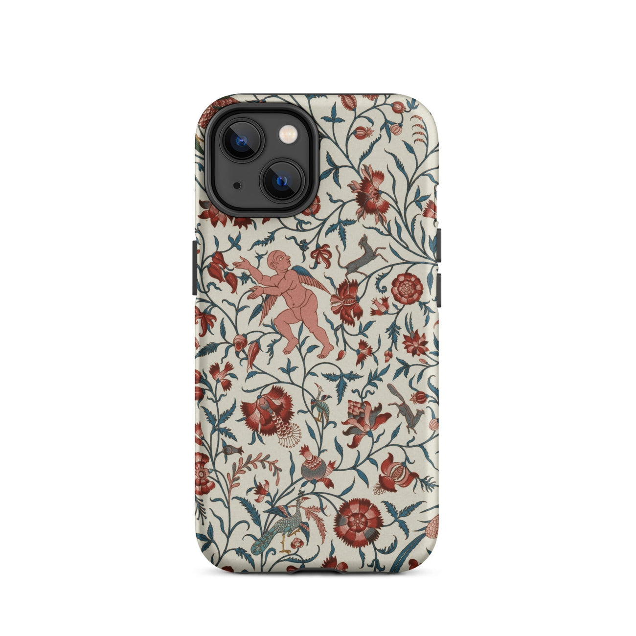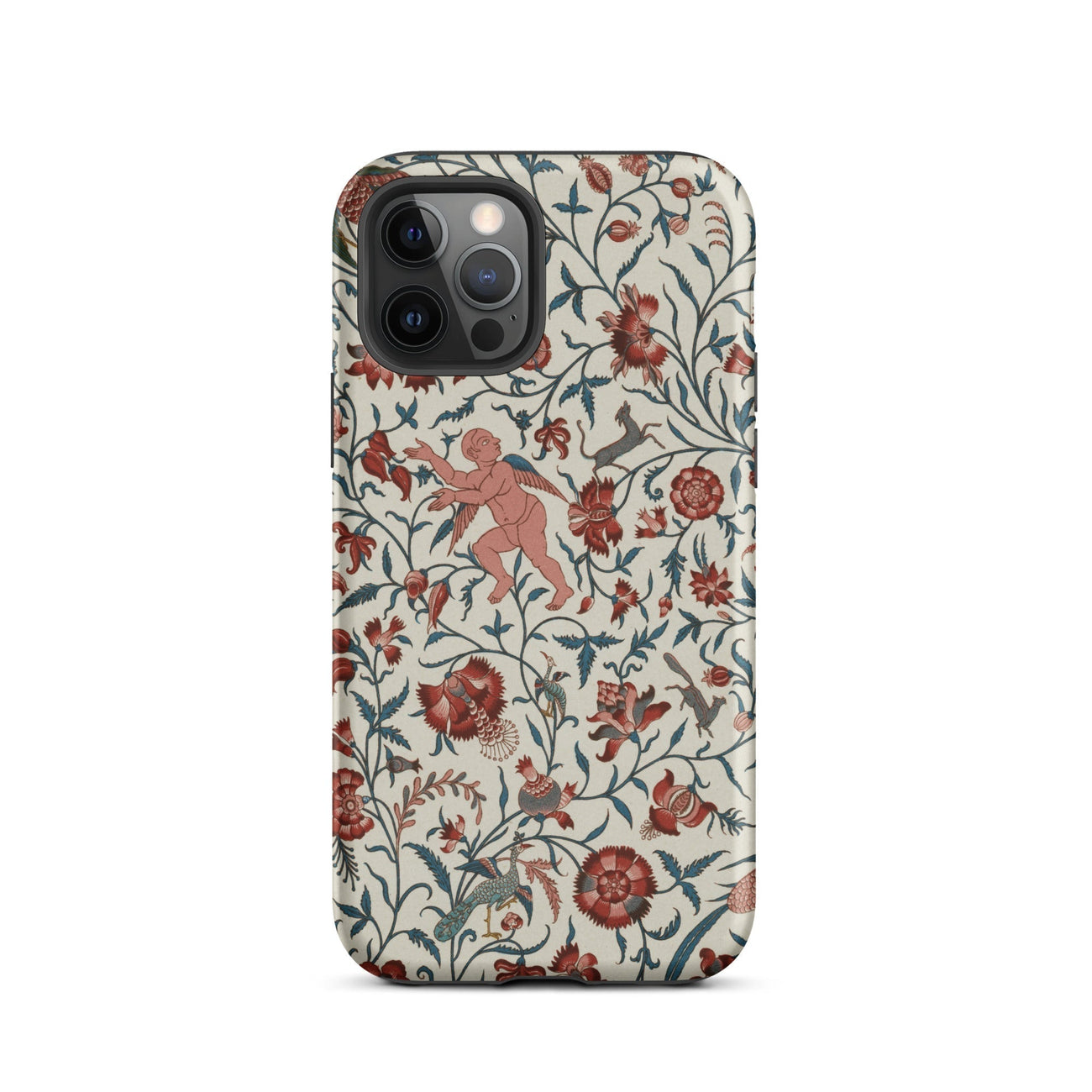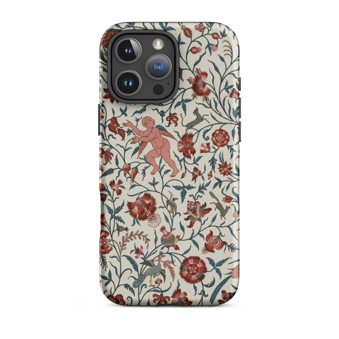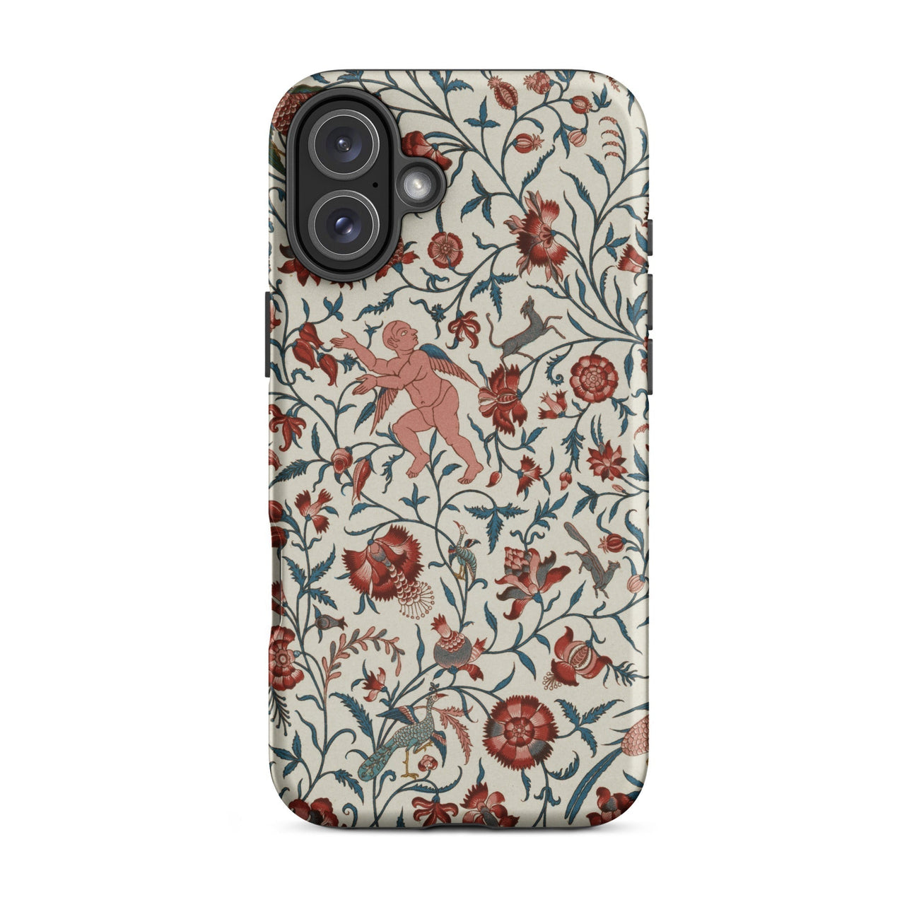 Cradle a portal to Persia in your palm with an iPhone case adorned by Auguste Racinet's kaleidoscopic vision. Lush tendrils of teal and crimson intertwine, birthing exotic blooms that pulse with life. A chubby cherub cavorts amid pomegranates and carnations, his flesh a rosy rebellion against the ivory backdrop.
