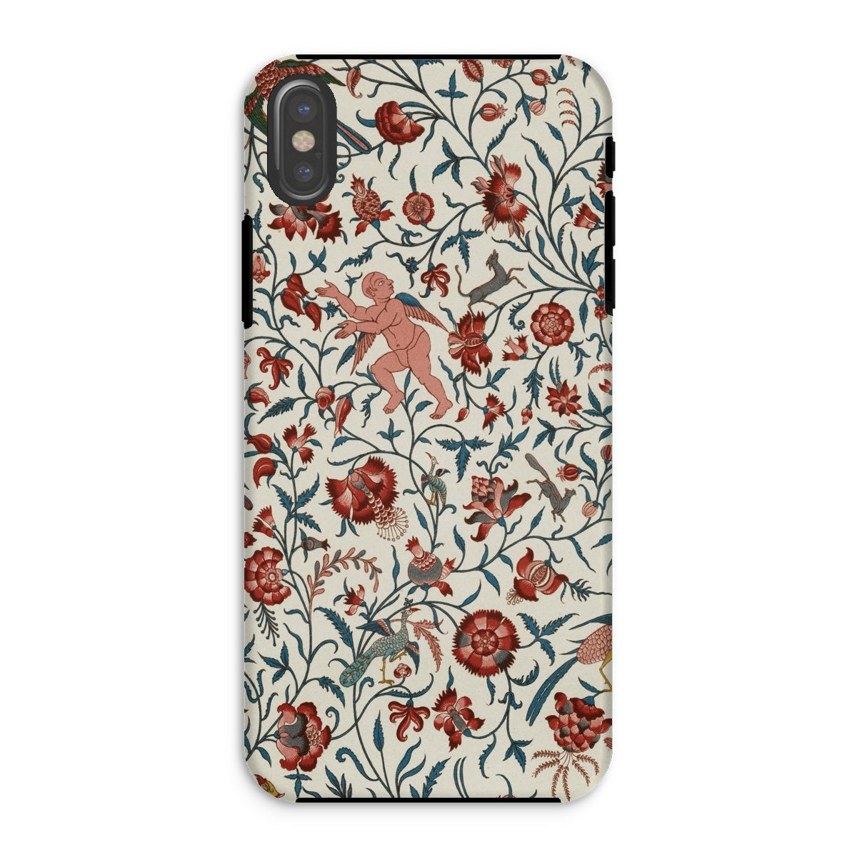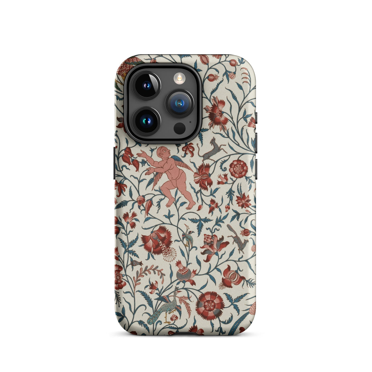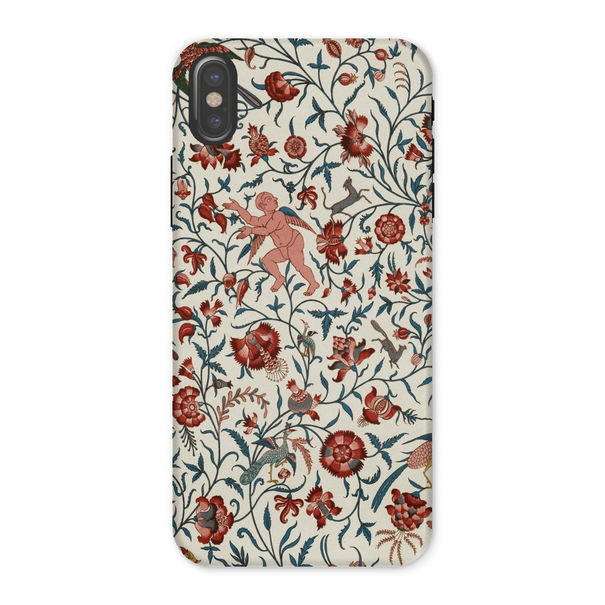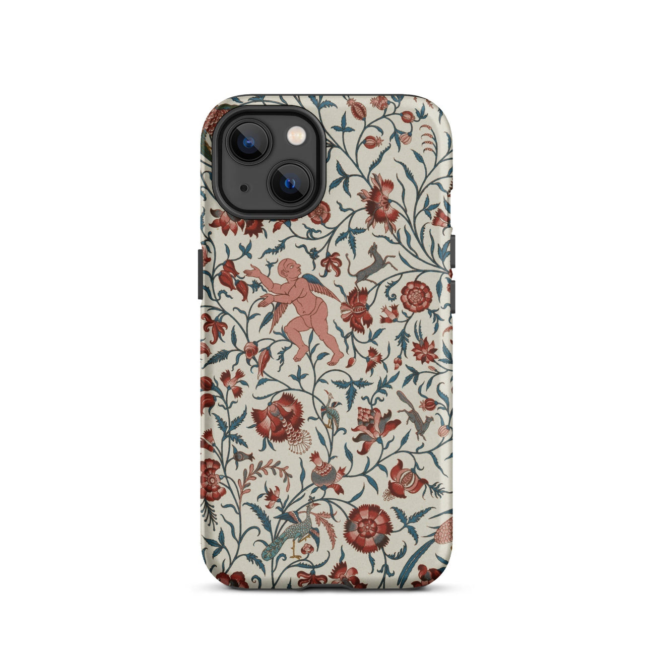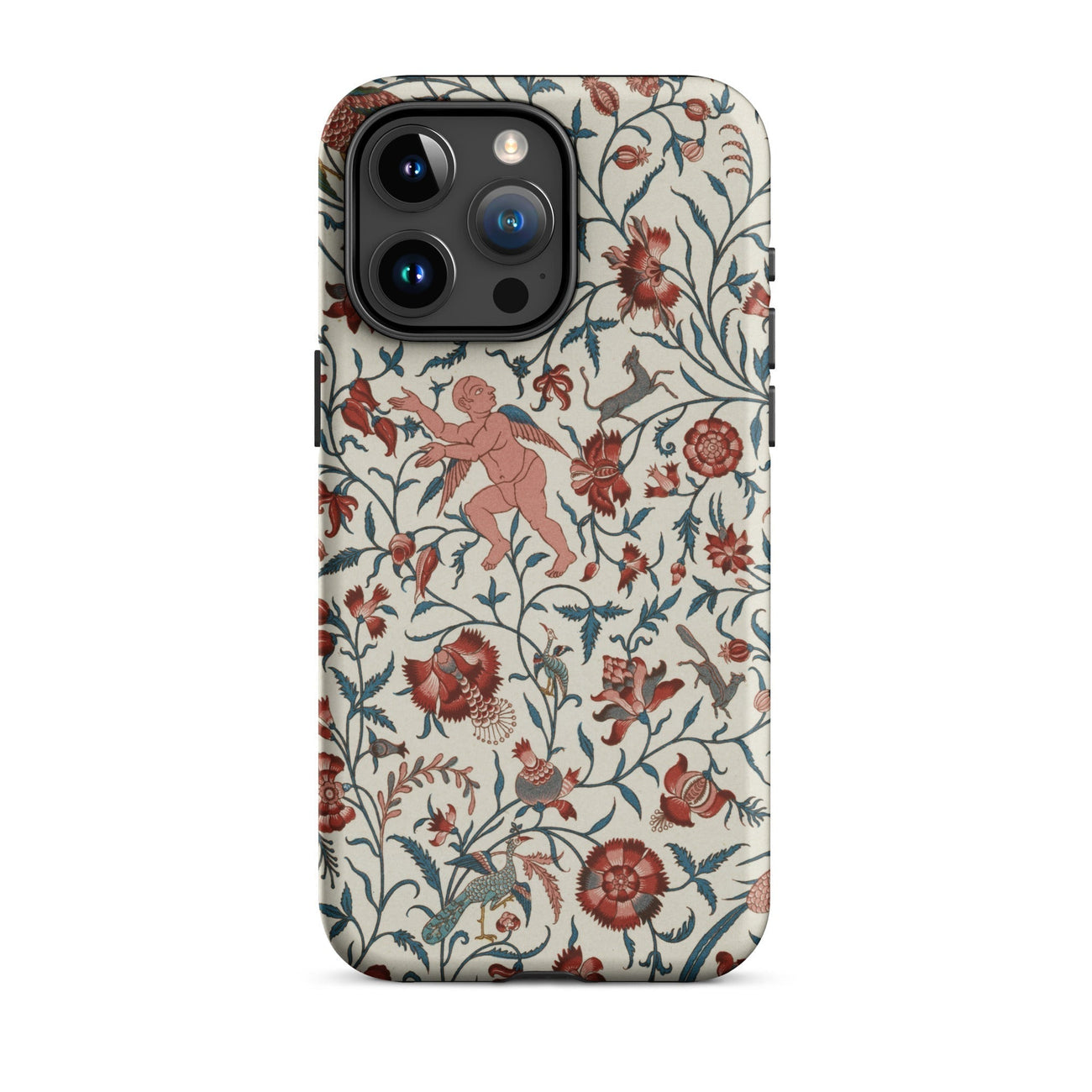 Cradle a portal to Persia in your palm with an iPhone case adorned by Auguste Racinet's kaleidoscopic vision. Lush tendrils of teal and crimson intertwine, birthing exotic blooms that pulse with life. A chubby cherub cavorts amid pomegranates and carnations, his flesh a rosy rebellion against the ivory backdrop.