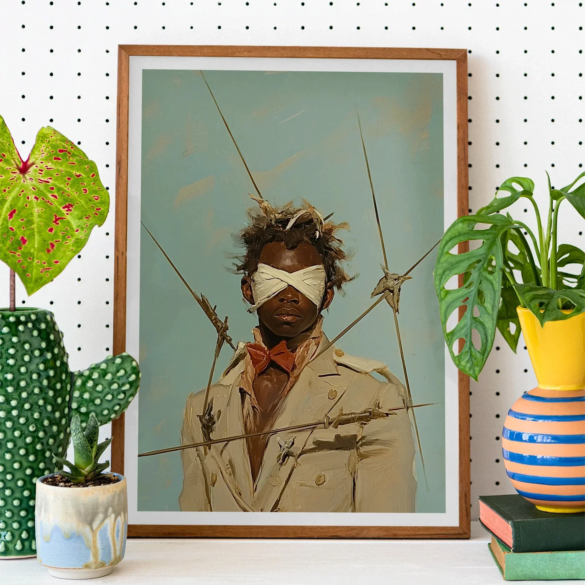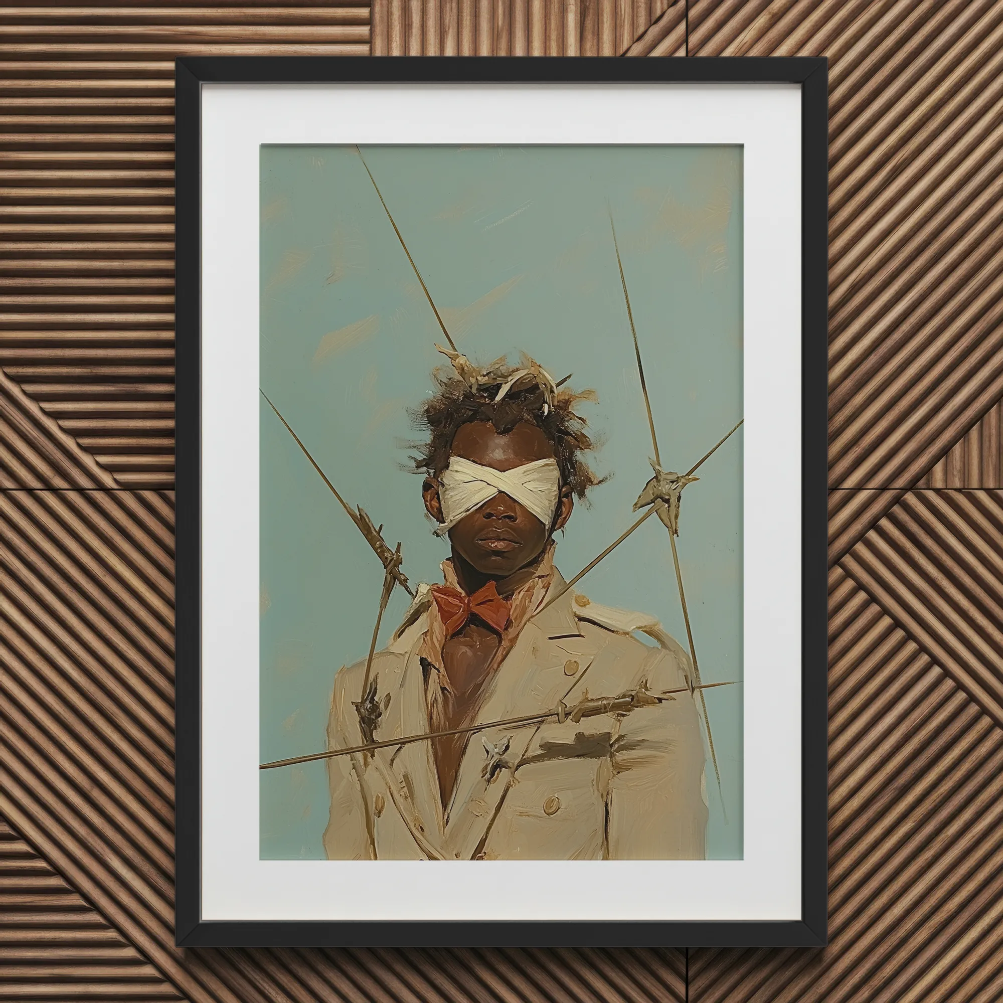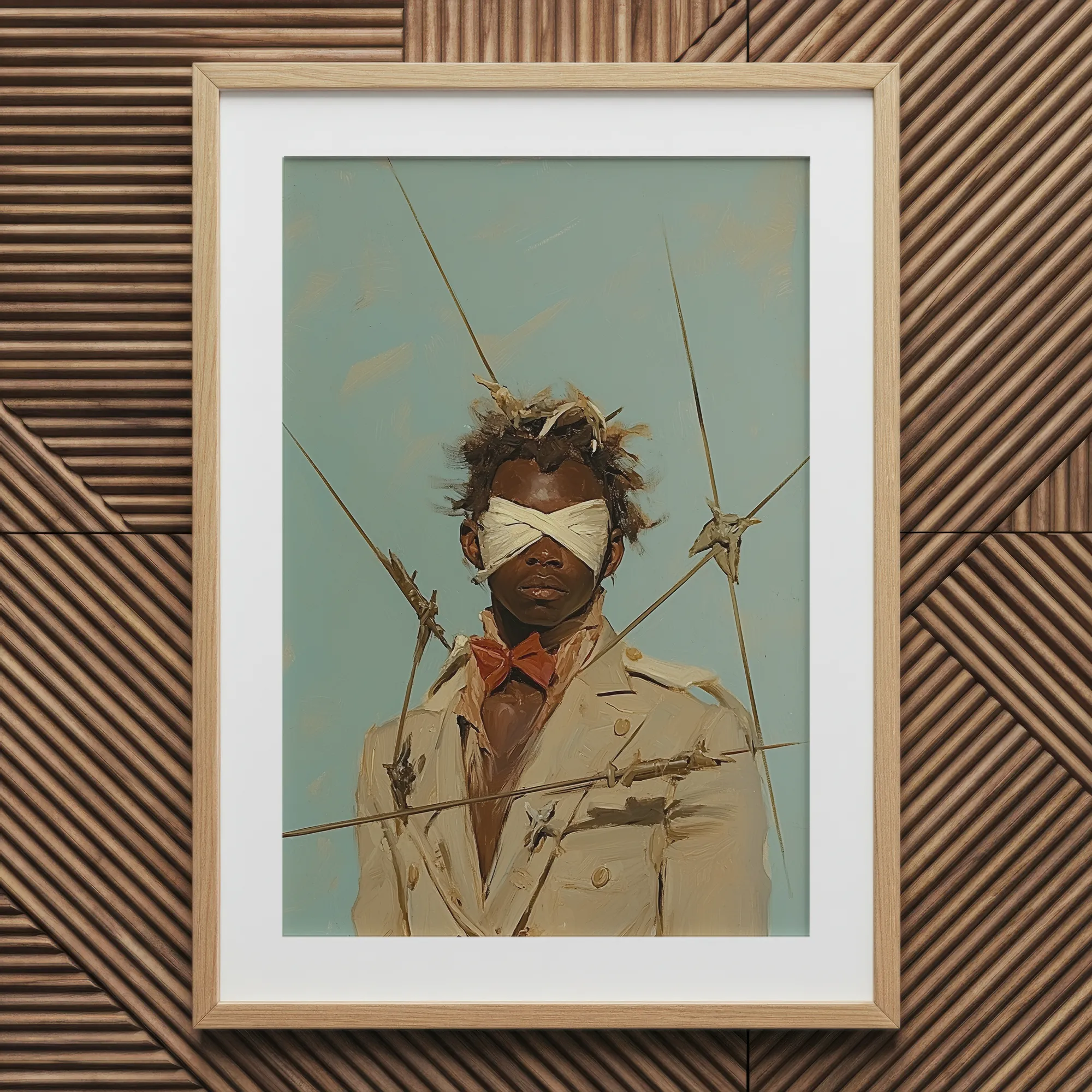 The arrows don't pierce, but they're tethered. Not weapons, but tools of ritual triangulation. Each line a question he never answered aloud. Their arrangement intimate. Almost anatomical. His stillness completing their geometry.