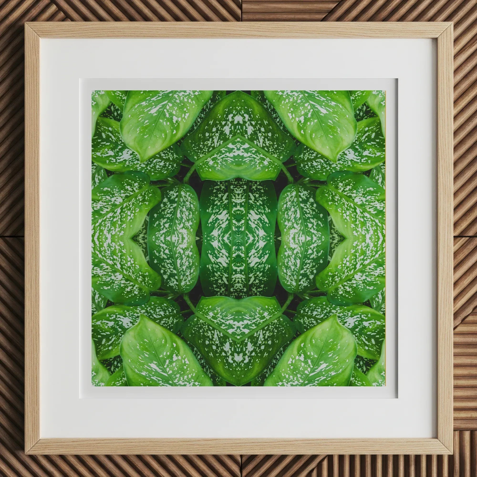 Dive into a kaleidoscope of chlorophyll with this Pitter Splatter tropical leaf art print. You're not just looking at leaves – you're peering through nature's funhouse mirror. Symmetry gone wild, this modern botanical print transforms lush Dieffenbachia foliage into a hypnotic mandala.