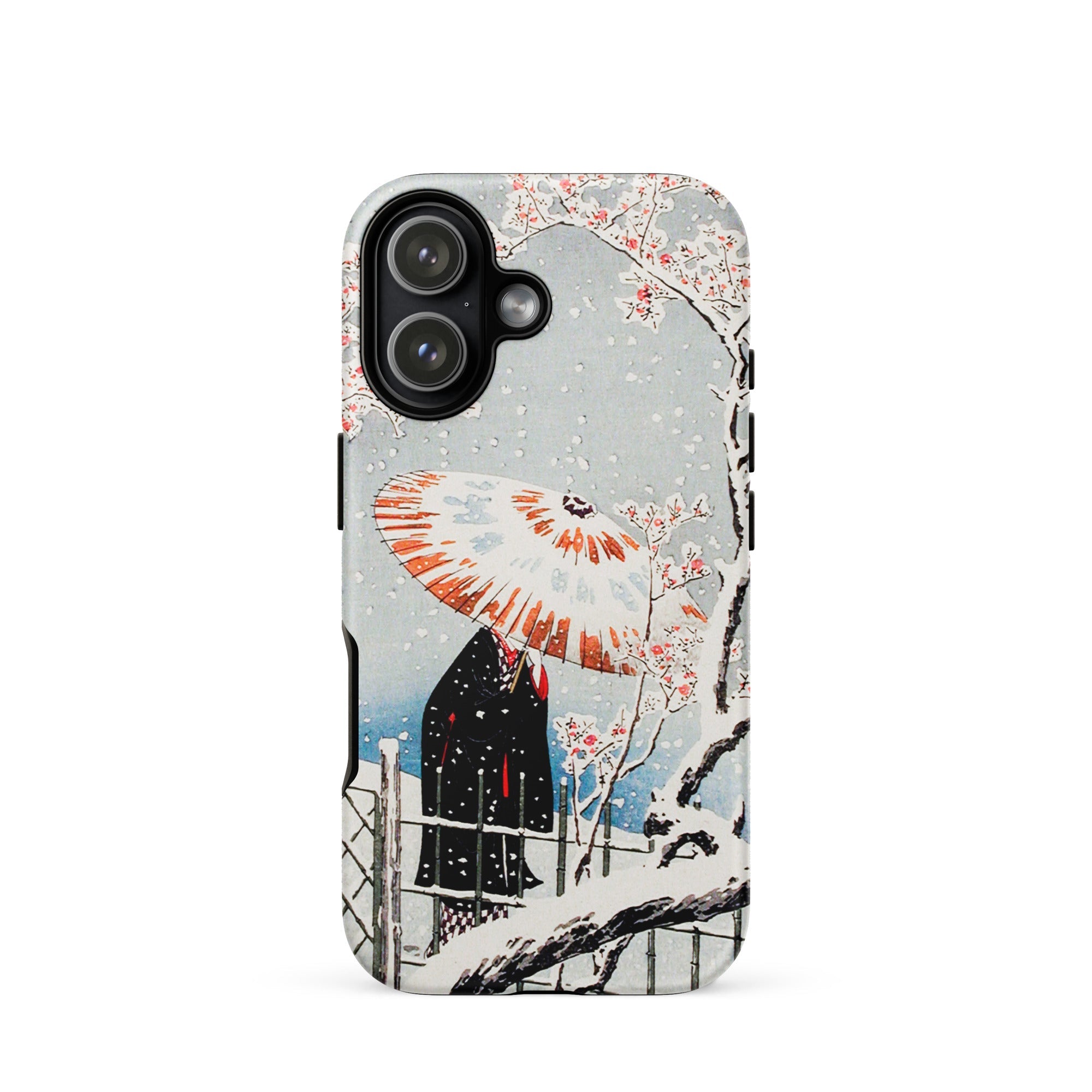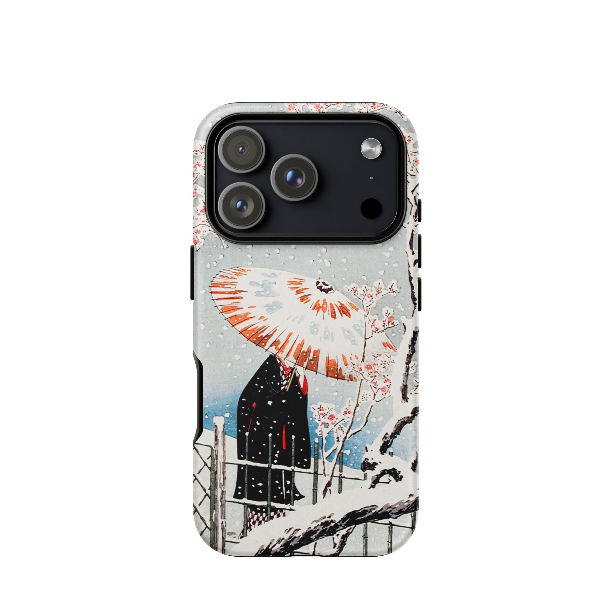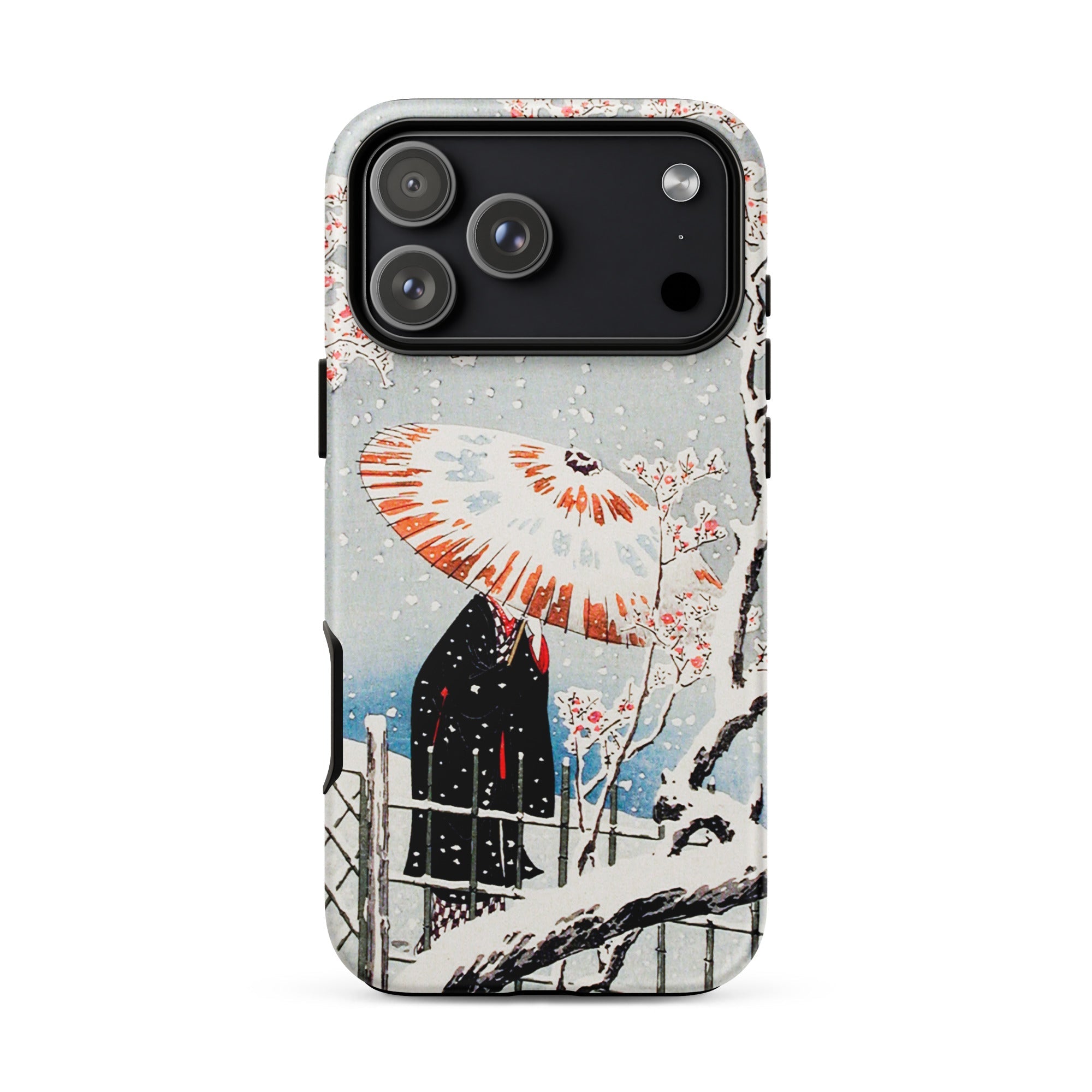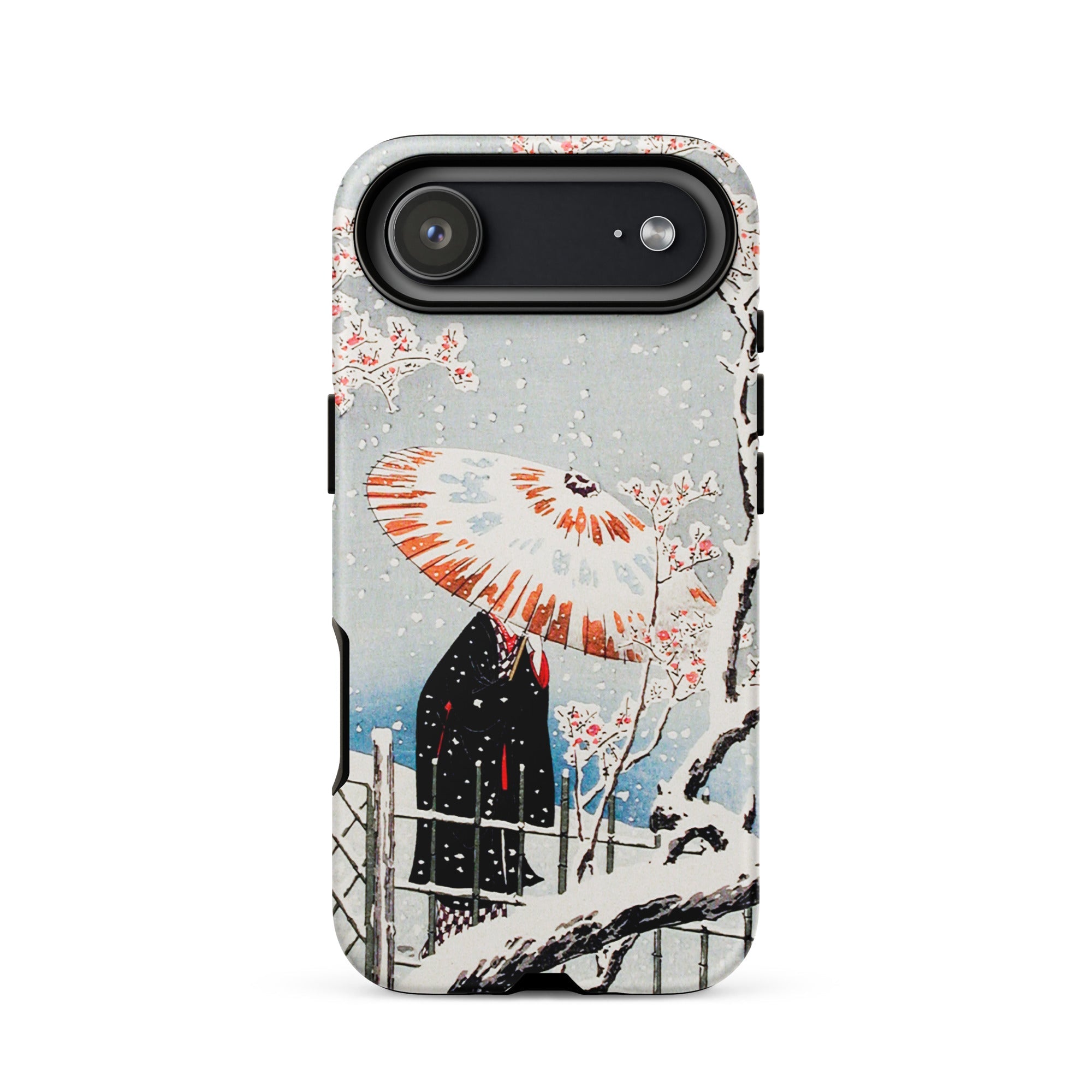 As your fingers trace the contours of this case, you'll feel the quiet strength of the kimono-clad figure, sheltered beneath a traditional oil-paper umbrella. The expertly rendered woodblock print technique brings to life the gentle snowfall and the crisp winter air. This isn't just a phone case; it's a portal to Japan's rich artistic heritage.