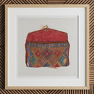 The intricately woven textile showcases a kaleidoscope of hues - rich reds, deep blues, and earthy browns dance across the canvas. Diamond motifs and geometric patterns evoke the spirit of Art Deco, while the weathered leather and frayed edges whisper tales of adventures past.