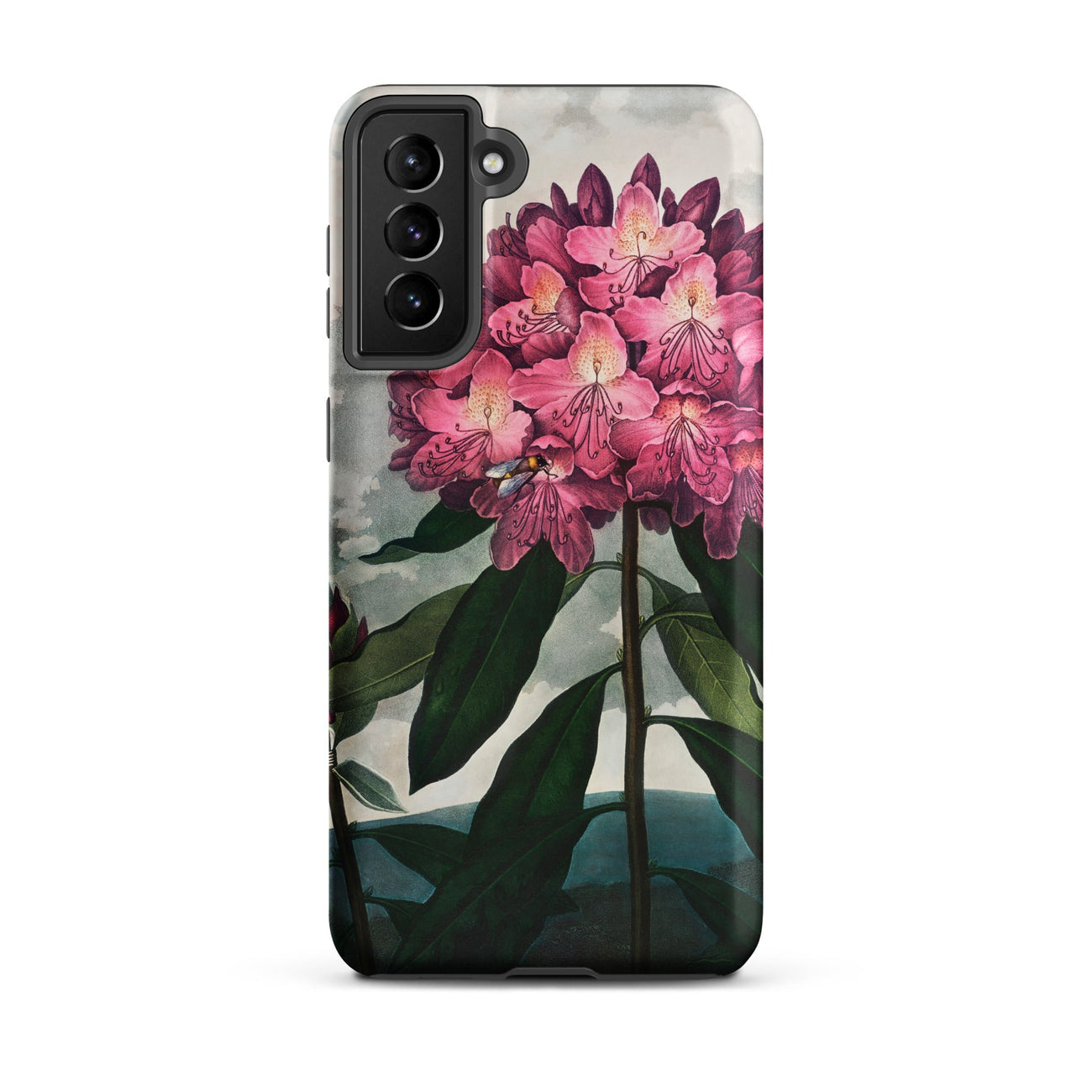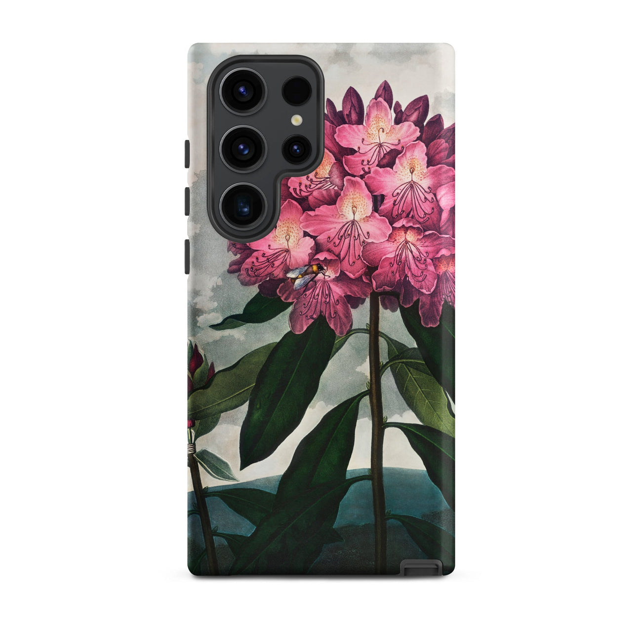 A bee hovers close, caught in the act of pollination, bringing motion into stillness. The towering stalks frame distant hills, painted with cool blue shadow, creating a stage where science and Romantic imagination intertwine. This Samsung case captures the eighteenth-century marriage of botany and art, a floral study elevated to grandeur.