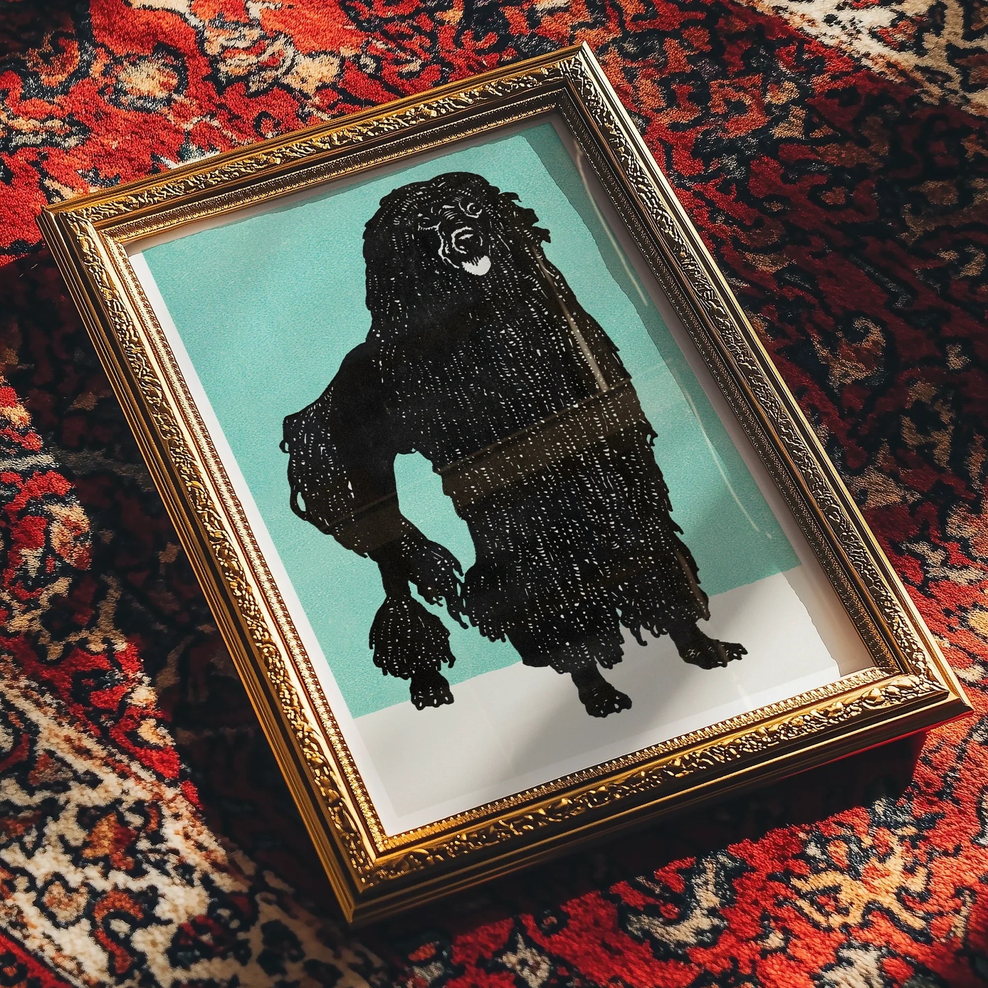 You'll be captivated by this canine charisma explosion that's about to glamorize your wall space. Moriz Jung's 1912 Poodle isn't just a vintage graphic dog art print - it's a modernist manifesto with a wagging tail — and gorgeous, of course. This woodcut wonder transforms fluffy into fiercely fabulous, with a jet-black silhouette that pops against an aqua backdrop.