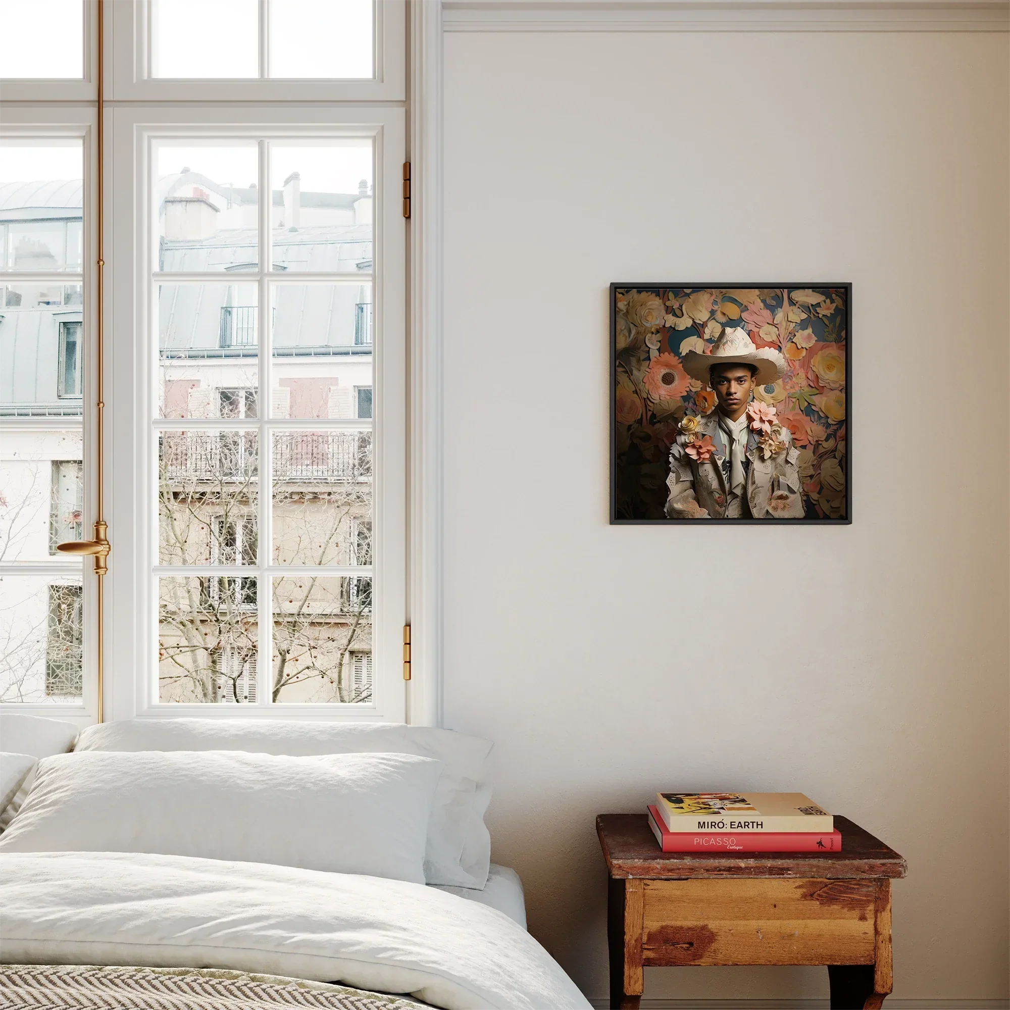 The backdrop is a lush expanse of paper-cut blooms, a surreal garden that sways between reality and dreamscape. Here, Presley doesn’t merely exist; he evolves in full color, a gay black twunk fuelled by endless grace and reclaimed power. A symphony of color and courage, rewilding cowboy legends one petal at a time.
