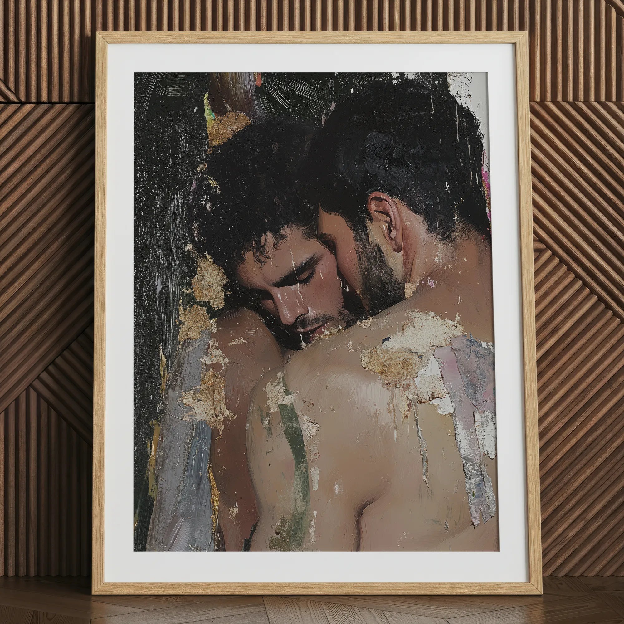 They erupt into the frame like saints of the sweat-drenched. An erotic gay couple with arms tangled, torsos gleaming, foreheads fused with the sacramental gravity of back-alley confessions. No halo, no incense, just the oily hush of skin pressed on skin. Searching the other for scripture written in touch and longing.