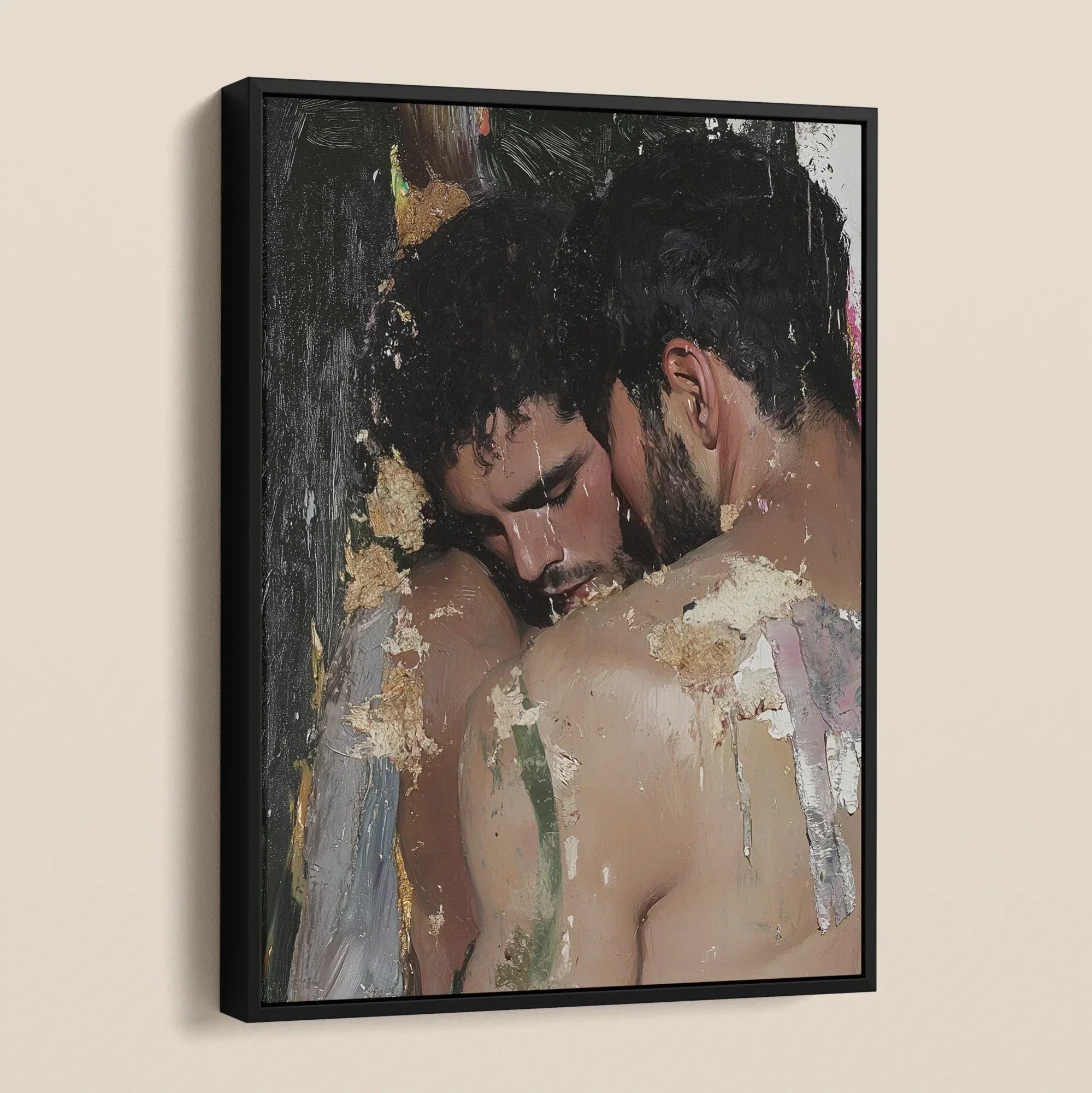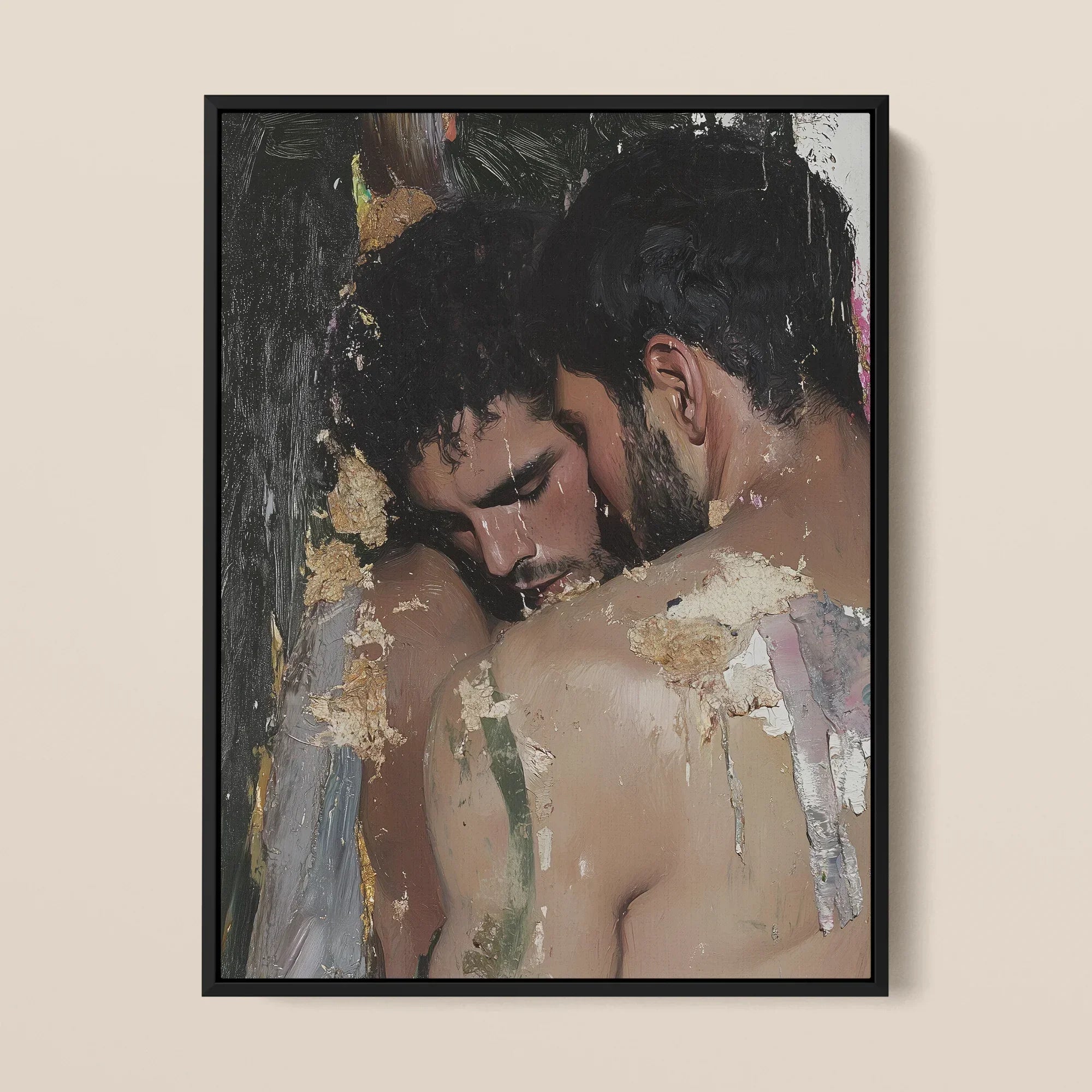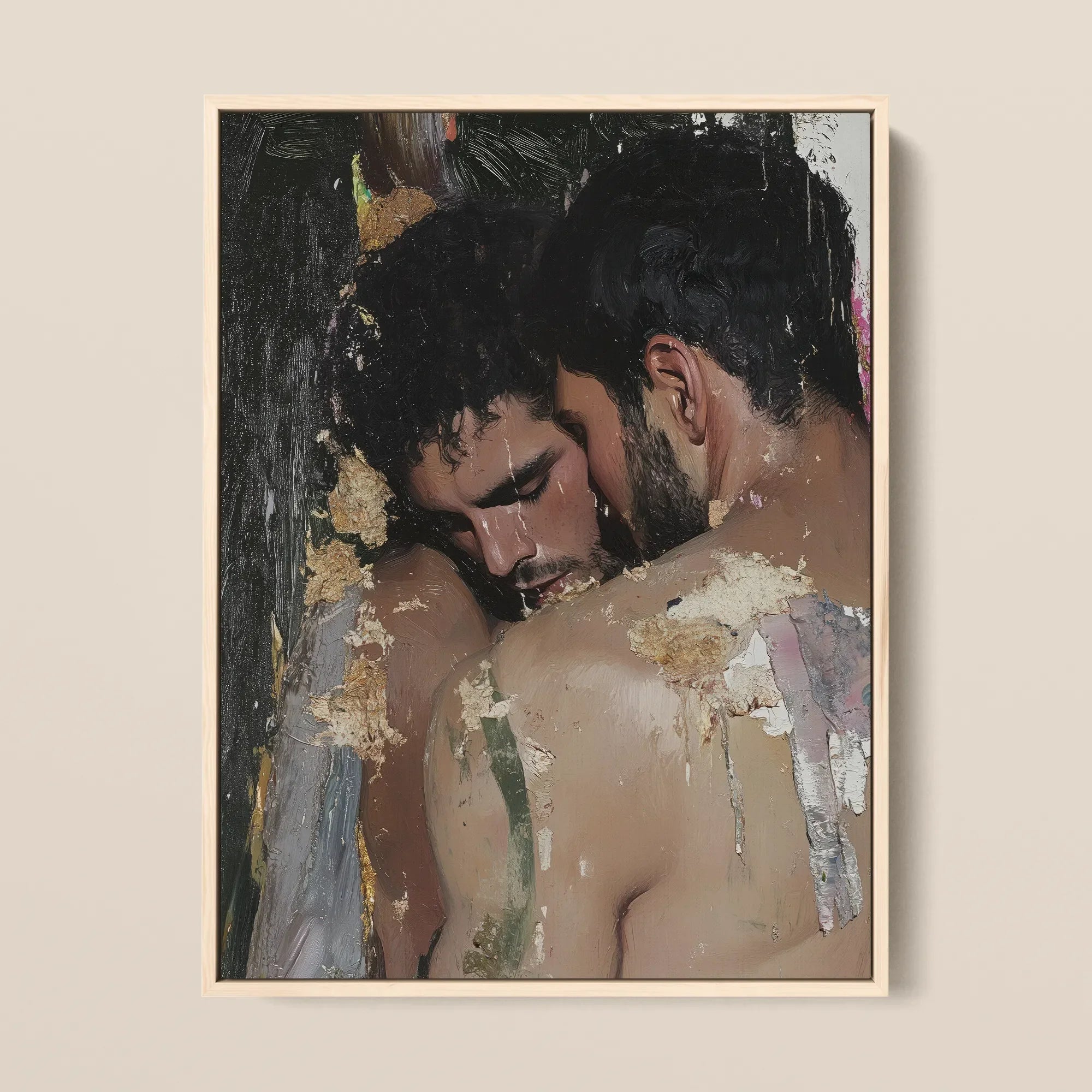 They arrive not as men but aftermaths. Cropped like a secret, their embrace denies the voyeur even as it flaunts. Erotic gay lovers pressed past language. As if kissing the inside of memory.