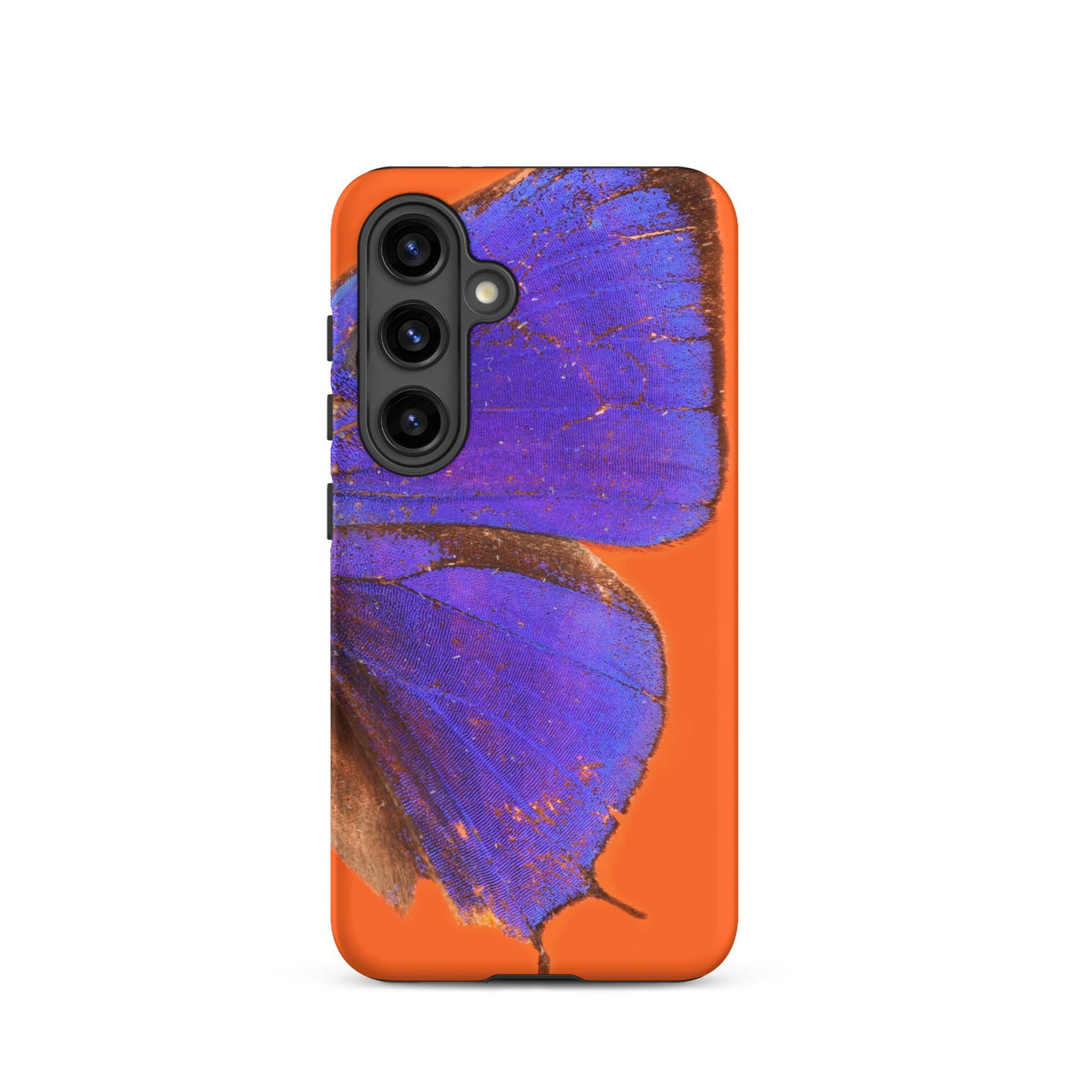 Against the case’s hot orange field, the blues surge louder, a visual chord recalling tropical fieldwork, archival plates, and the pulse of museum glass cabinets. This Samsung case transforms your phone into a traveling diorama: part entomologist’s sketchbook, part pop-art canvas.