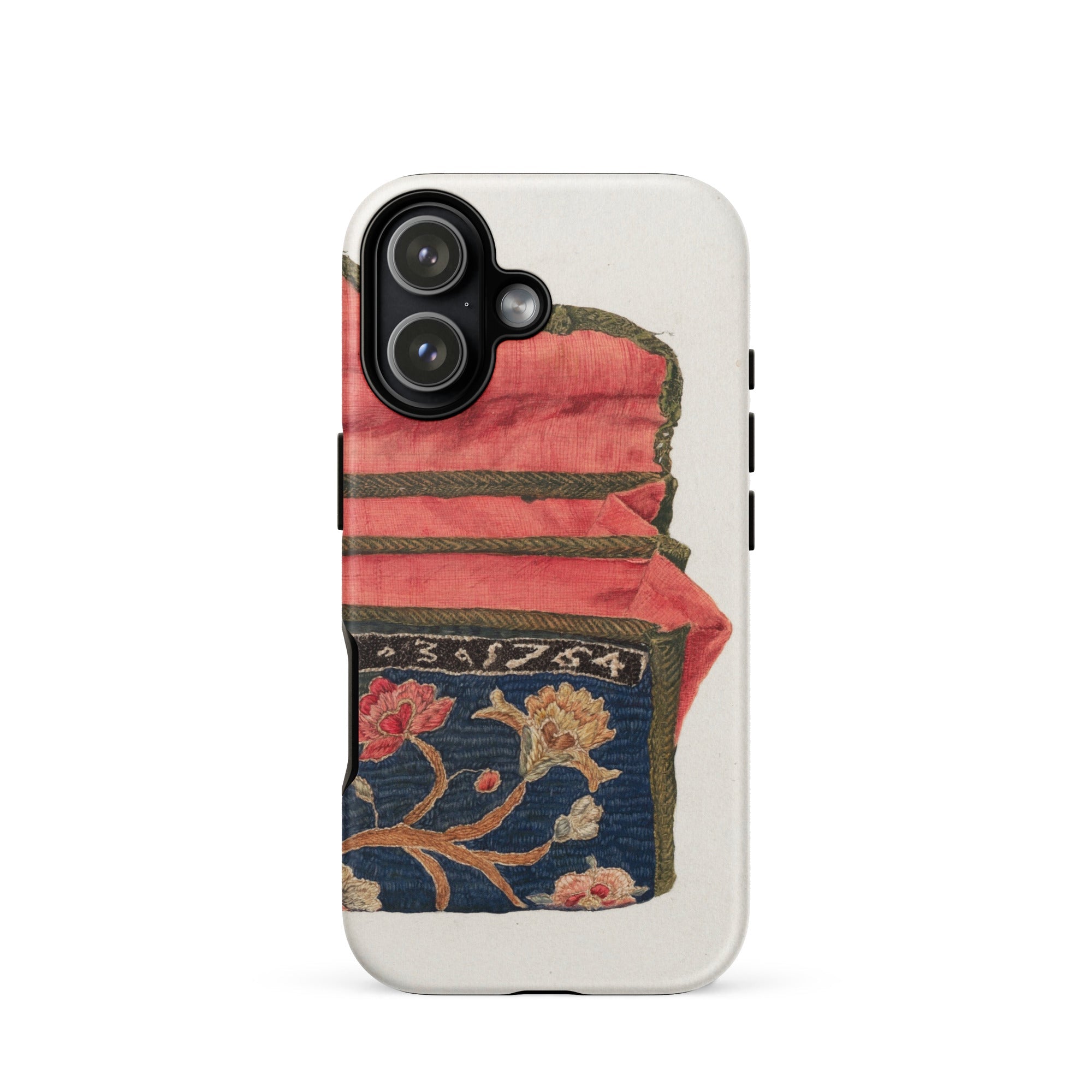 This iPhone case is a portal—where vintage craftsmanship meets contemporary form, where history lingers beneath your fingertips. The embroidered purse, an echo from the 1930s fashion world, unfolds in silken layers of coral and navy, its floral needlework blooming across time. Each stitch is a whisper, a remnant of heirloom textiles once cherished in an era of refinement and grace.