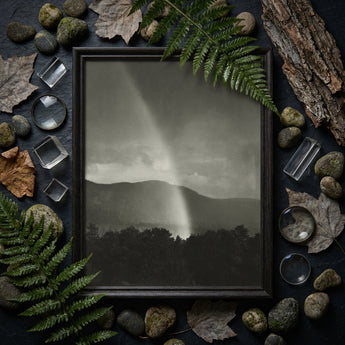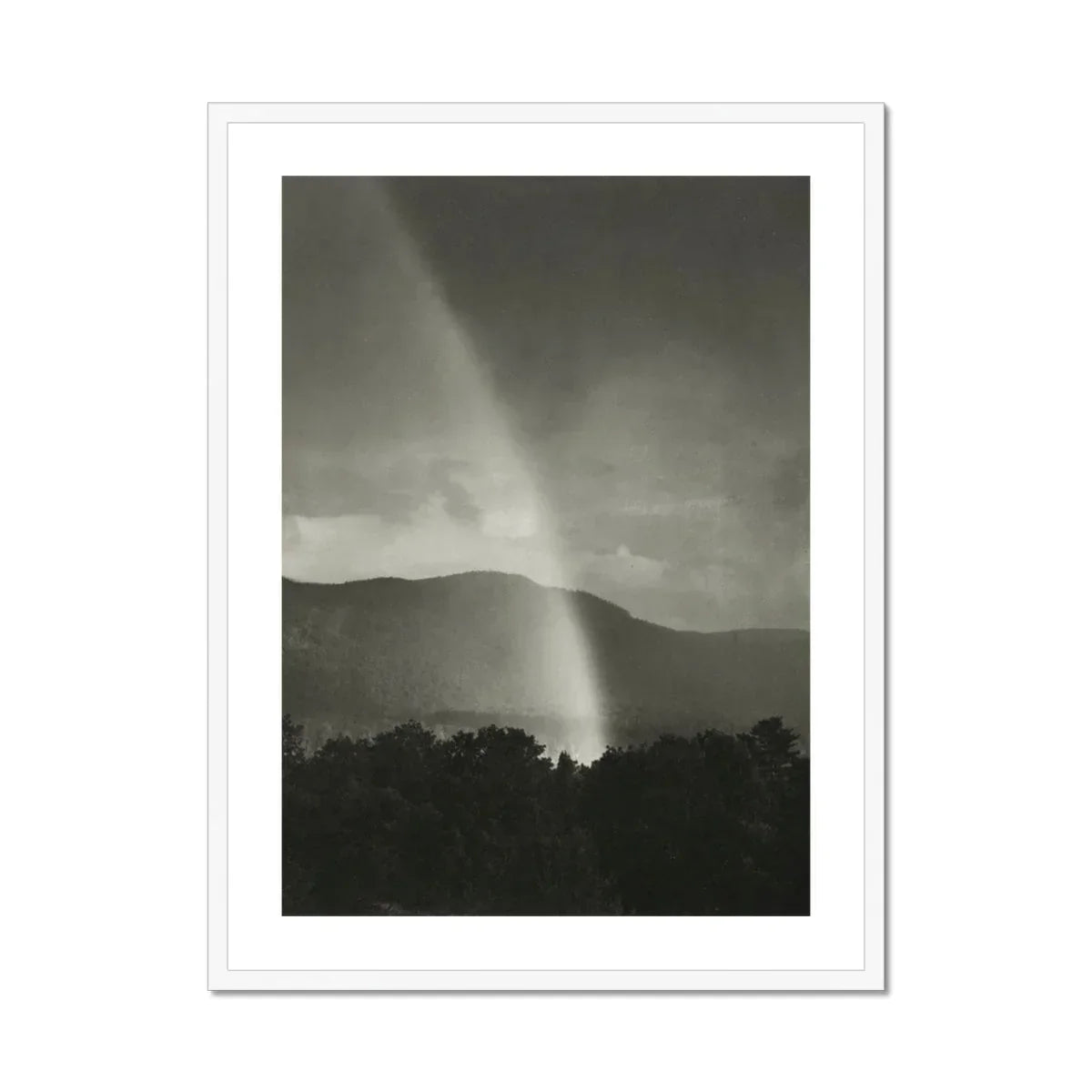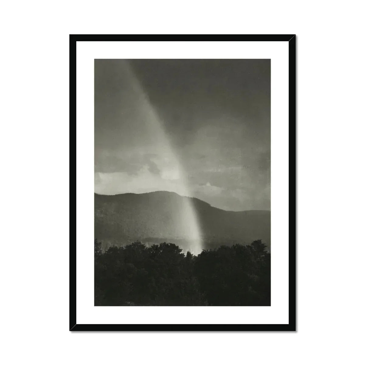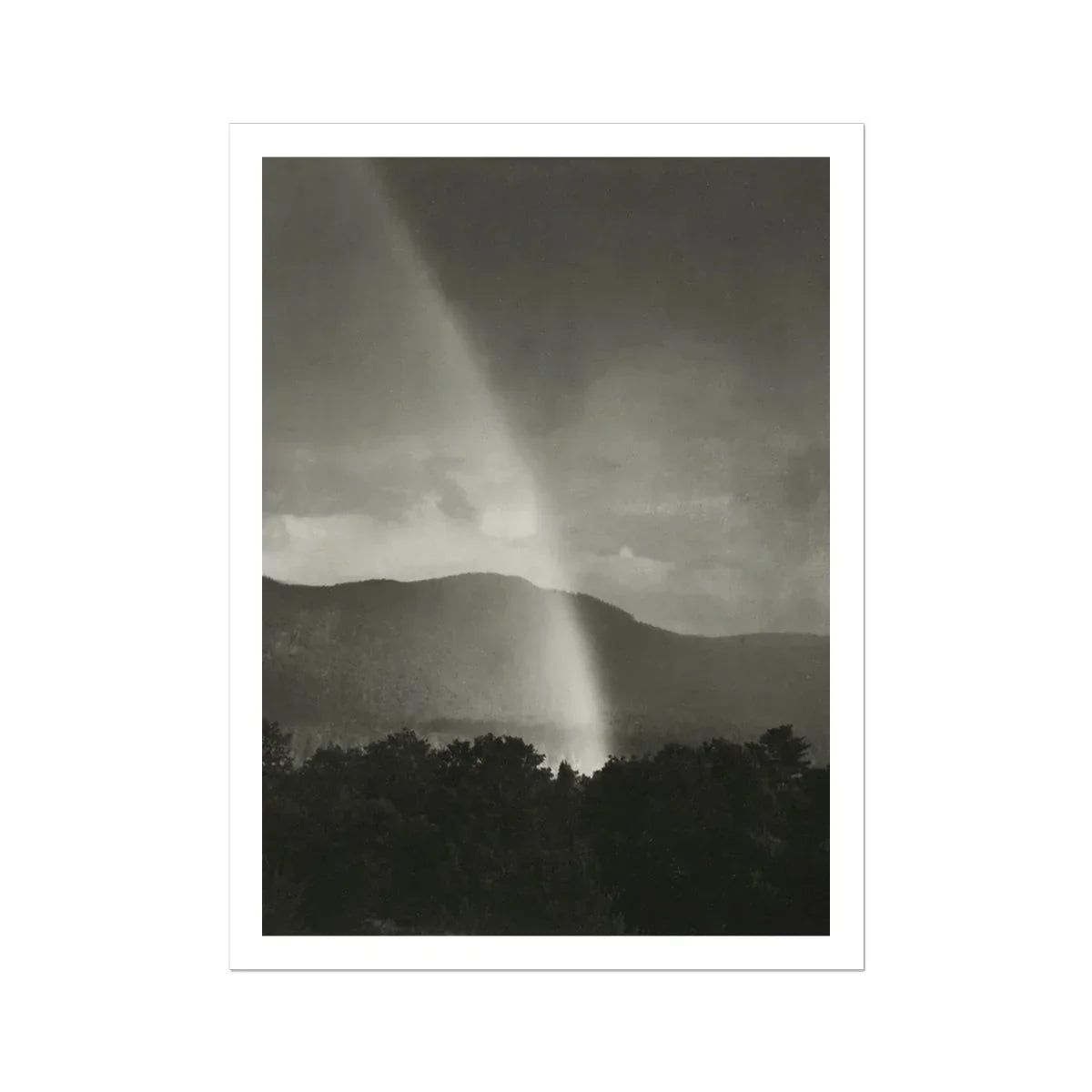 Stieglitz's masterful composition draws your eye upward along the ghostly beam, inviting contemplation of the ephemeral and sublime. The stark contrast between the radiant arc and the brooding sky evokes a sense of transcendence, while the silhouetted treeline grounds the image in earthly realms.