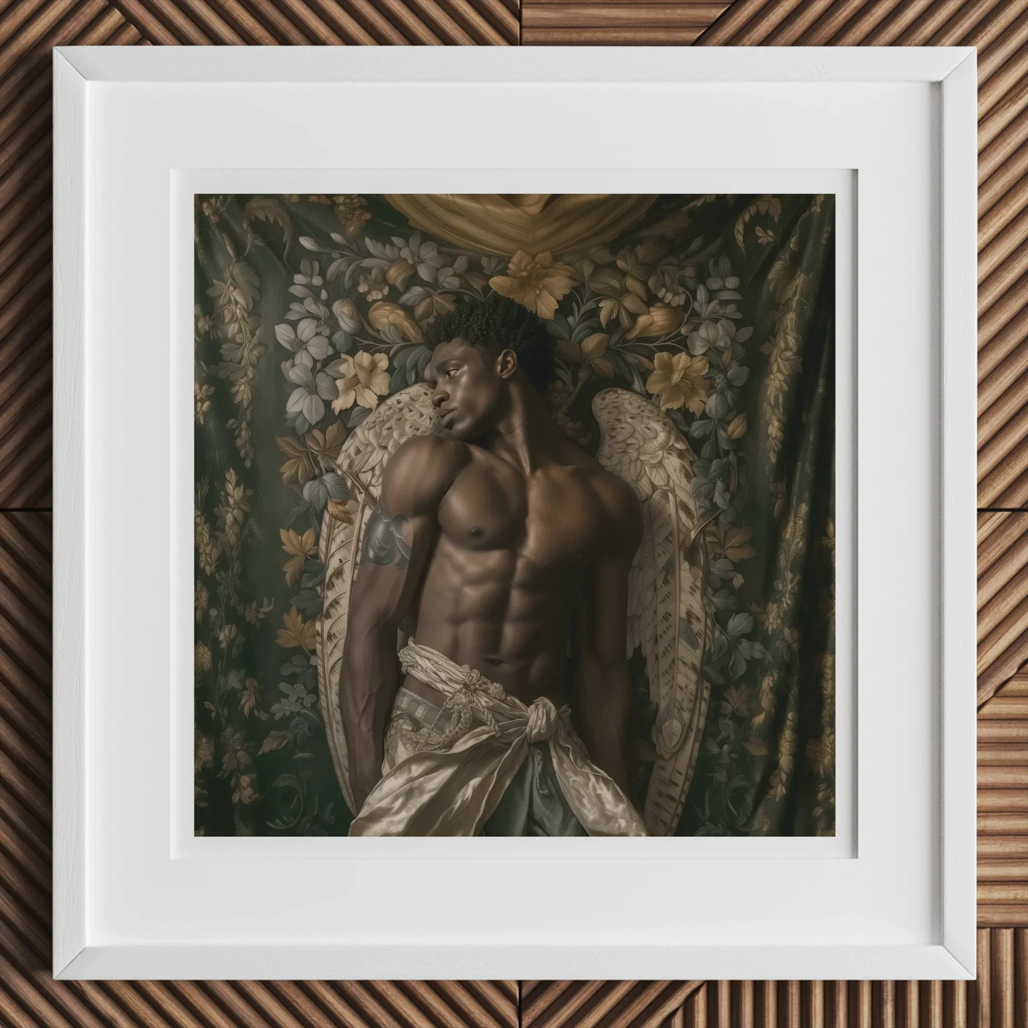 You have to catch your breath as Raziel emerges from the shadows. Carved in warmth and shadow. His wings like a silent sonnet. This gay Black angel is a figure of quiet strength. Draped in soft folds, each muscle is carved from light and centuries of reverence. His gaze, deep as midnight, inviting you into a space where earth meets heaven. To witness strength that’s tender and masculinity that’s ethereal. A queer reimagining of divinity fusing power, pride, and peace that defies gravity.
