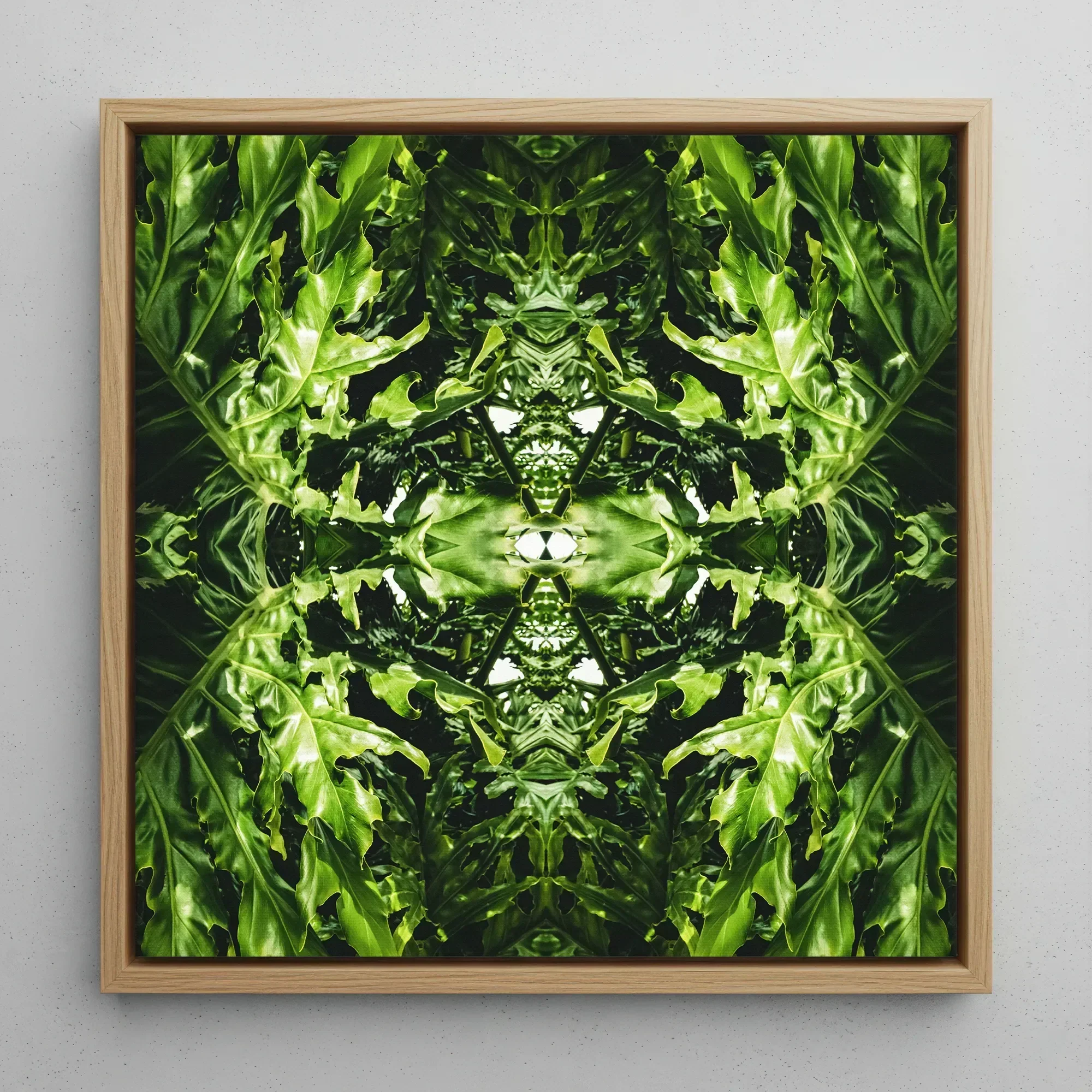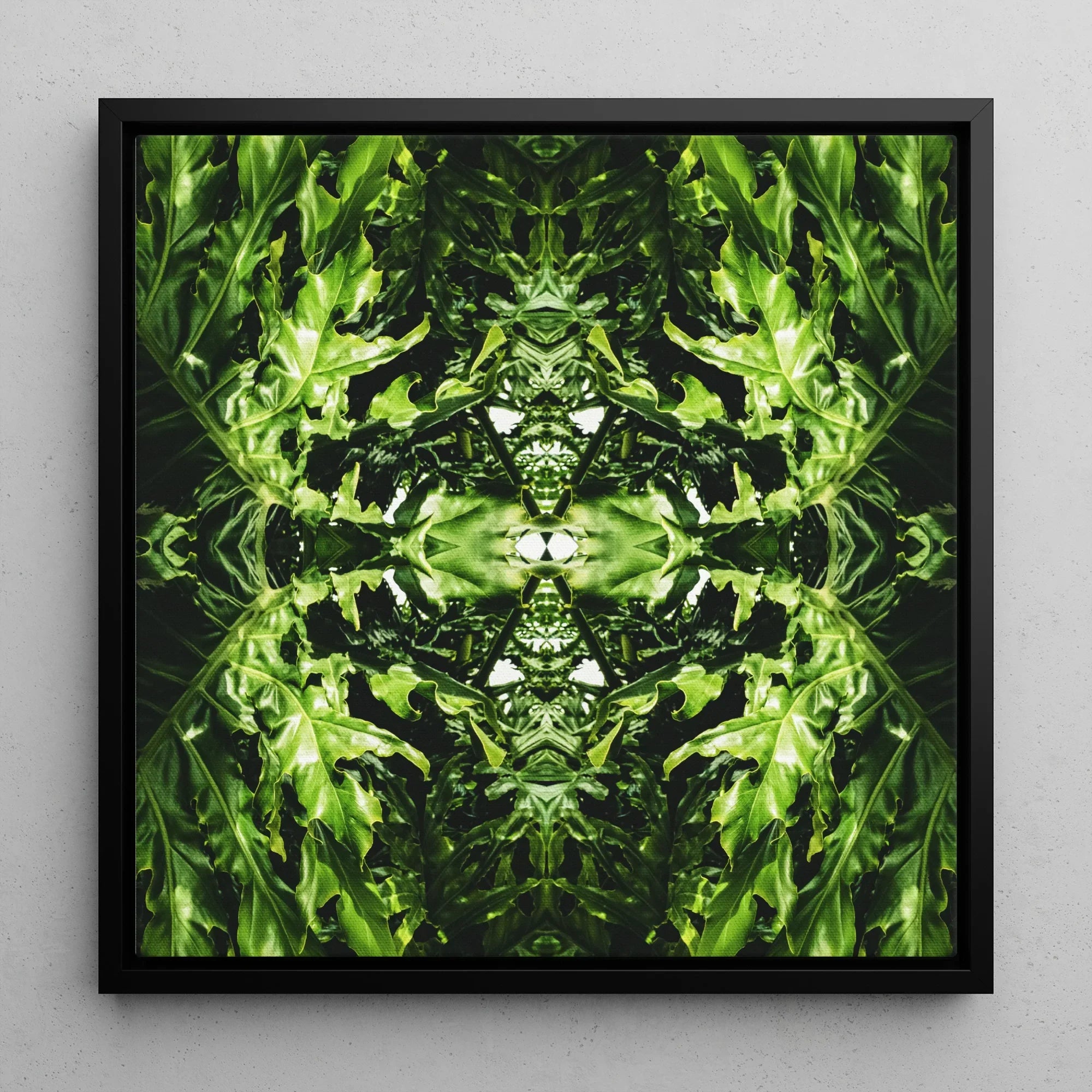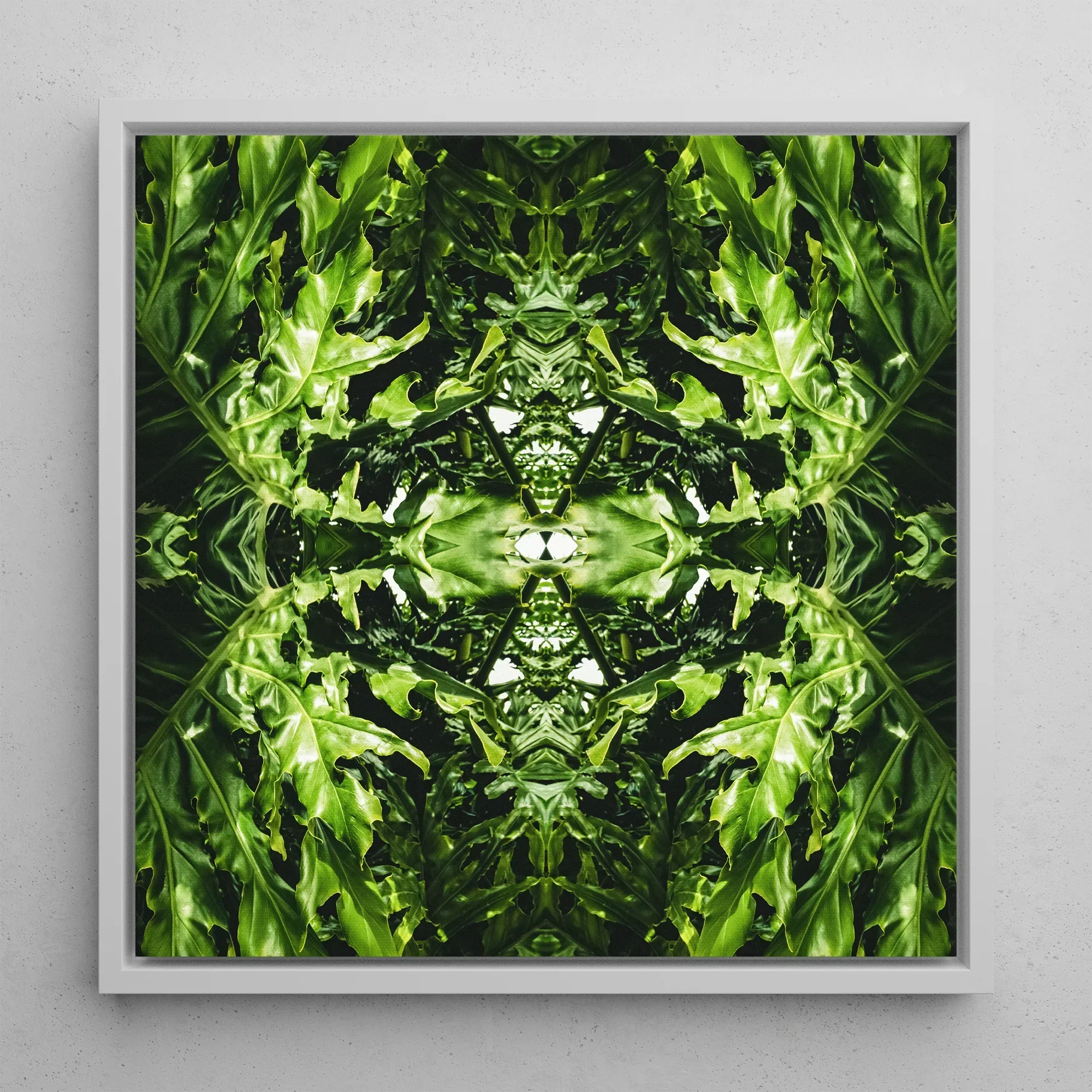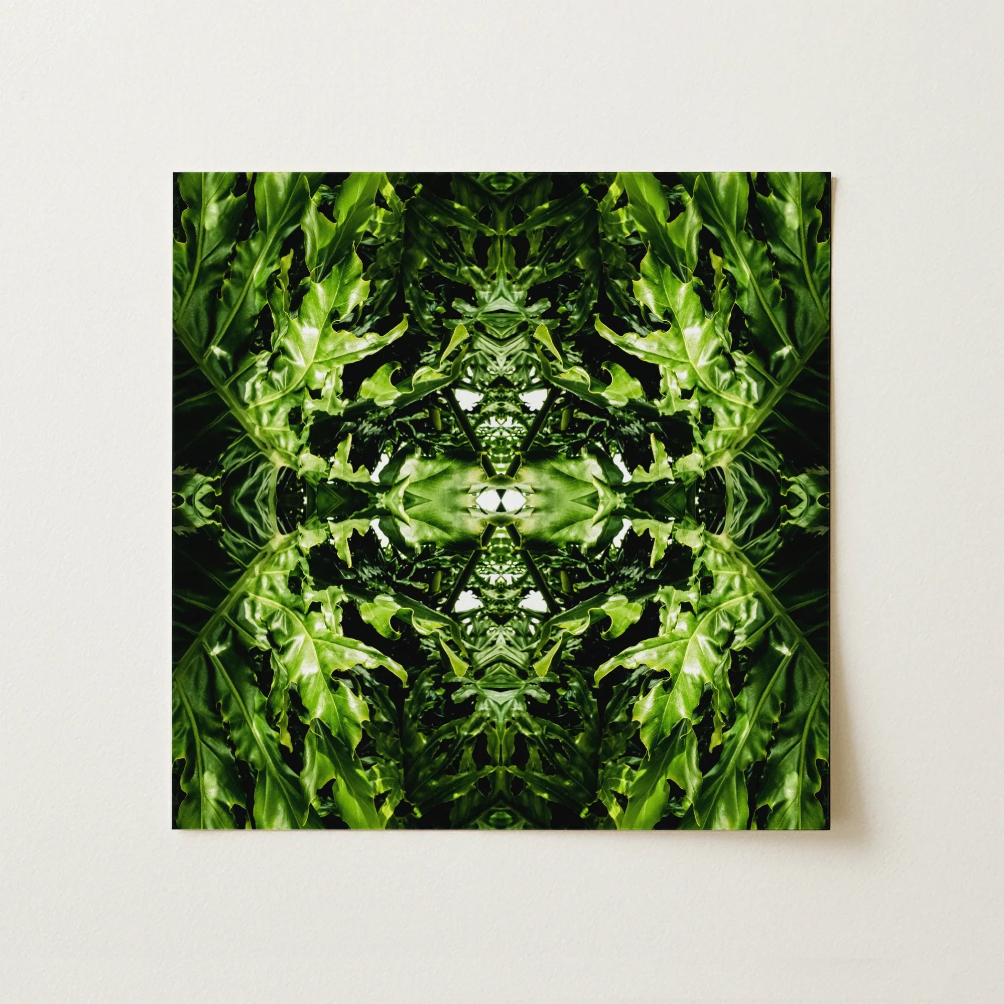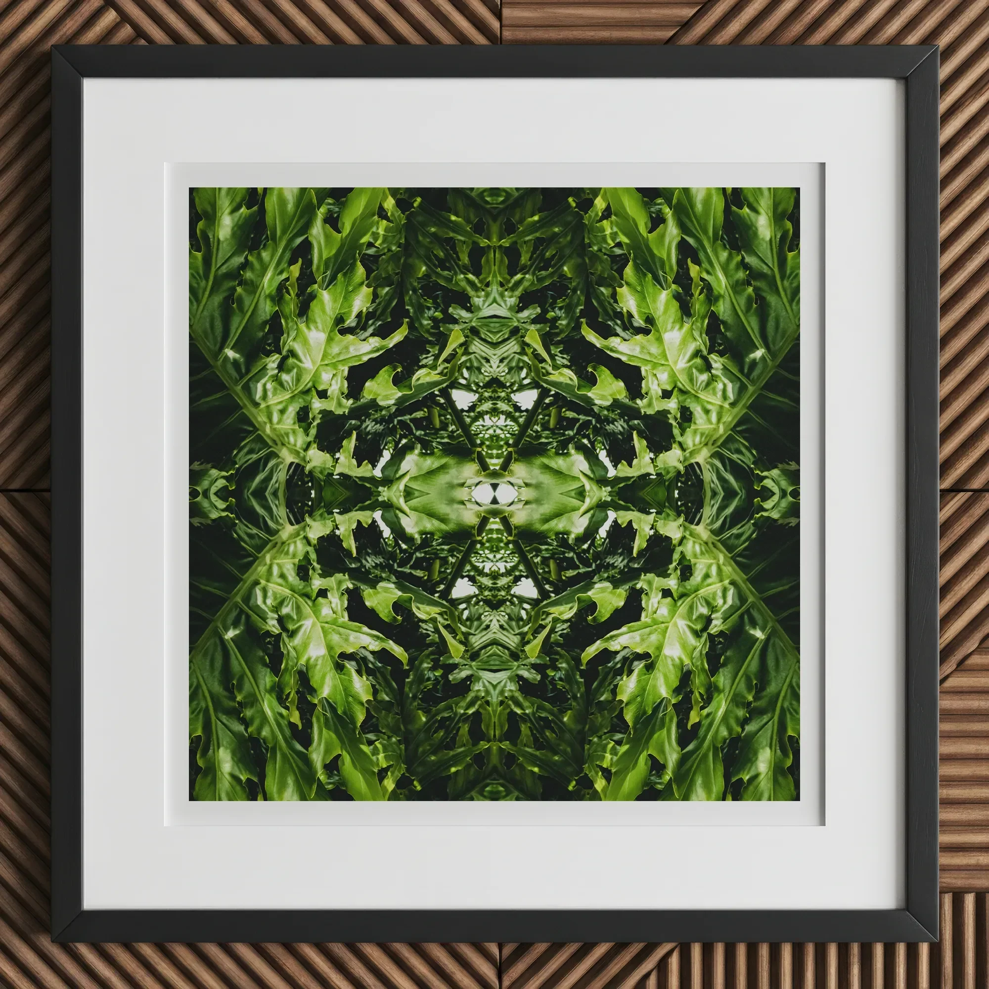 This hypnotic botanical print can transform your space into an alien emerald dreamscape. A mesmerizing artwork unfolding a lush labyrinth of mirrored foliage. Where digital manipulation meets chlorophyll-infused chaos. Jade fronds stretch and multiply, creating a symmetrical sanctuary that defies dimensional constraints.