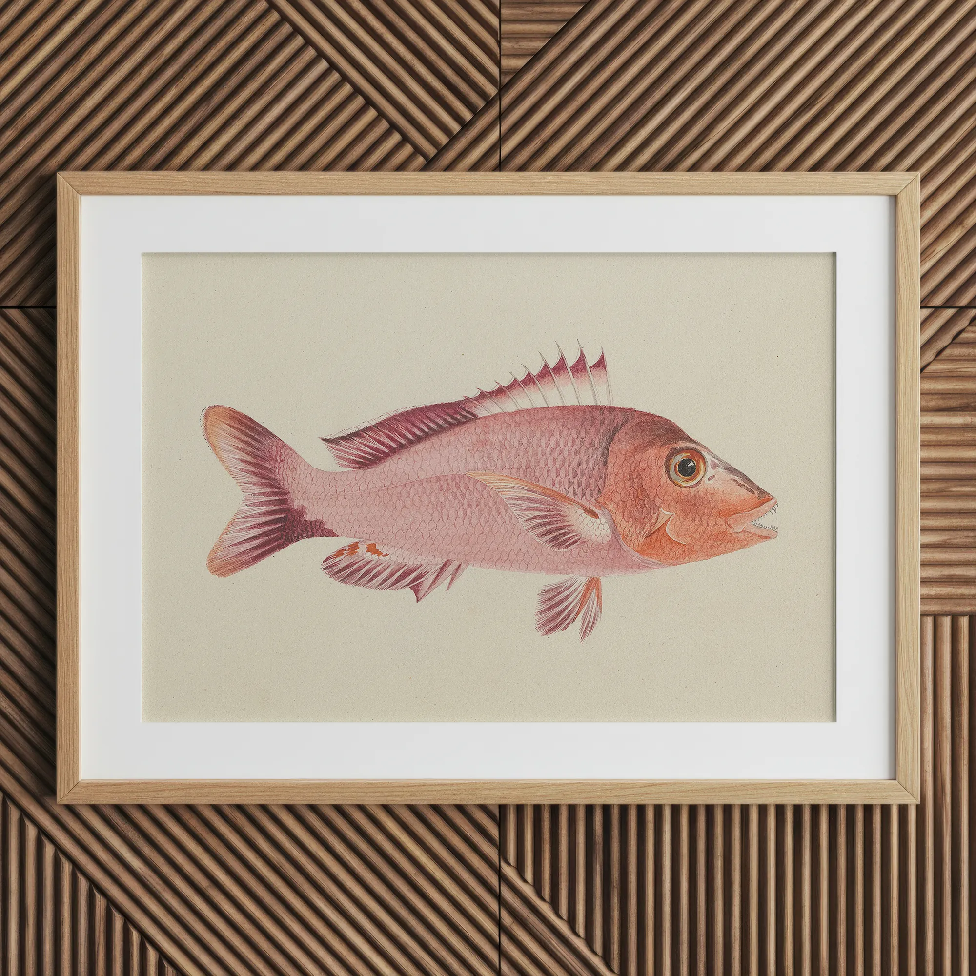 Bask in the rosy glow of Luigi Balugani's red snapper, a fine art print that swims through time from the 18th century. This Bologna-born prodigy's brush captures every scale and fin with scientific precision, transforming parchment into an aquatic portal. The fish's coral hues pop against the cream backdrop, its dorsal spines a crimson crown.