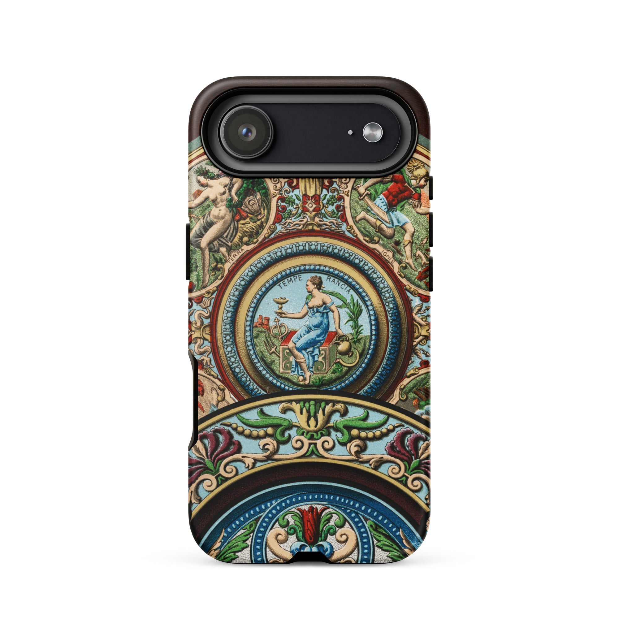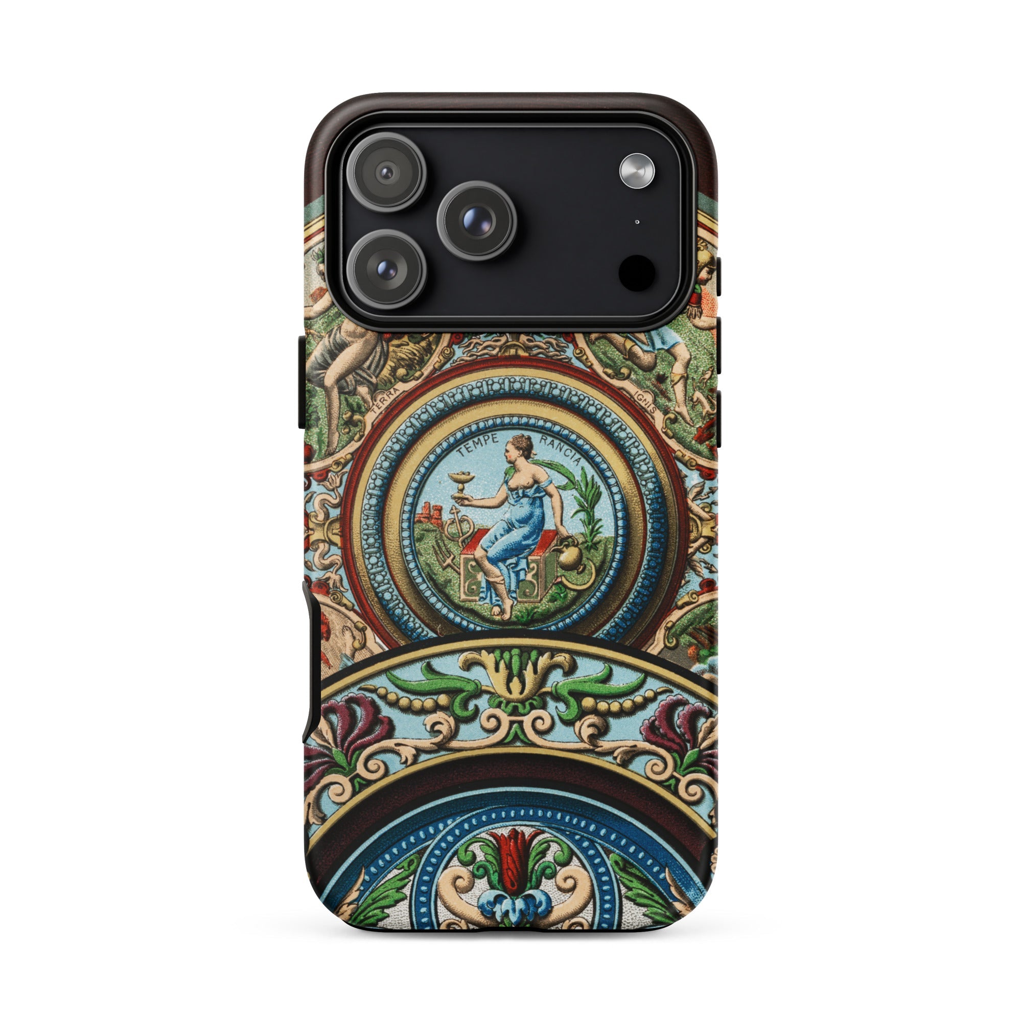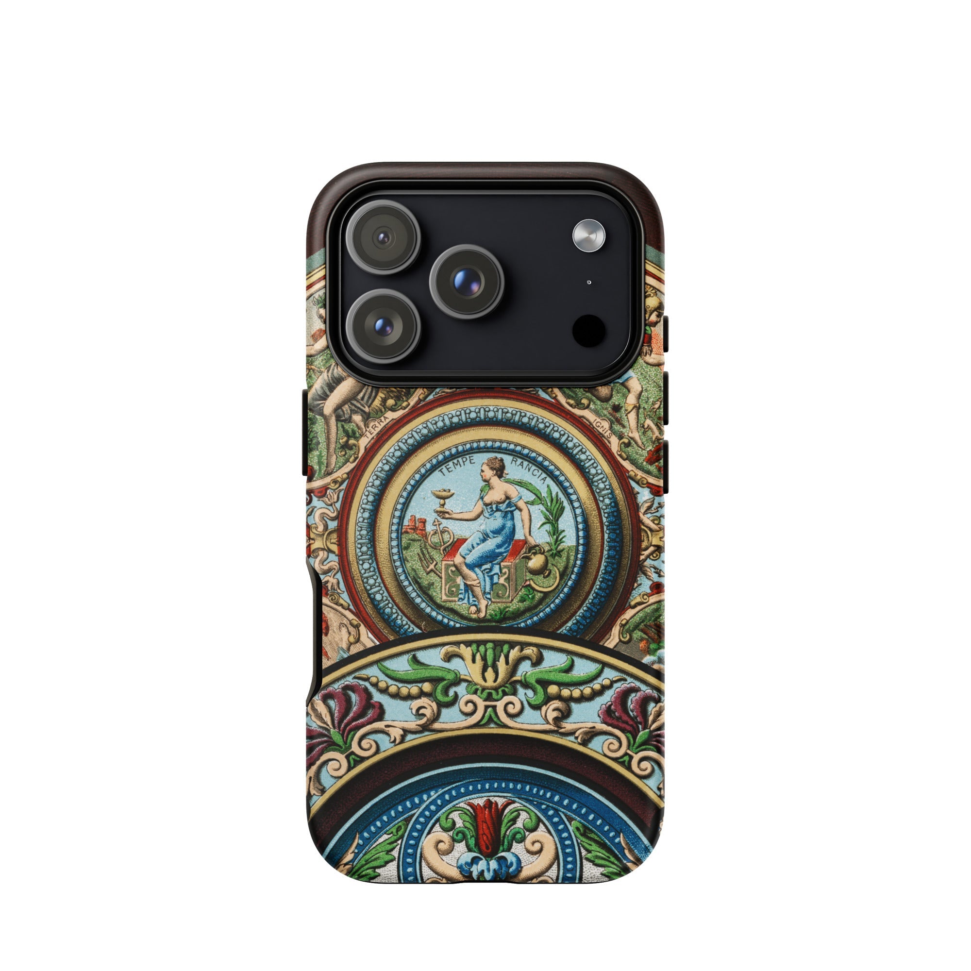 Cradle Renaissance opulence in your palm with this iPhone case. Auguste Racinet's ornamental masterpiece explodes in concentric circles of mythological splendor. Cerulean borders embrace a central medallion where Tempe Rancia reigns, a blue-draped nymph offering nature's bounty. Crimson-clad cherubs cavort in verdant vignettes, while golden scrollwork weaves through lush foliage. Emerald acanthus leaves unfurl beneath, framing a scarlet tulip motif.