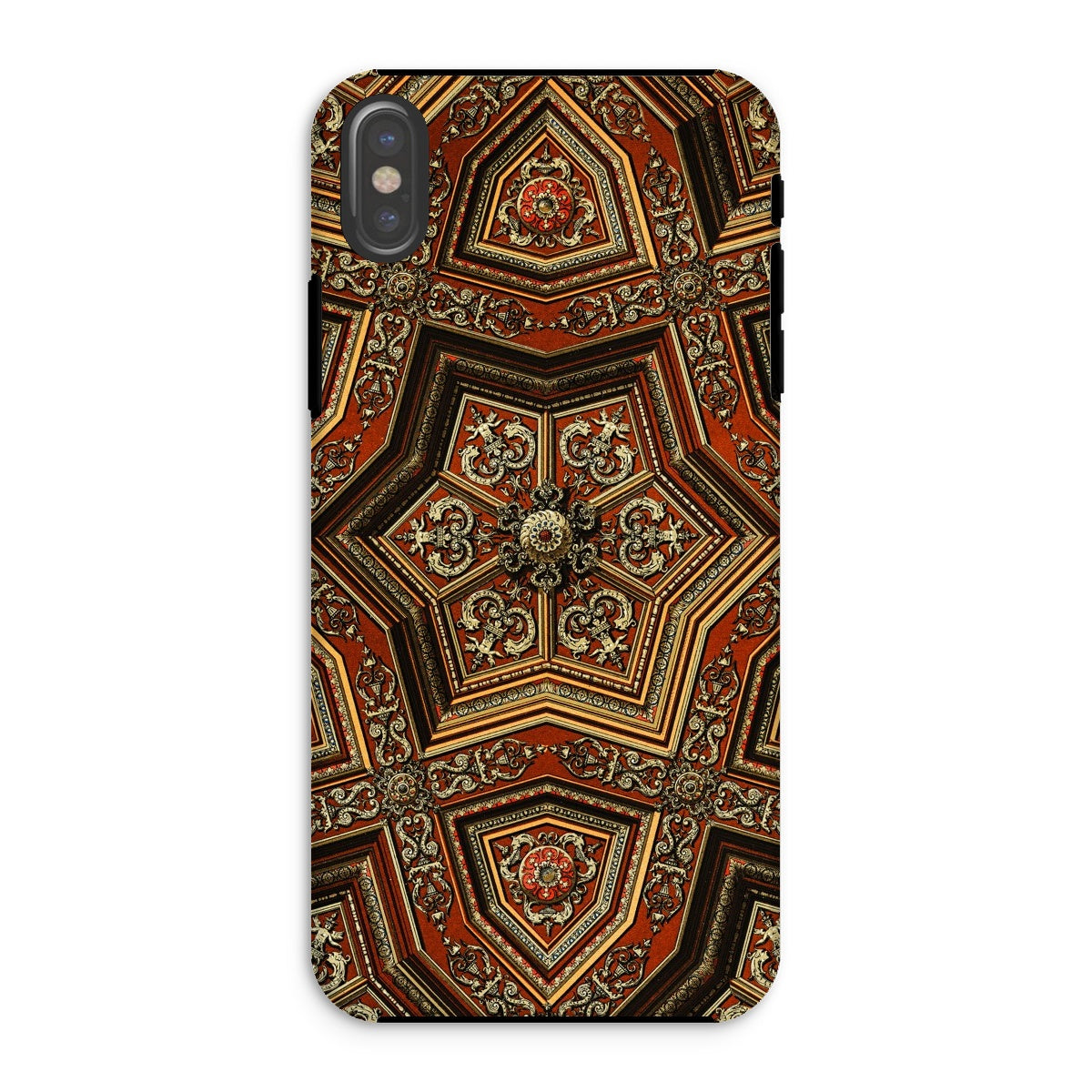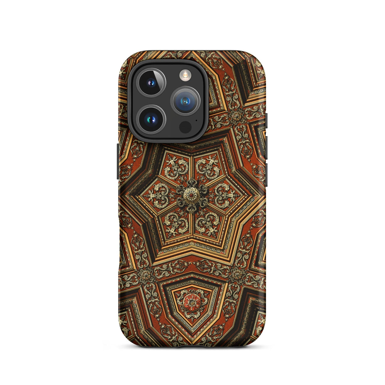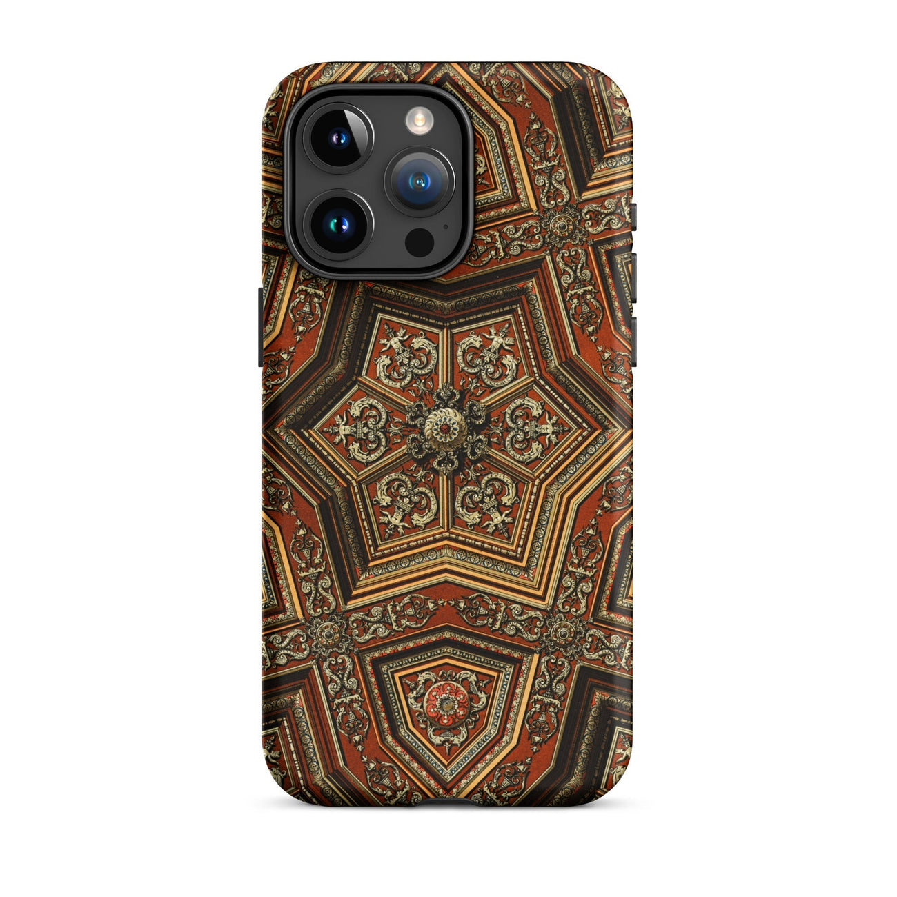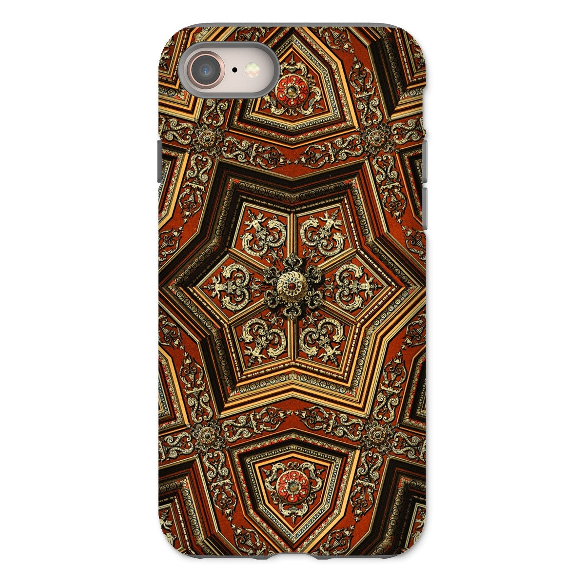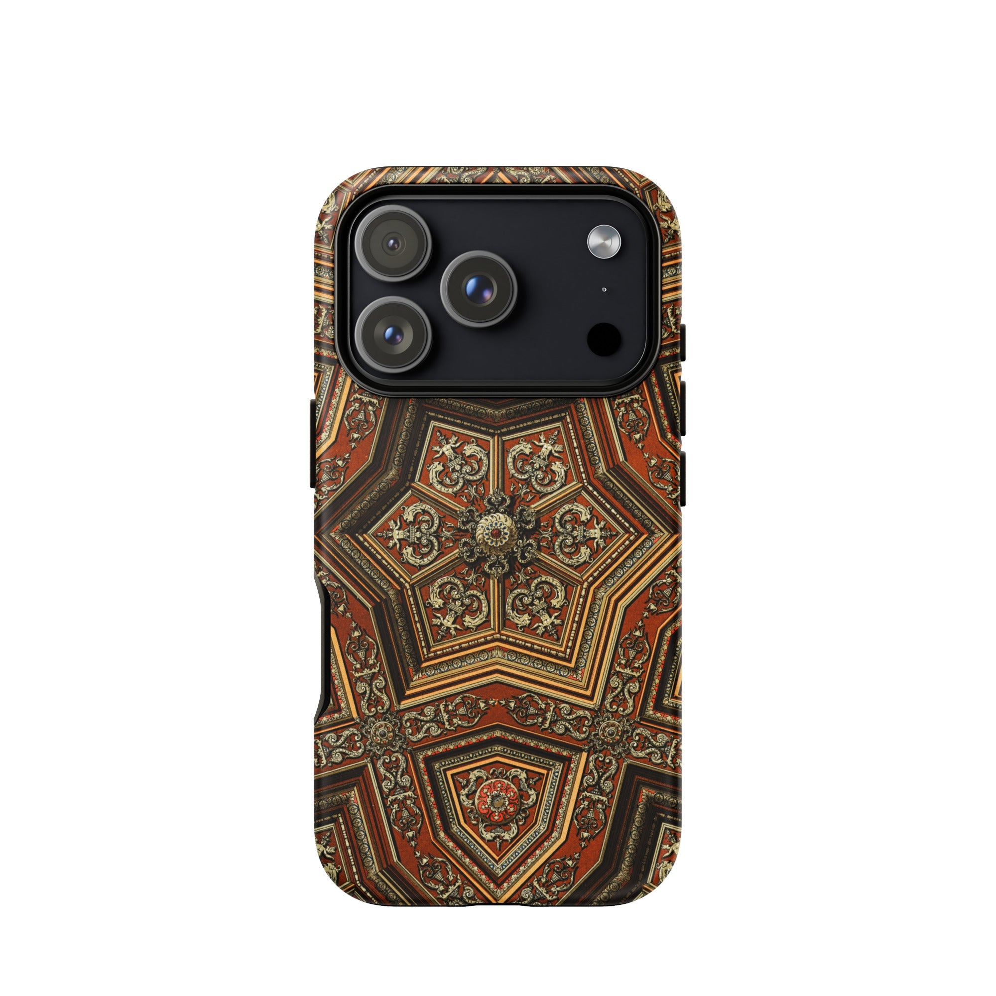 Cradle a mini-masterpiece of Renaissance extravagance in your palm. This iPhone case showcases Auguste Racinet's opulent artistry, transforming your device into a portal of 19th-century decorative brilliance. Featuring an intricate pentagonal mandala, where burnt sienna and gold leaf intertwine in baroque splendor. Your fingers will trace the ornate scrollwork, feeling the weight of history in every curve.