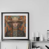 This gay redhead cowboy art print reclaims the American West, unearthing a history where androgyne buckaroos and dandy frontiersmen lived, loved, and thrived. Here, Reuben is both legend and love letter—his portrait a revolution of tenderness, his spirit woven into the golden age of the LGBTQ+ Western renaissance. A canvas where masculinity, beauty, and freedom ride side by side beneath a horizon painted in possibility.