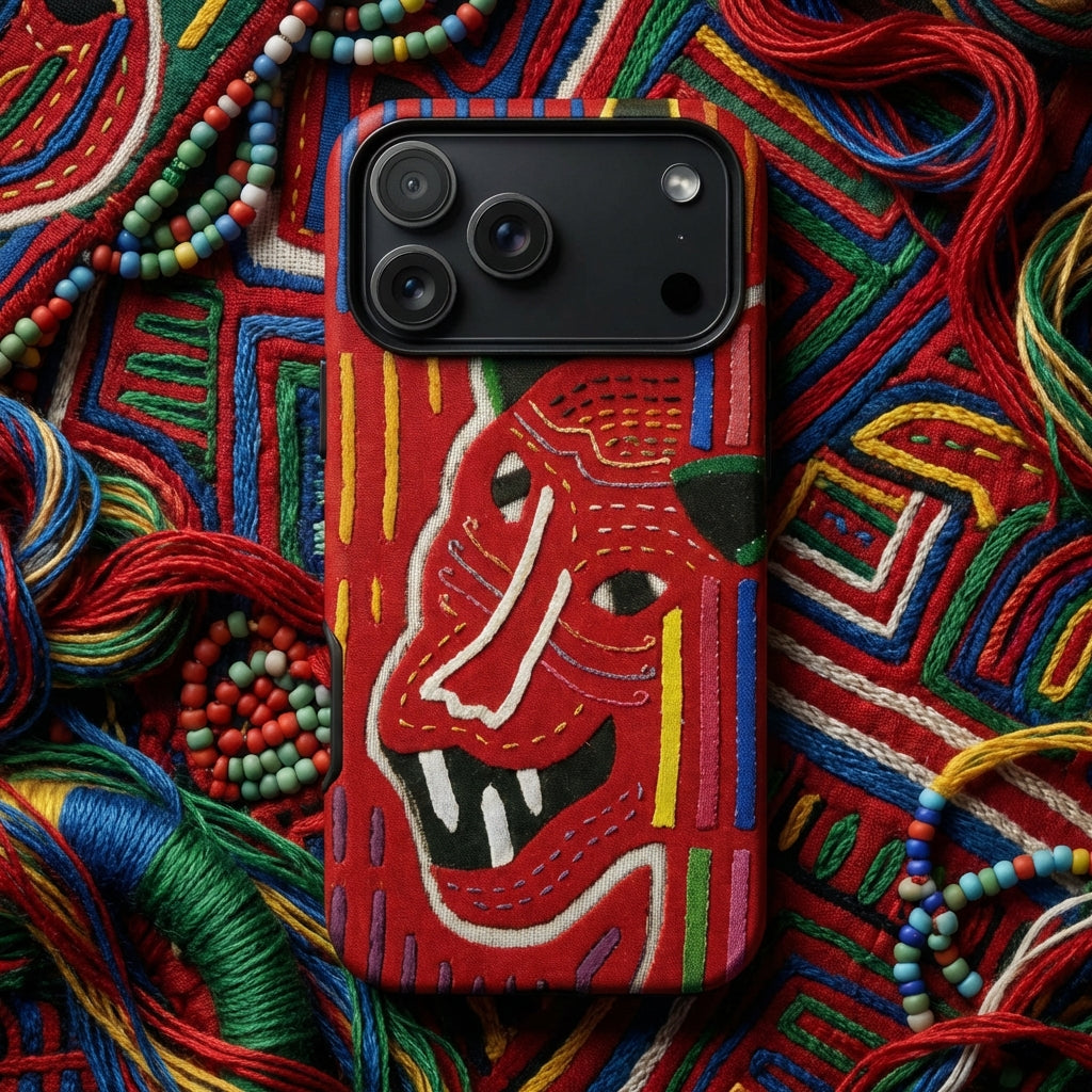 You'll be flaunting Panamanian artistry with this Mola-inspired iPhone case. A crimson feline face snarls fiercely, its fangs bared in a primal roar. Intricate stitching traces the beast's features, each line a testament to Kuna craftsmanship.