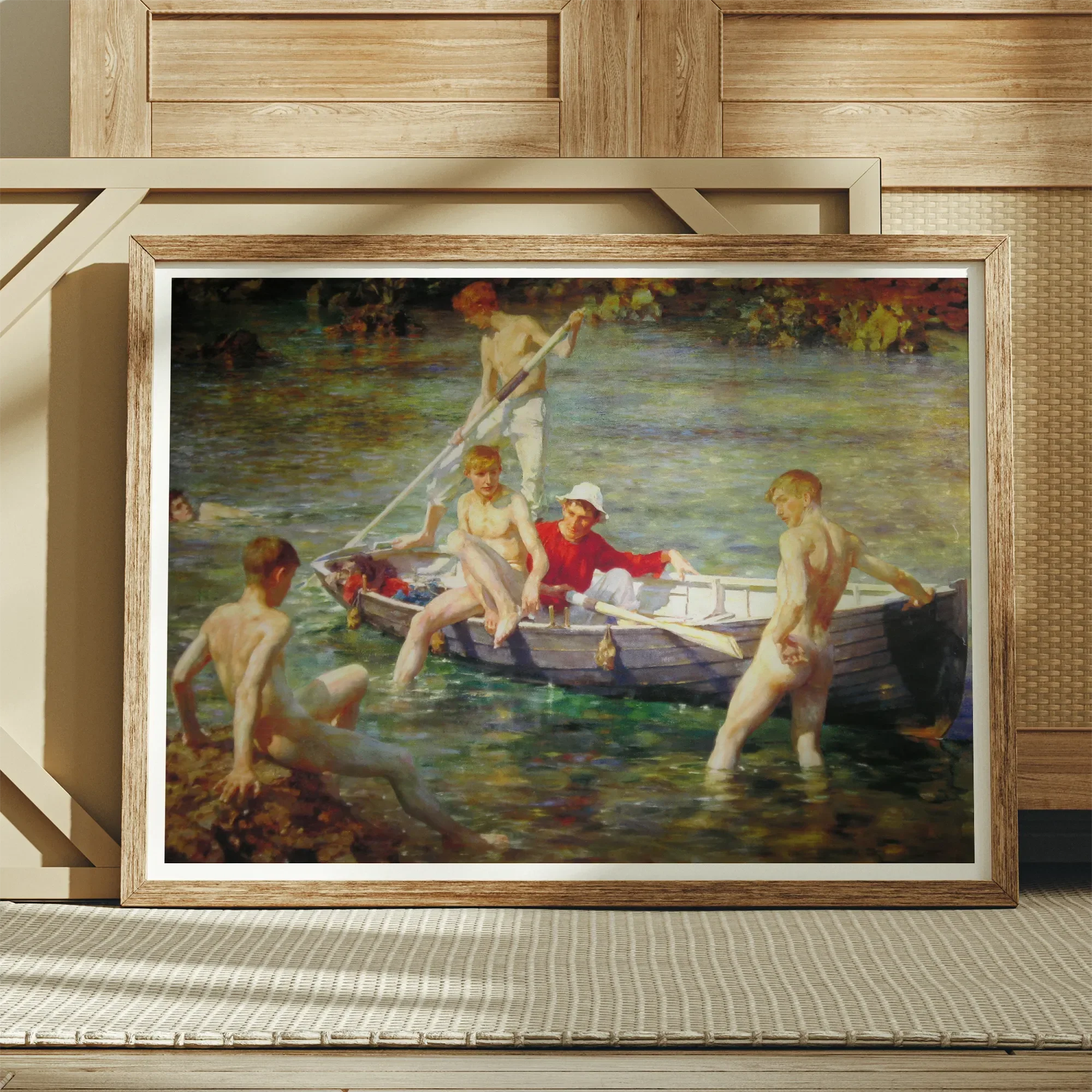 Brushwork dissolves edges into refracted light, binding Impressionist influence with the artist’s distinct devotion to maritime life. Each glisten of skin, each stroke of pigment, becomes a study in youth, desire, and the perpetual dialogue between sun, sea, and longing.