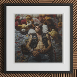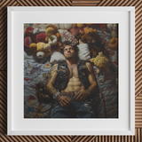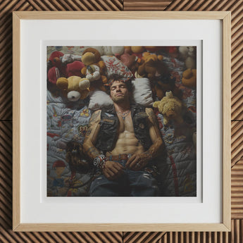 This lowbrow gay biker's inked with questionable tattoos, wearing a well-worn leather vest, lost in filthy dreams. Sunk amidst a collection of stuffed animals, he's suspended between vulnerability and hard-edged sensuality. Blending a punk-inspired queer aesthetic with a playful strangeness. The rich textures of his inked skin and the soft fuzz of the plush toys forging a tactile dialogue about the paradoxes of modern queer identity... anything could happen and probably will.